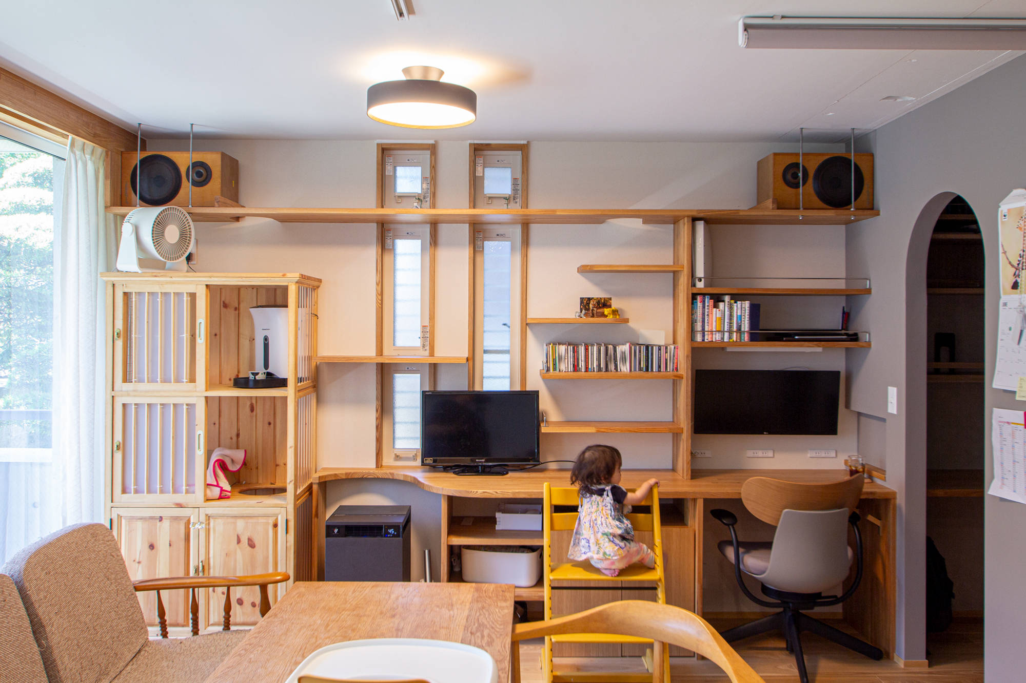 2つ目は、面積の小ささを感じさせない抜け感のある、場づくりです。3連の引き戸を開けると広いワンルームになり、北側窓から南側のバルコニーまで、光と風が抜けます。閉じた場所に設えた、リモートワークスペース、子供の勉強スペース、ウォークインクローゼットには、リビングや上段ベットから大小幾つものアーチ開口をつくり、閉塞感を無くしています。