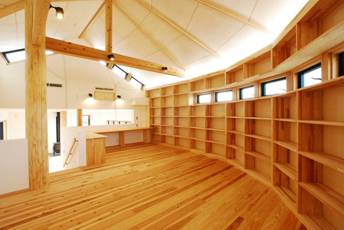 北に垂れ込んだ寄株屋根の小屋裏を有効利用し、多目的な書斎...