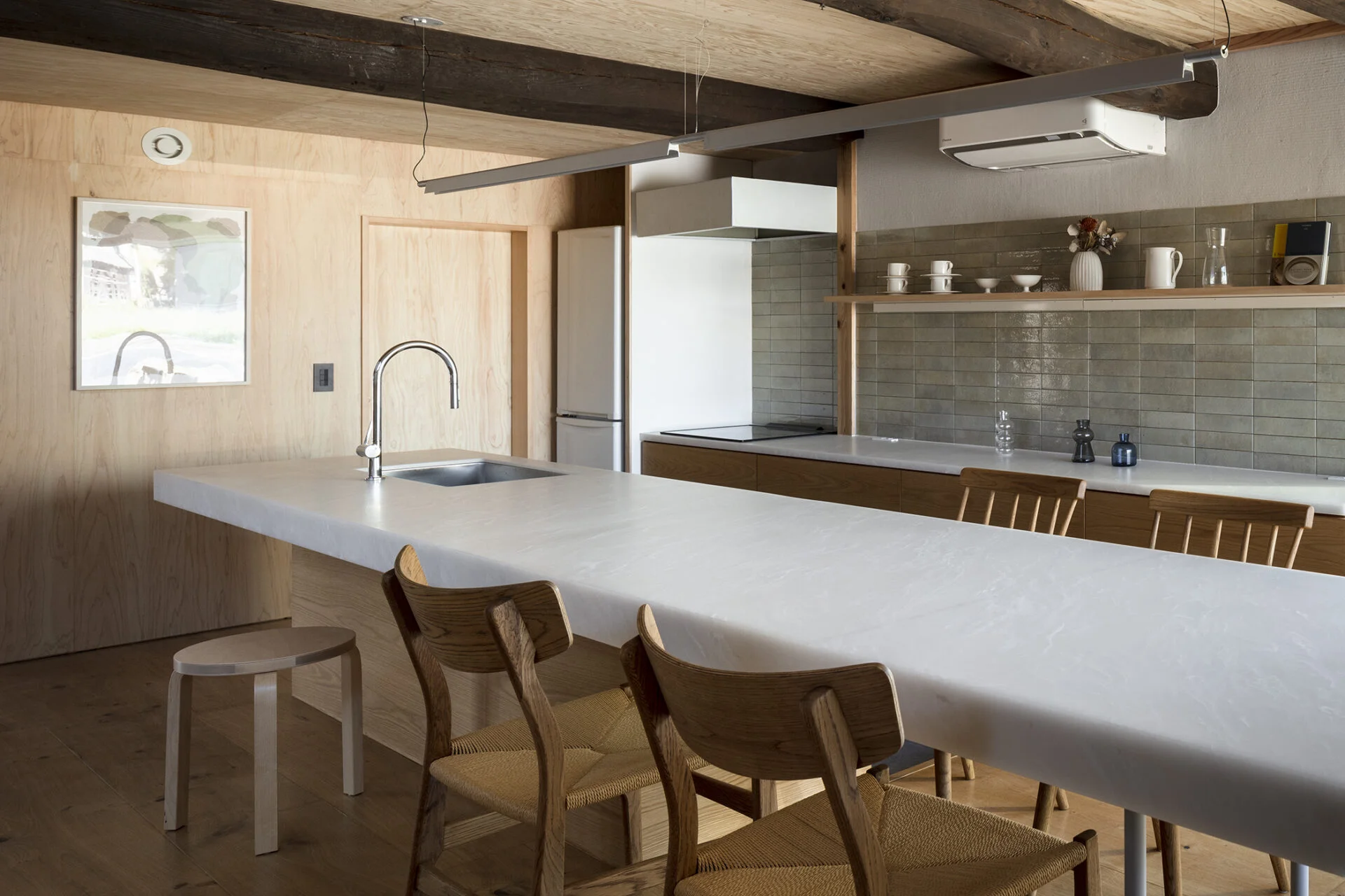 また同時にその30cmほどある丸太の梁と調和するように、木目の強い合板や、大ぶりの家具、幅広なフローリングなどを用い、既存の荒々しい梁に対して、新築部分も調和させるような設計とした。