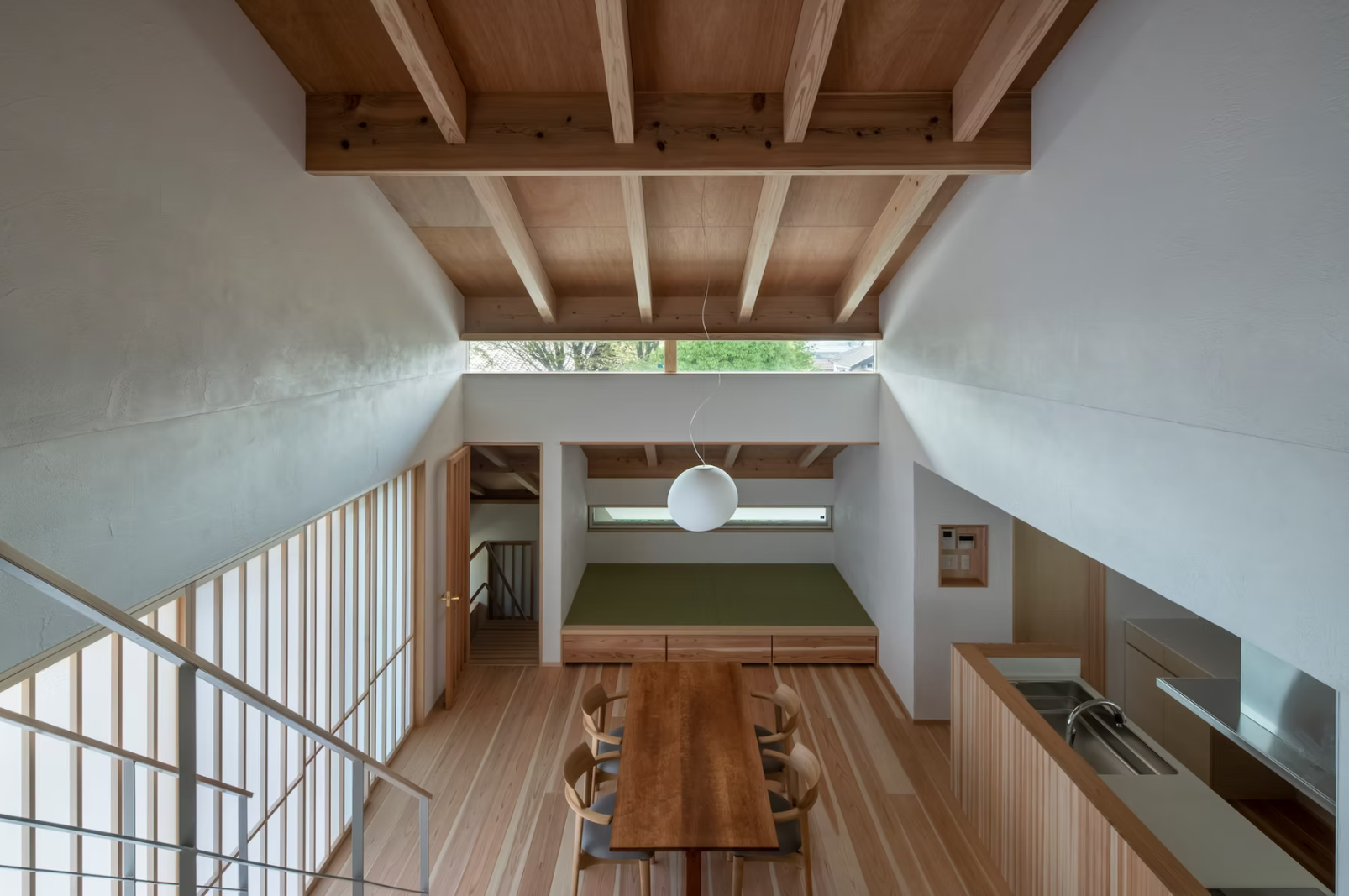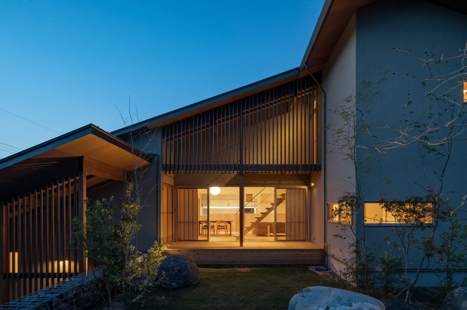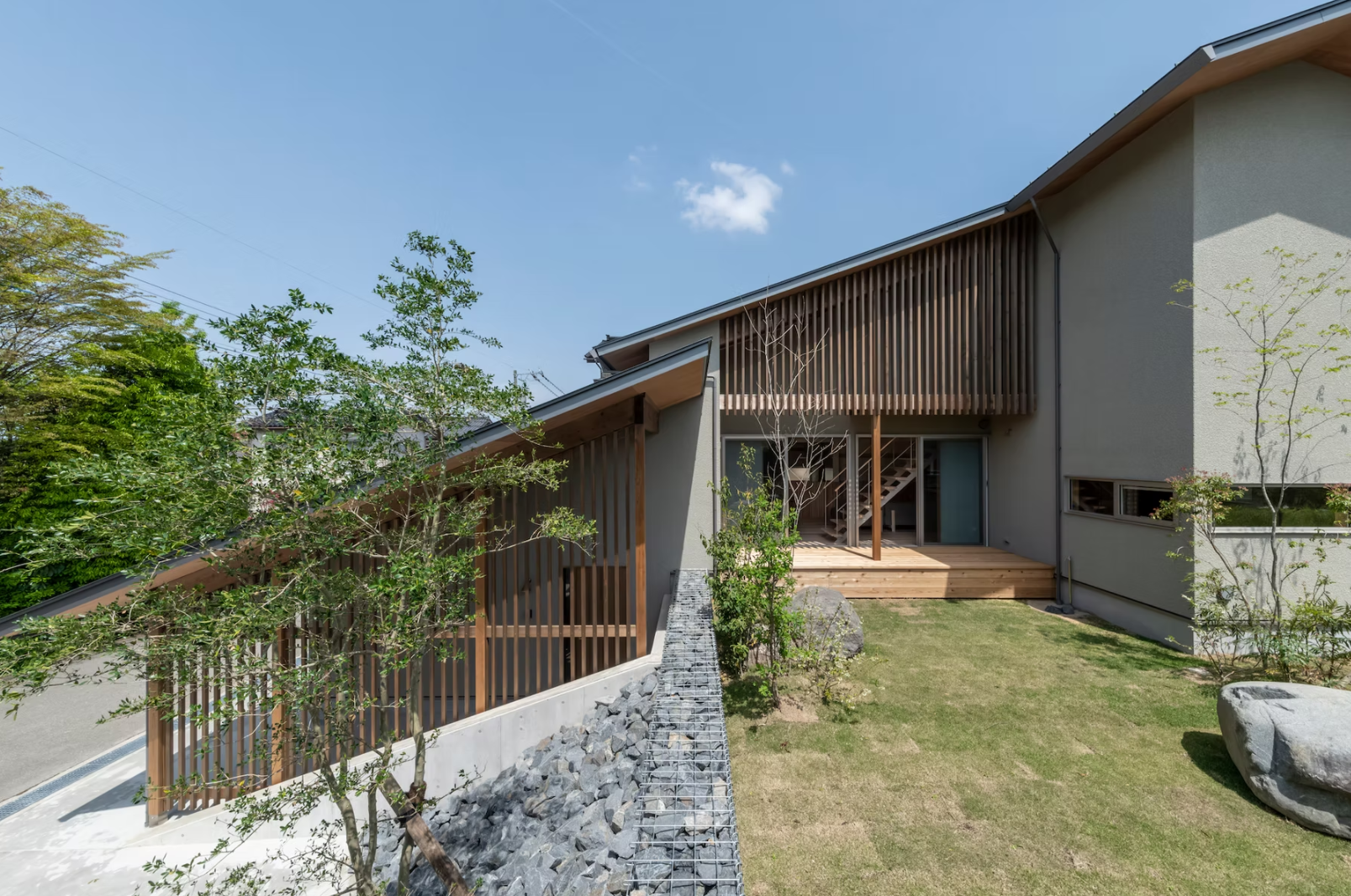 高低差がある敷地に対し、周囲の建物の多くは擁壁によりその高低差を処理し、その上に建物を建てています。擁壁による圧迫感を軽減し、緩やかなまちとのつながりを持つ住宅とするため、その高低差を斜面によって処理し、その斜面に沿って2枚の屋根をかけるような住宅を計画しました。遠景には呉羽山を、近景には周囲の庭園の植栽などを望むことができる立地であったため、プライバシーを確保しながら、それらの借景を日常生活の中に取り込めるような住まいとし、日常的に階段を上下する動線の中で、高揚感や季節感が感じられるよう、窓の位置や形状を工夫しています。