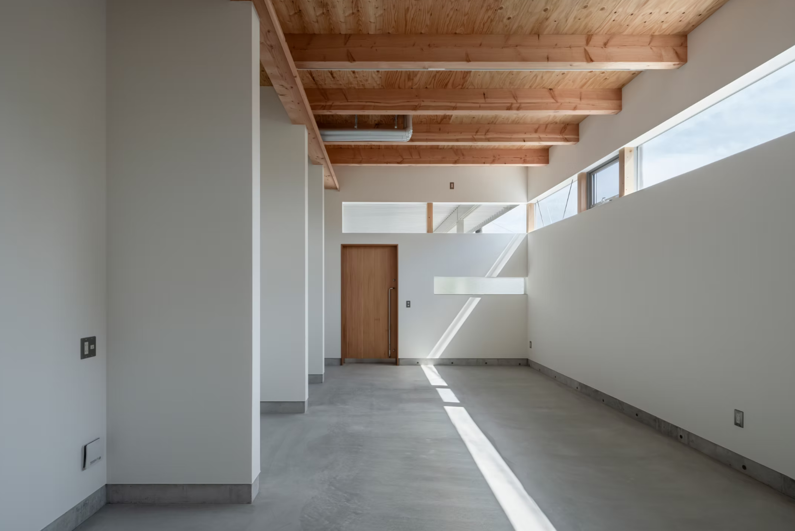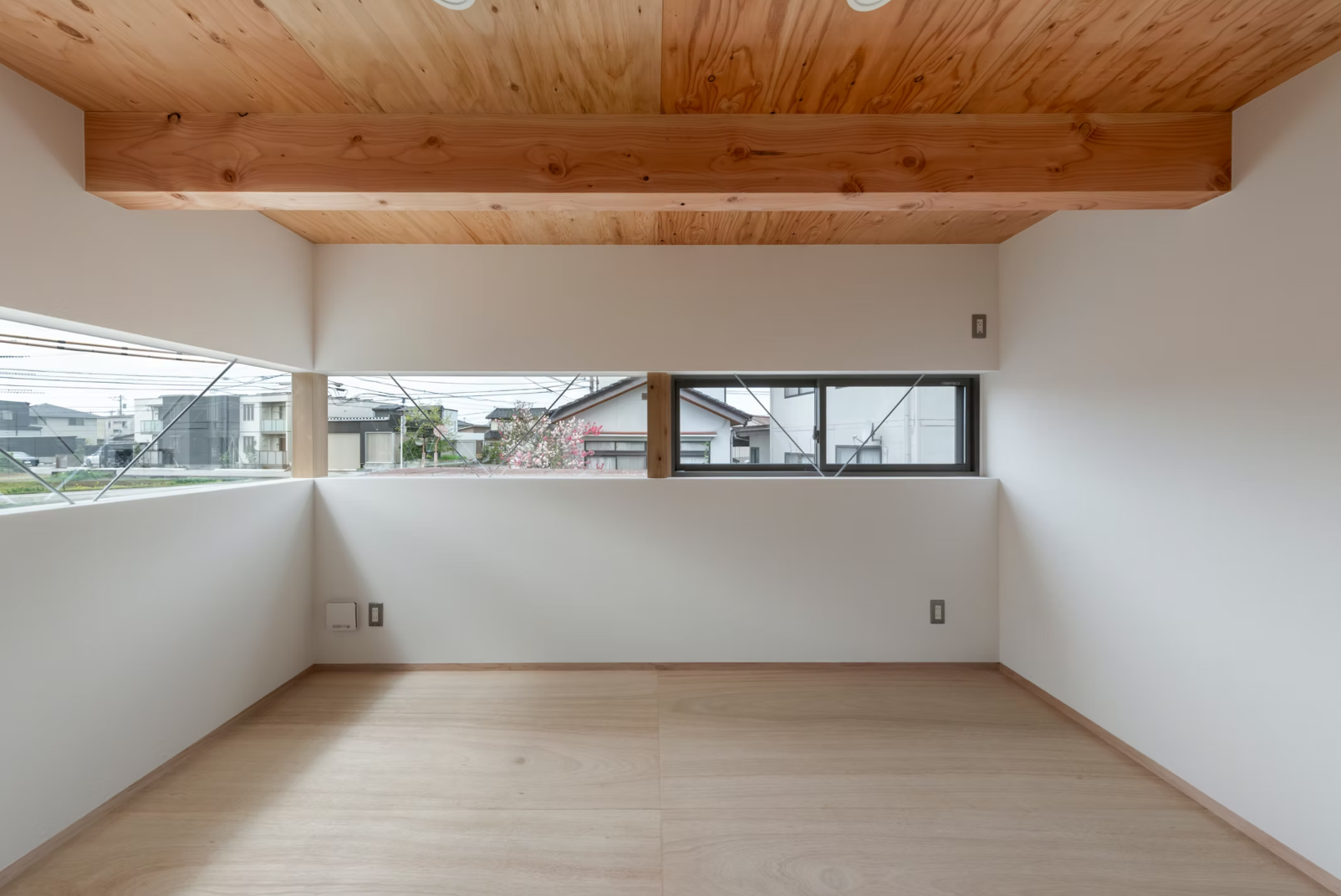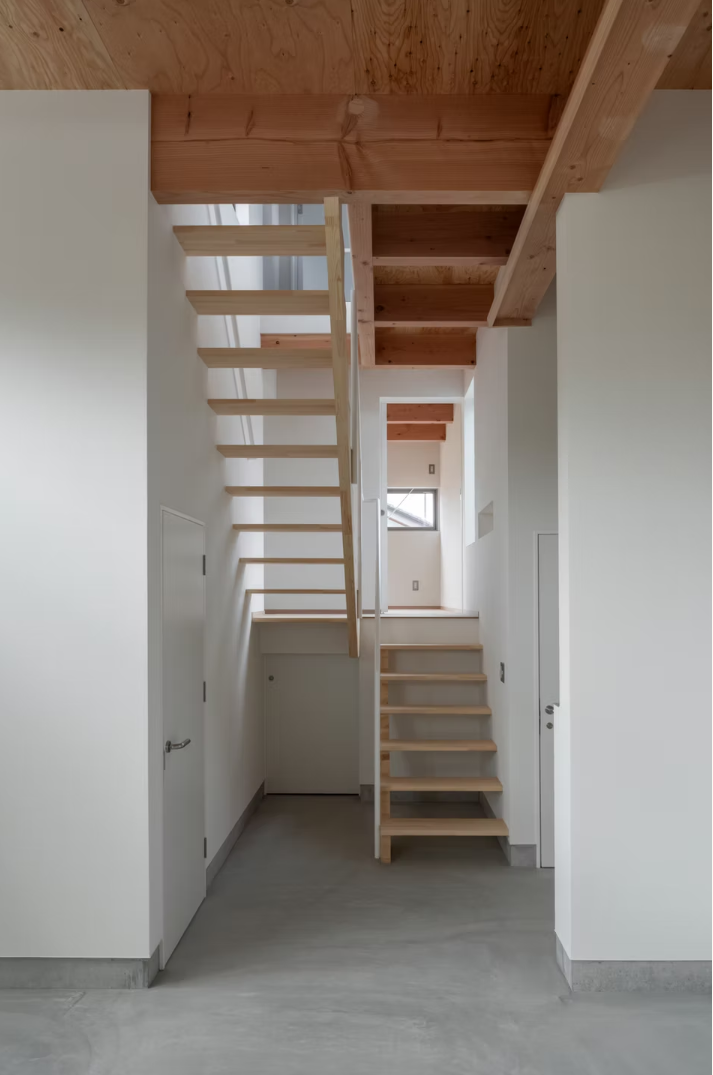 建物はスキップフロア構成とし、仕事空間と生活空間を緩やかに分節。ハイサイドライトから差し込む自然光が仕事場をやわらかく照らし、明るく開放感のある環境を生み出しています。 生活スペースでは、外部からの視線に配慮しながら、窓やバルコニーの位置を丁寧に計画することで視線の抜けを生み出し、限られたスペースの中でも開放感を感じられる空間としています。
