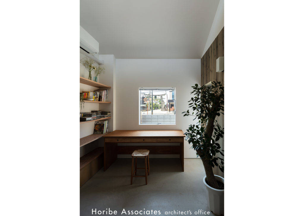 敷地は古い日本家屋の多く残る神社への参道沿い。新しい住まいは母屋との関係と街並みとの調和を考え、3分割したボリュームを雁行して配置し、切妻の立面が3つ連なる平屋建ての住まいとしました。