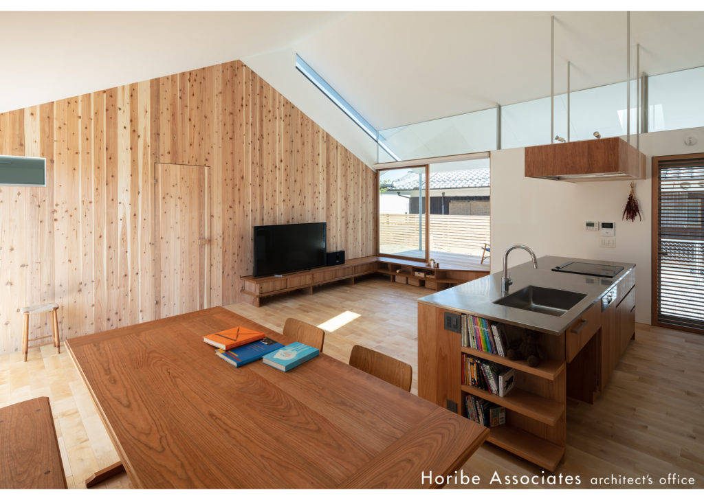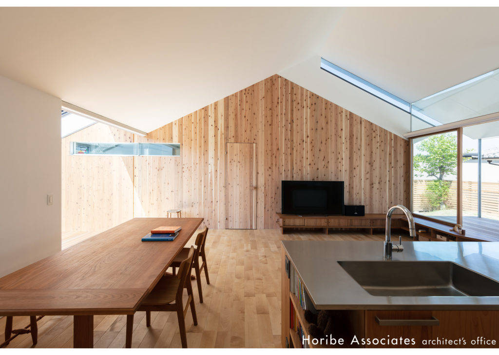平面を雁行させることで生まれた切妻勾配のスリットは、リビングルームへの採光をもたらすだけでなく、周辺街区のアイデンティティーを視覚化させ、地域社会への帰属意識の向上に寄与しています。