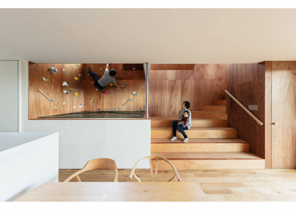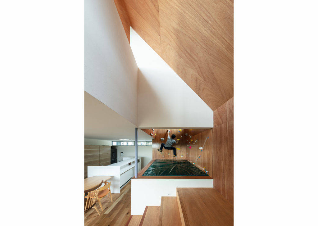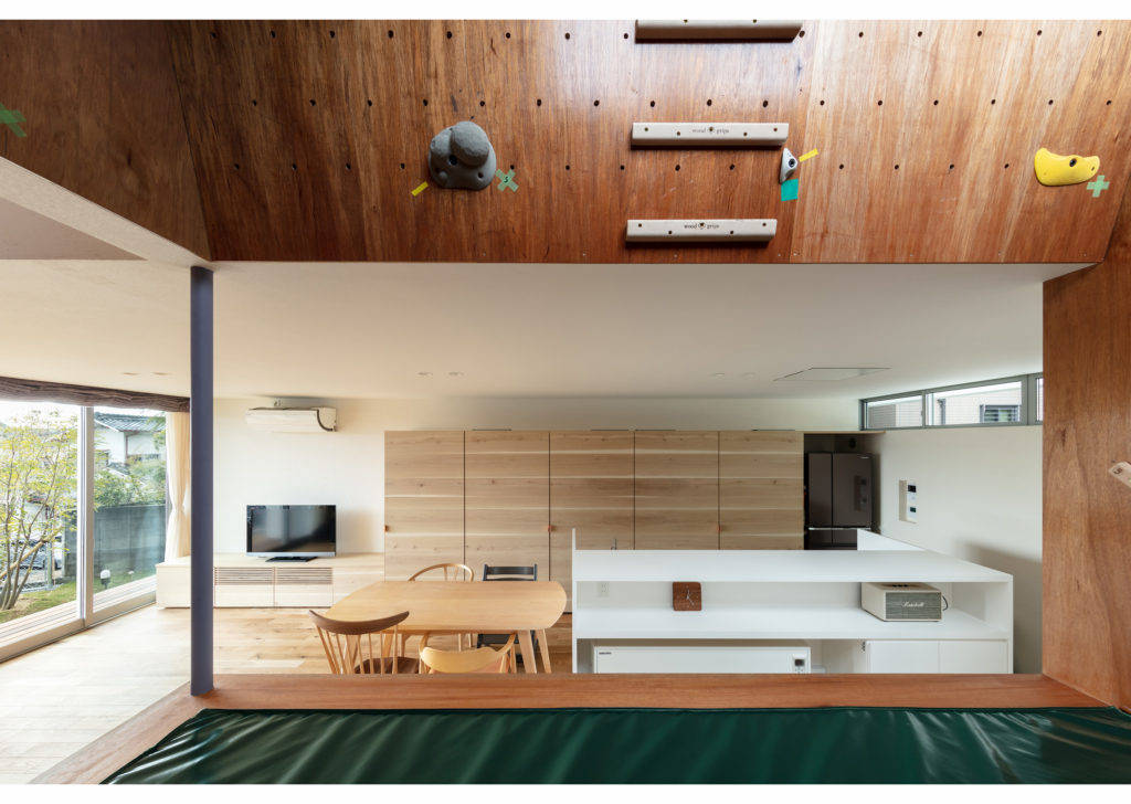 リビングルームに隣接するボルダリングルームはトレーニングを楽しむ人と、それを眺めるご家族が同じ空間で団らんを楽しむことができます。