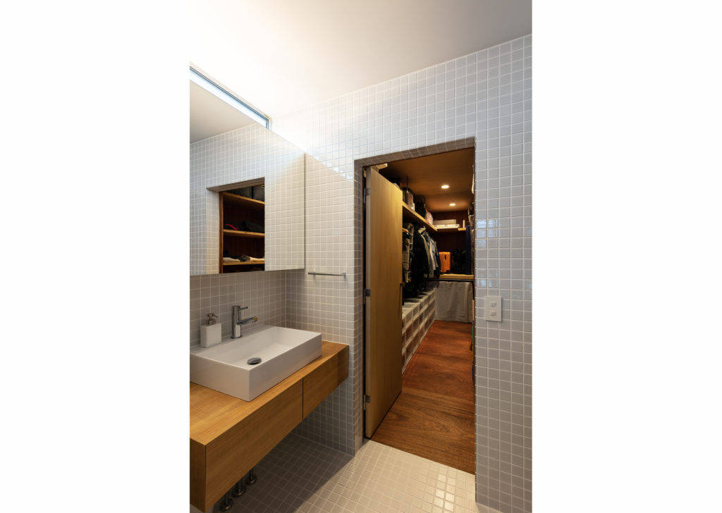 キッチン収納の一部扉は奥の水廻りへ続く秘密の扉となっており、生活感が出過ぎない工夫をしています。