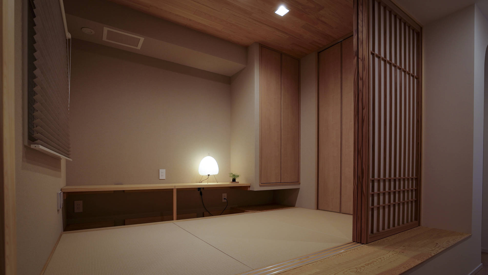 また、玄関横の和室はお客様を迎える場としても、自分たちが落ち着ける空間としても使えるように計画。奥の板間には脚を取り付けてカウンターとして使用できるようにし、足を入れてくつろげる仕様としました。
