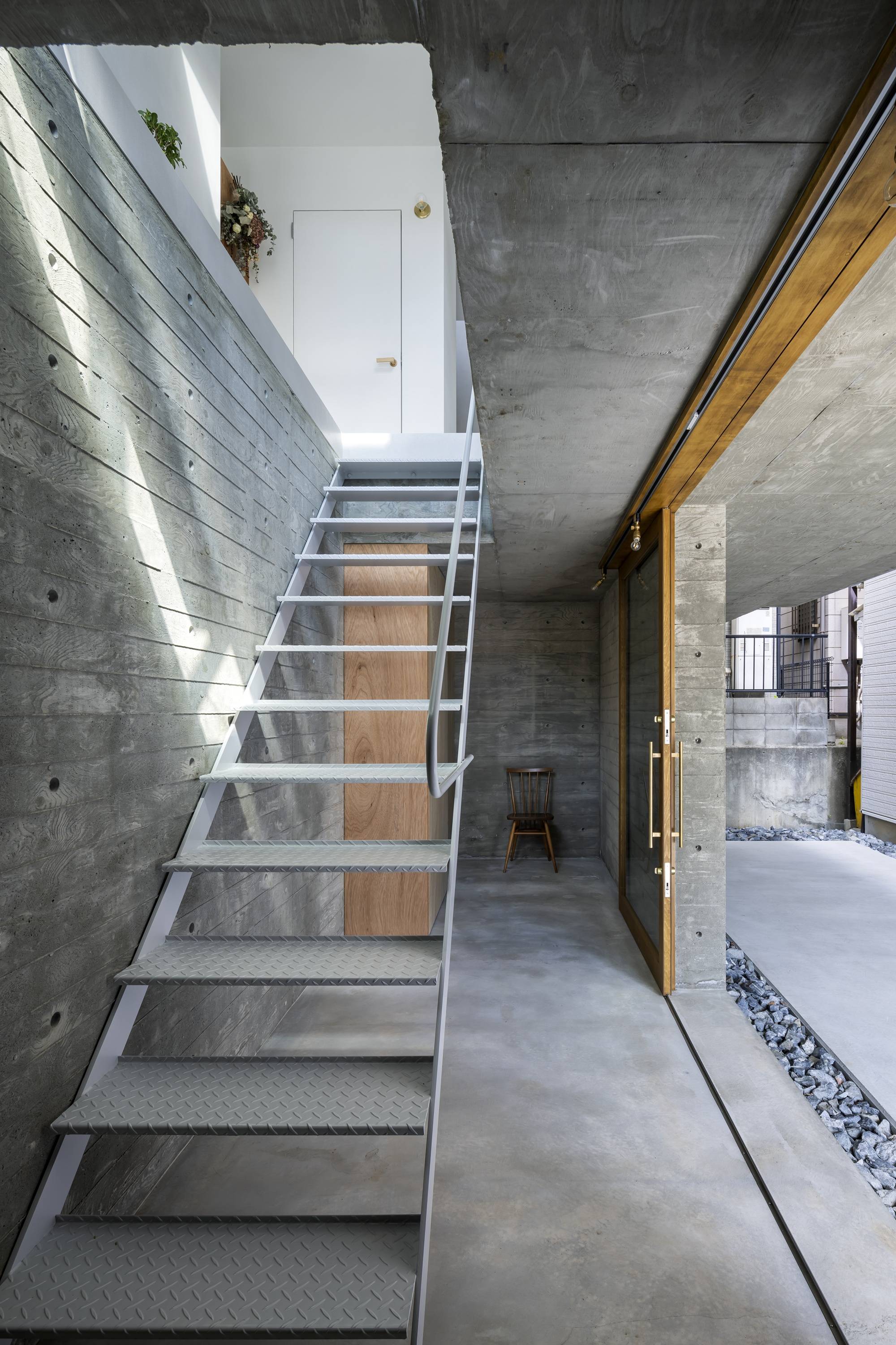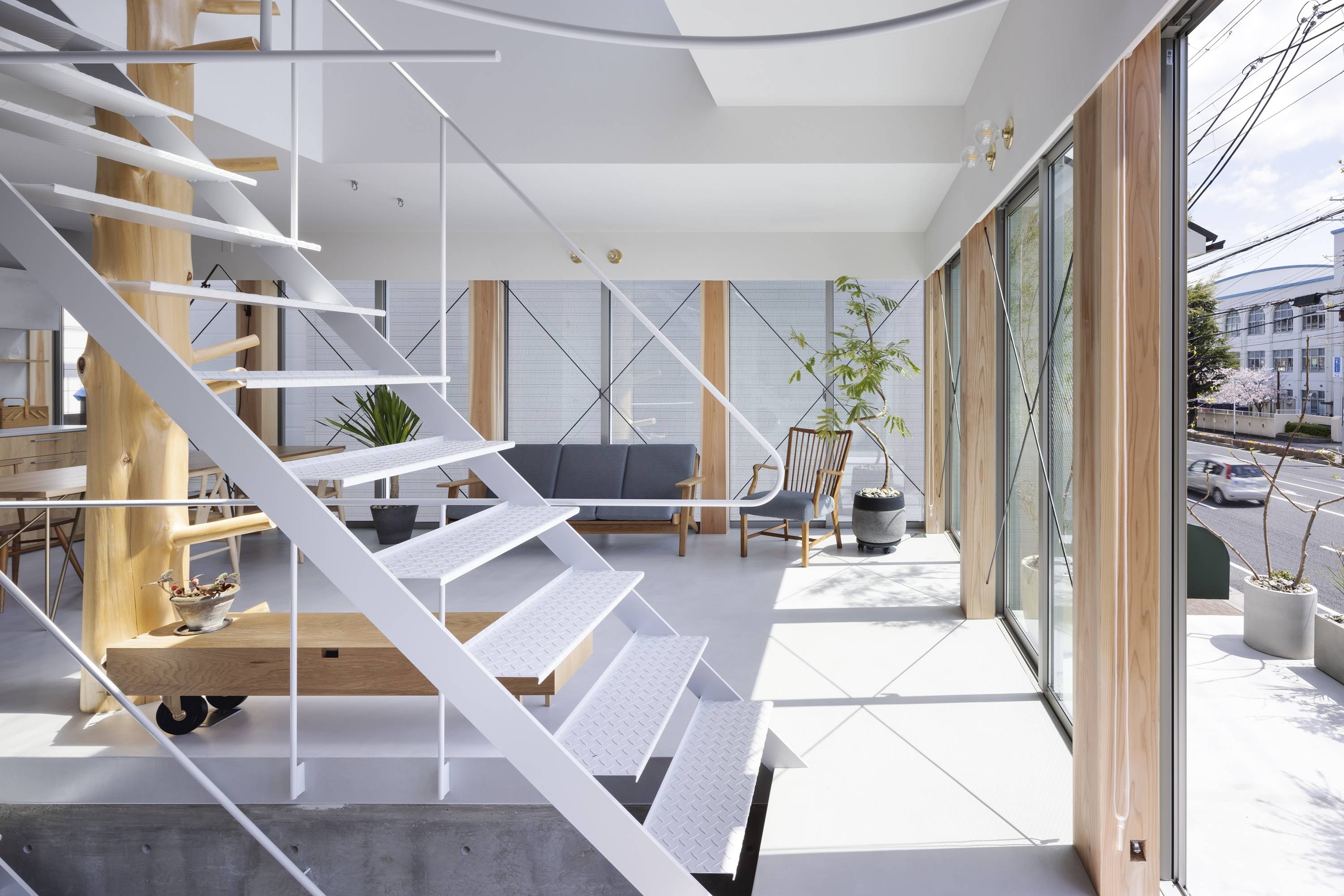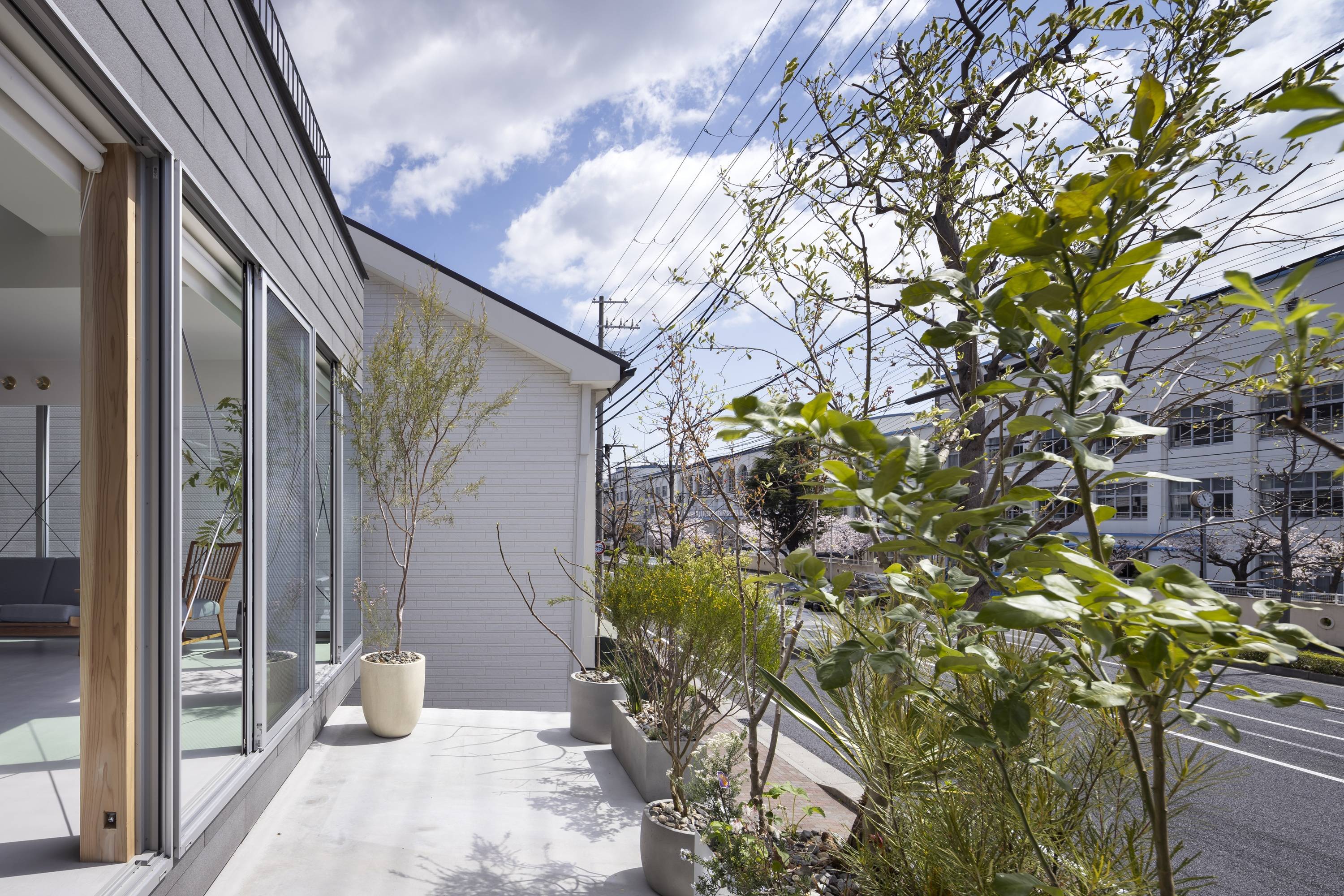 2階の南側、東側に大きく開口をとり、光や風を内部に十分取り入れながらも、「余白」が街との緩衝帯となり、両者を緩やかに関係づける。敷地は準防火地域内であるため、内外の境界には燃え代を含む化粧柱を配しているが、その比較的広い柱幅を利用し、サッシの枠、縦框が内部からは見えない納まりとした。さらに耐力壁には鉄筋ブレースを採用、内装はモルタル系の左官仕上げとする等、内外を差異化させる要素を可能な限り削ぎ落し、街、余白、内部がシームレスな関係となることを目指した。