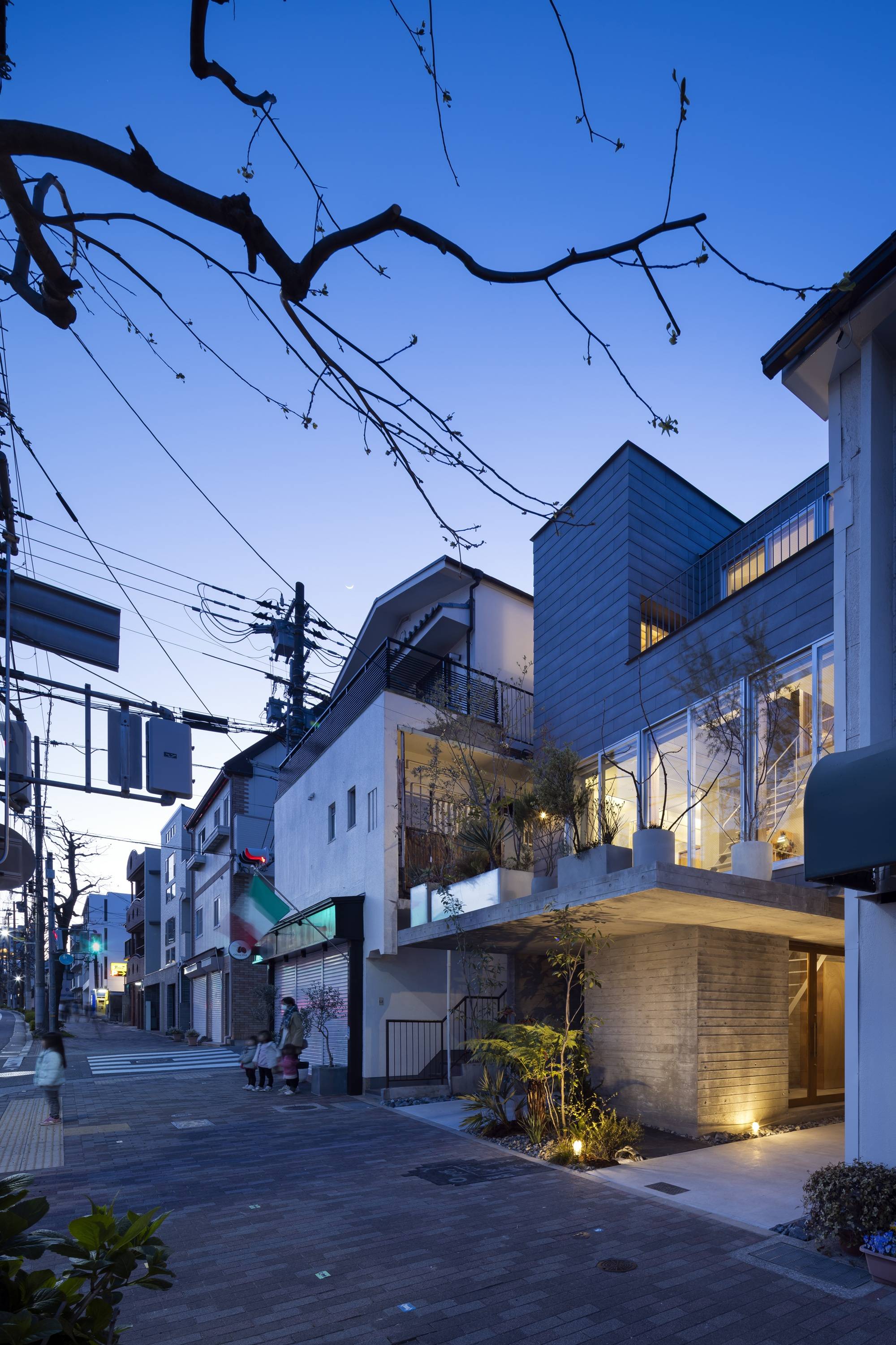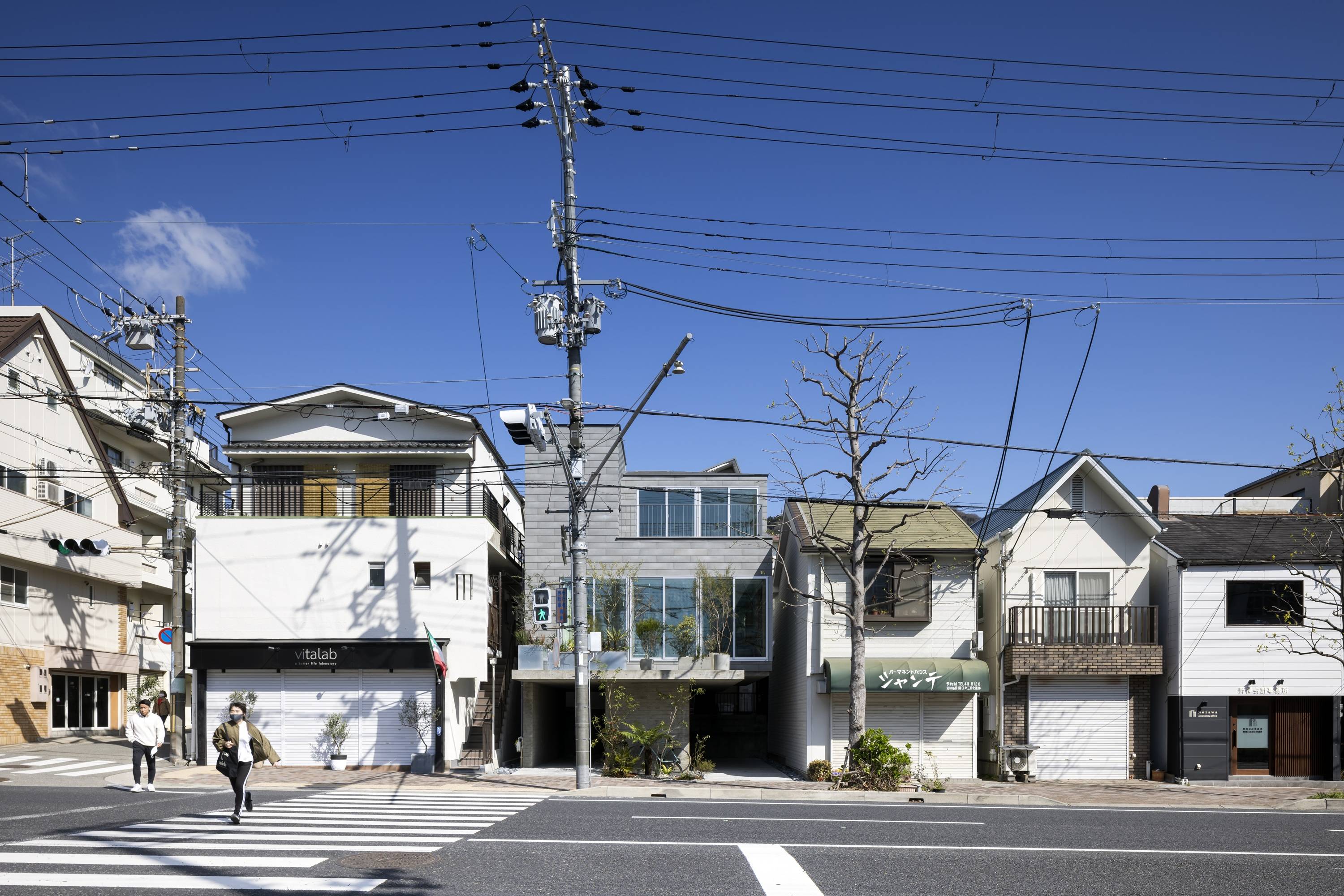街路樹と店舗の軒先が単調に連続している街並みの中に住宅を計画するにあたり、軒のあり方、道路と歩道との関係性を再考し、密度の高い街の中で、行き交う人達に圧迫感を与ない空気のような居場所ができないかと考えた。