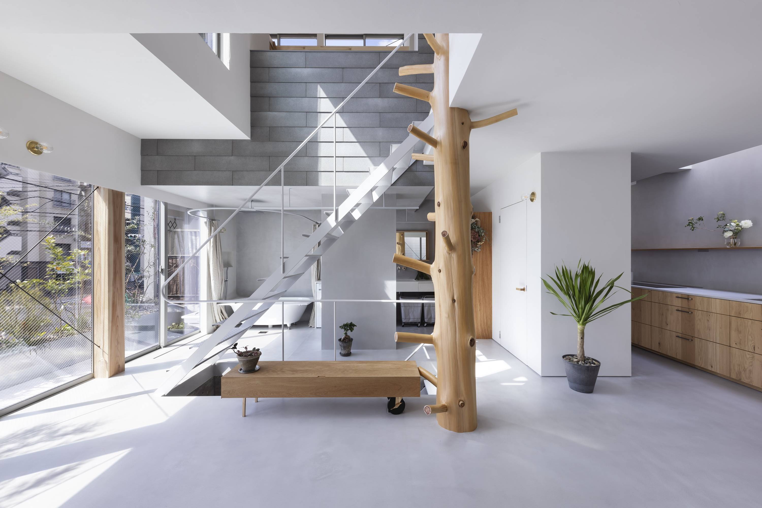 内部も「余白」の延長として捉え、強固な壁で仕切るのではなく、吹抜や枝付き丸柱等が弱い領域性のみを生み、その中に家具や浴槽が置かれ、初めて空間に機能性が見えてくるような空間作りを行った。