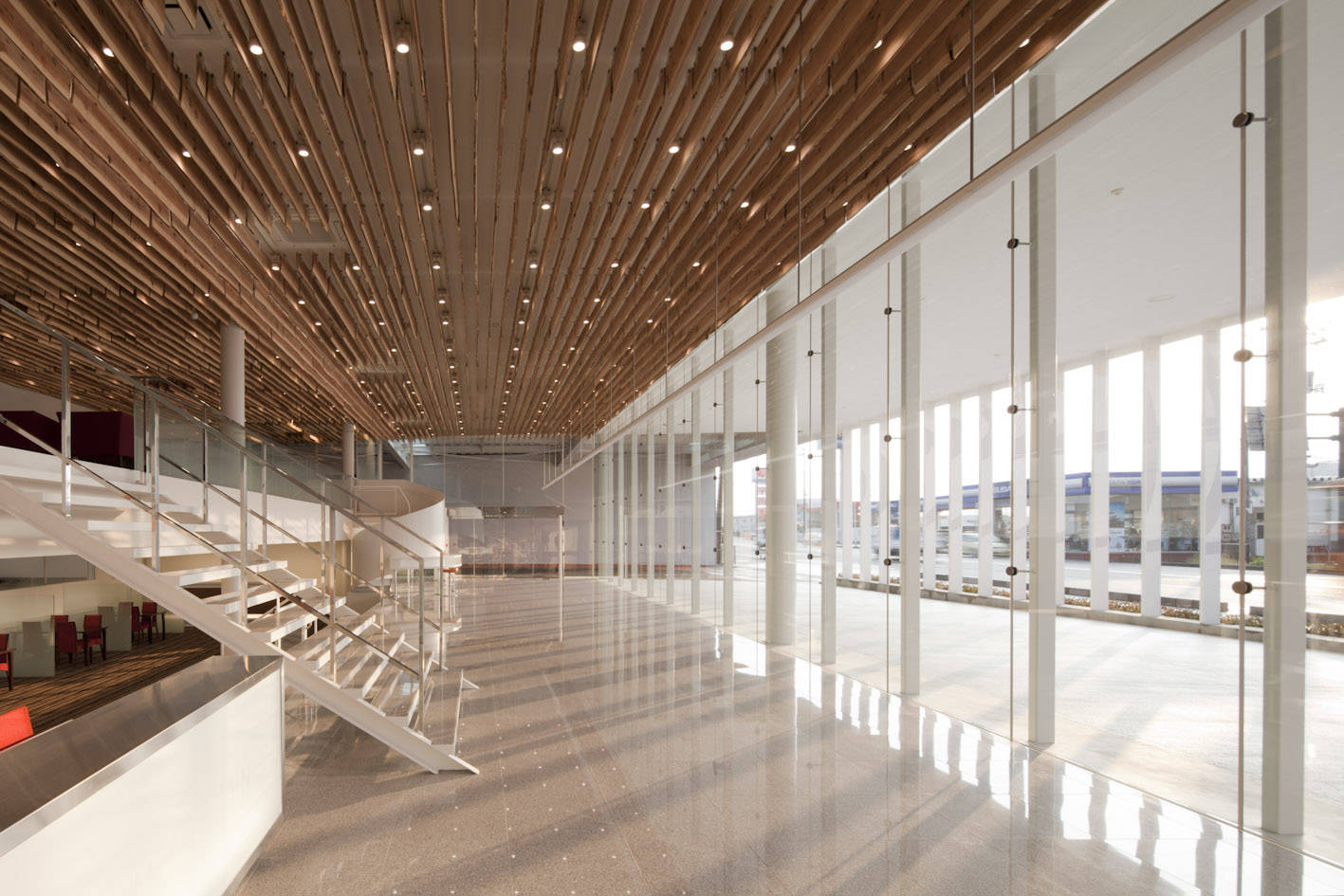 建物の天井には、秋田杉を同じくルーバー状に吊り、インテリア全体が木質空間に包まれます。