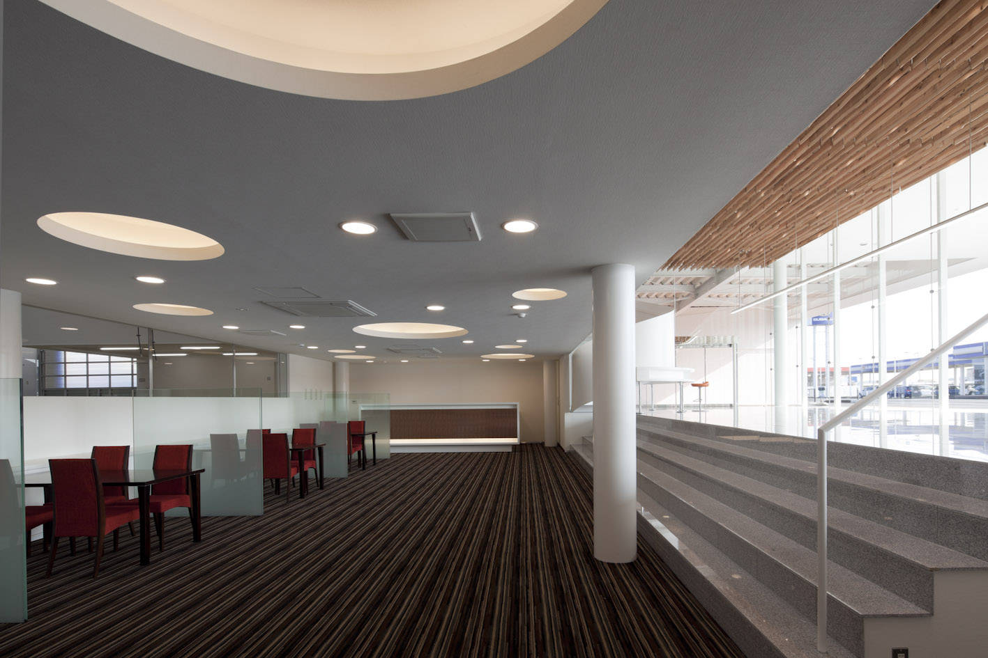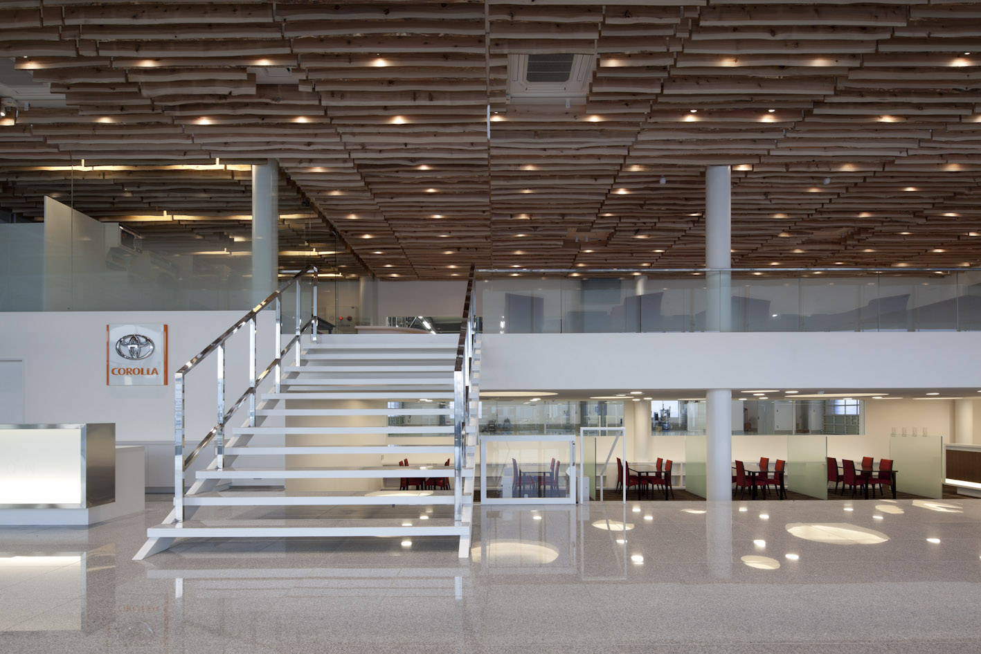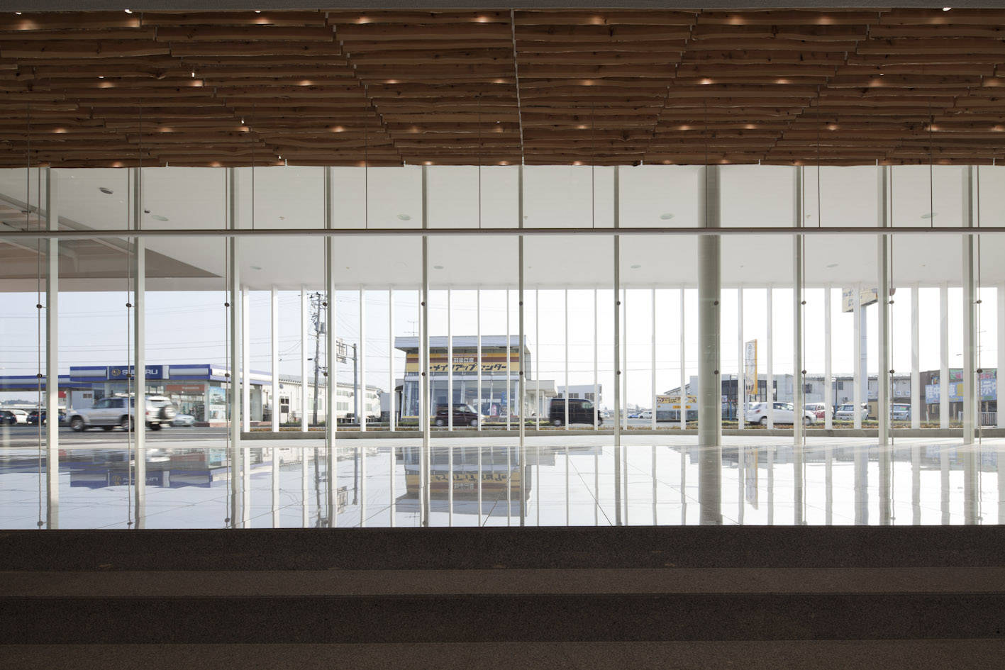 トヨタカローラ秋田の南店を設計するにあたって、秋田らしく、温かみのある優しい空間でお客様を包みたいと考えました。