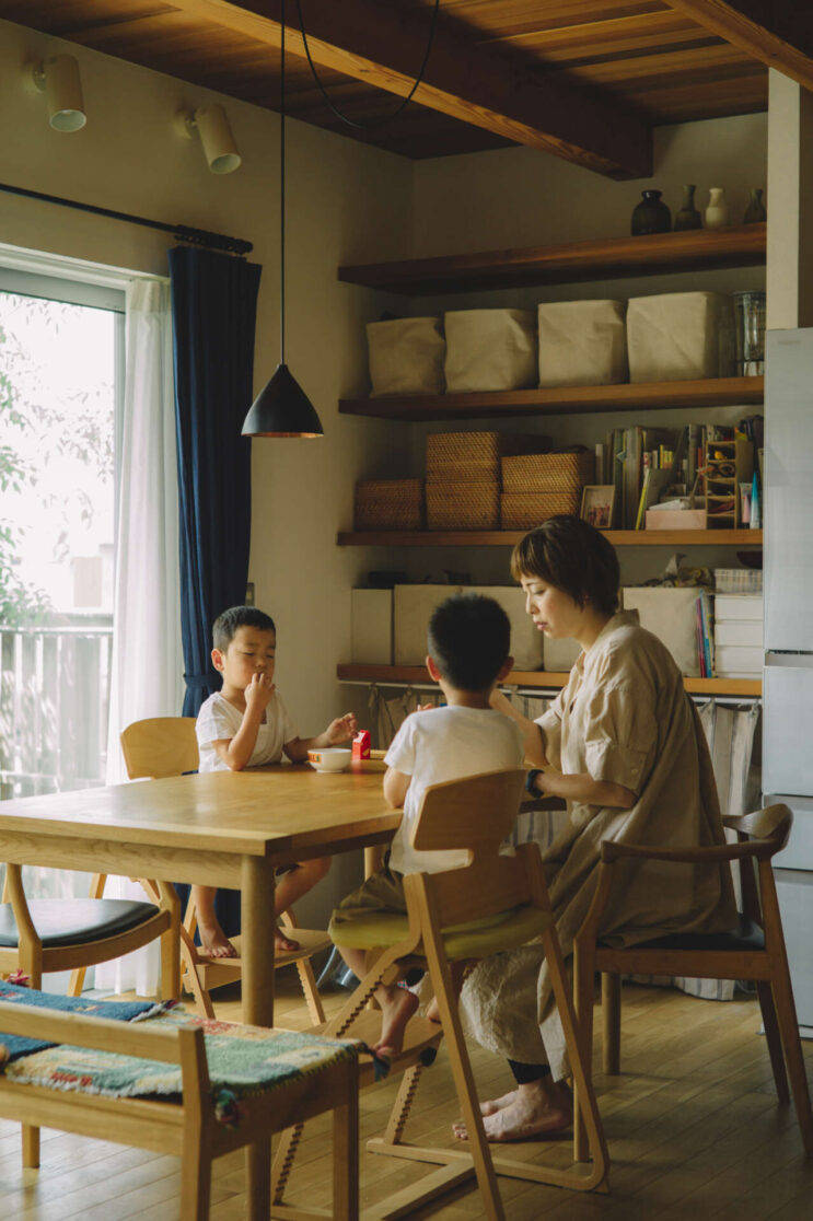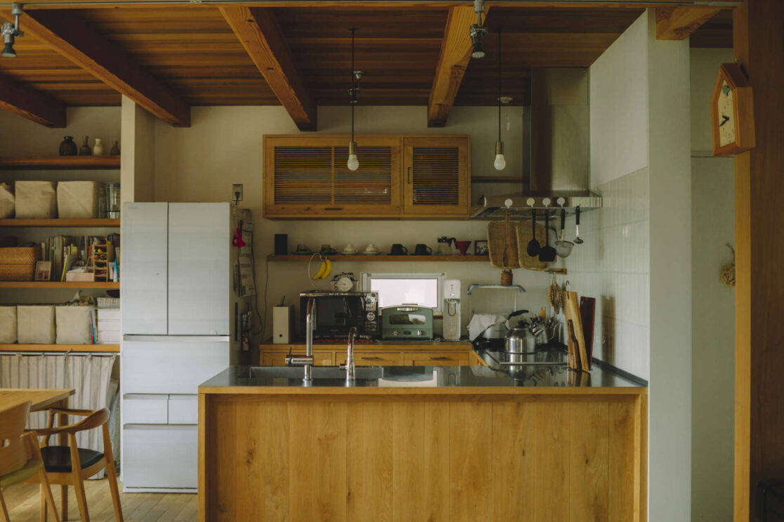 梁現しの天井や、ナラ無垢材のフローリングやキッチンなど、木の温かみや肌触りの良さと香りに癒されます。