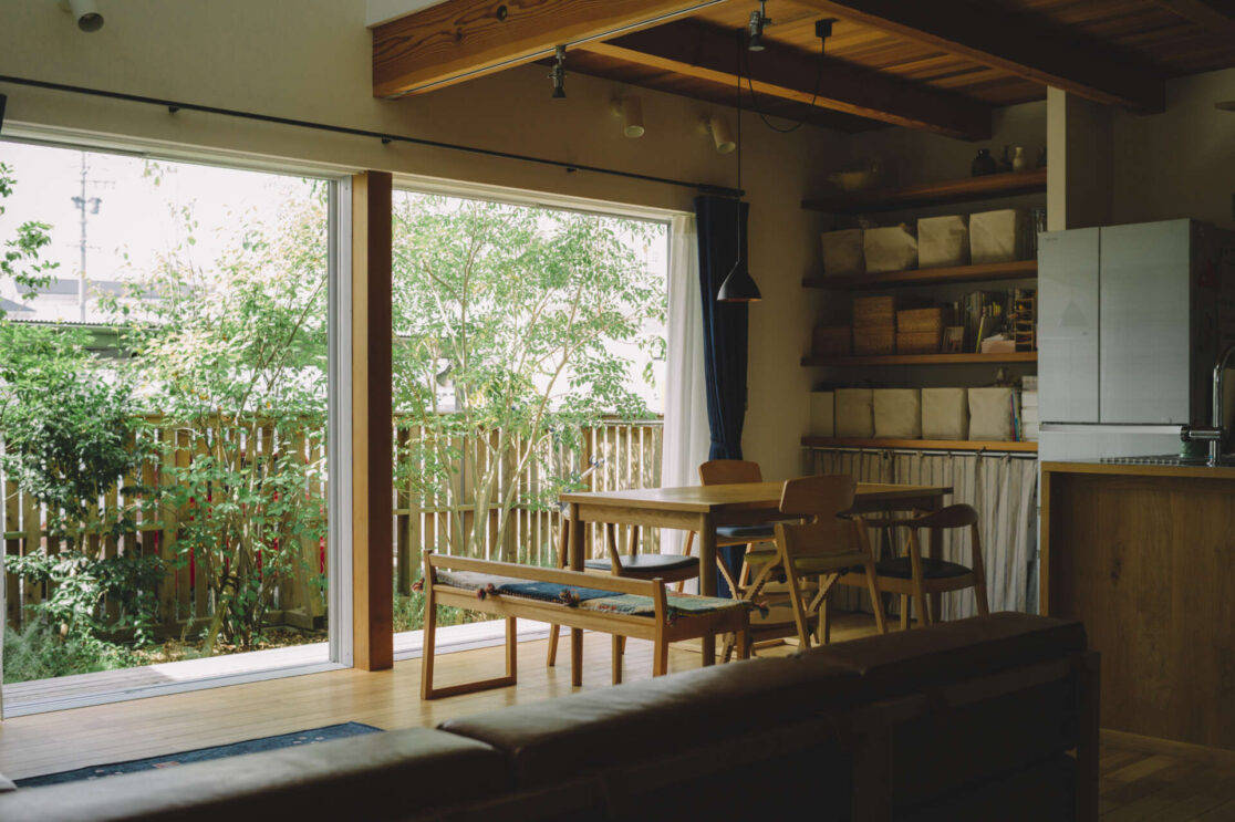 LDKに幅広の全開口サッシを設けて庭の緑をふんだんに取り込み、リラックスできる空間を設計しました。