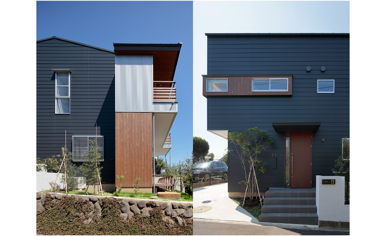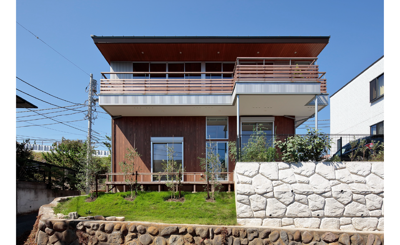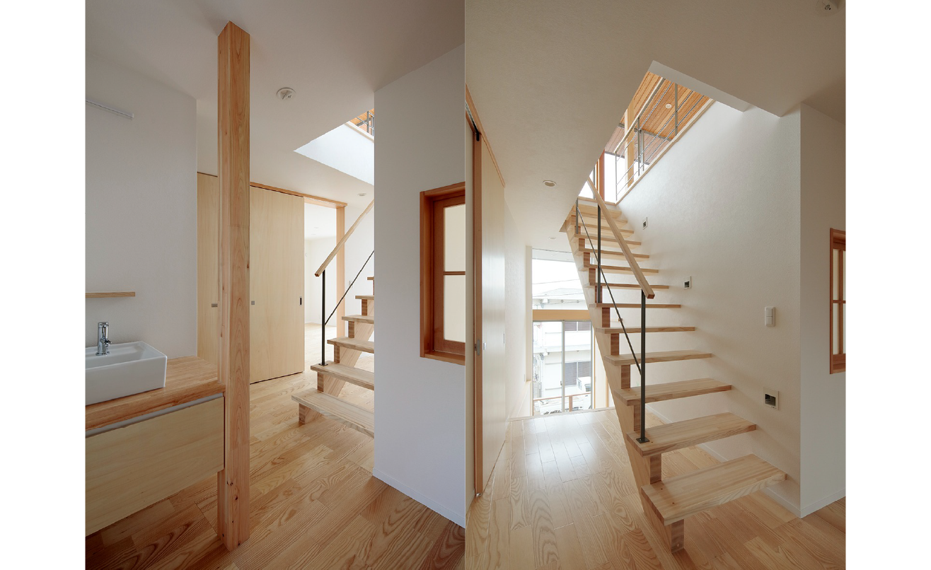 もともと2段擁壁のあった、海を望める敷地です。2段擁壁を解体し、一部は構造上安全な擁壁を構築し、その他の部分は、もともとあった斜面を復元しました。そこへ海への眺めを最大限確保できるように2階にリビングを計画しました。1階から2階へのスケルトン階段の隙間からも海が垣間見れ、2階に上がると一気に展望が開けます。海を望む窓は、あえて高さを抑え、より水平方向への拡がりを感じられるような仕掛けとなっています。さらにホワイトアッシュフローリングと珪藻土壁、杉板張りが空間に温もりを与えています。