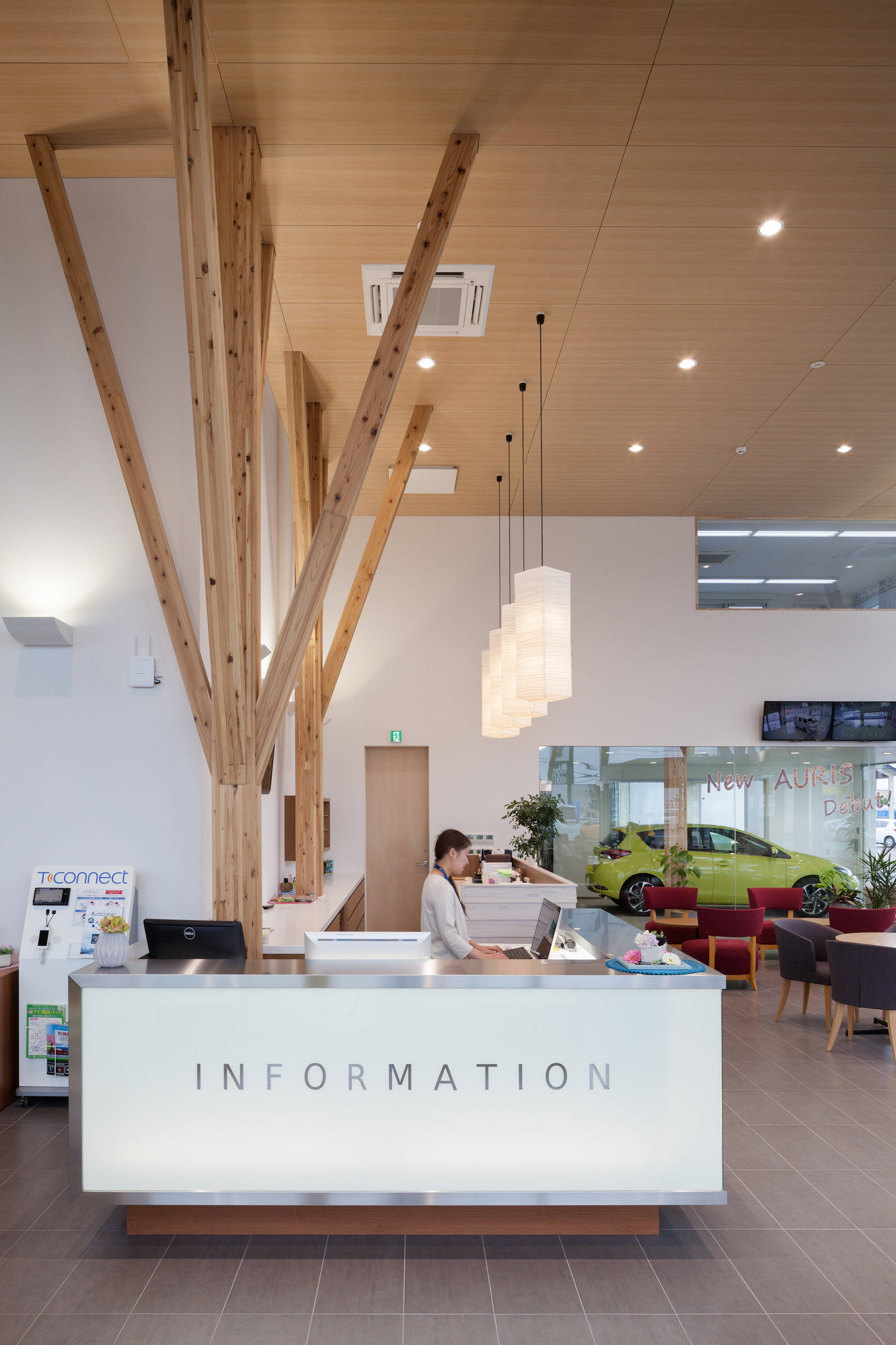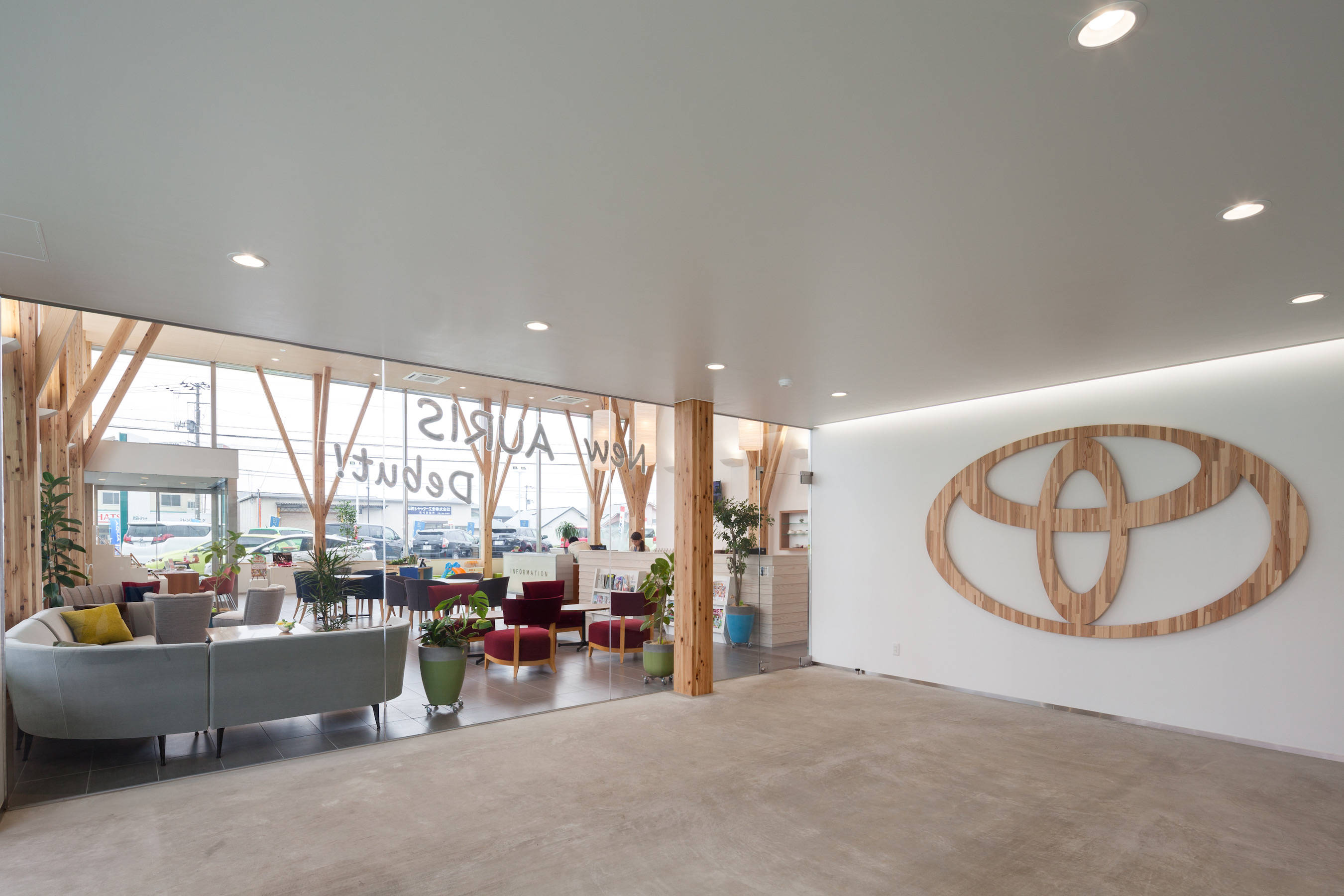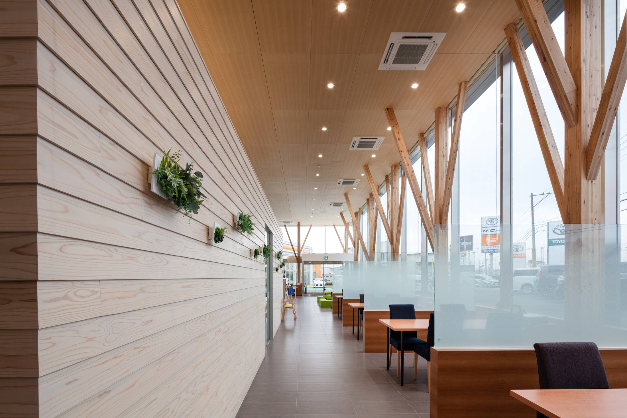 そこで、カーディーラーを整備工場とショールームに分けることで、ショールームを木造で提案しました。