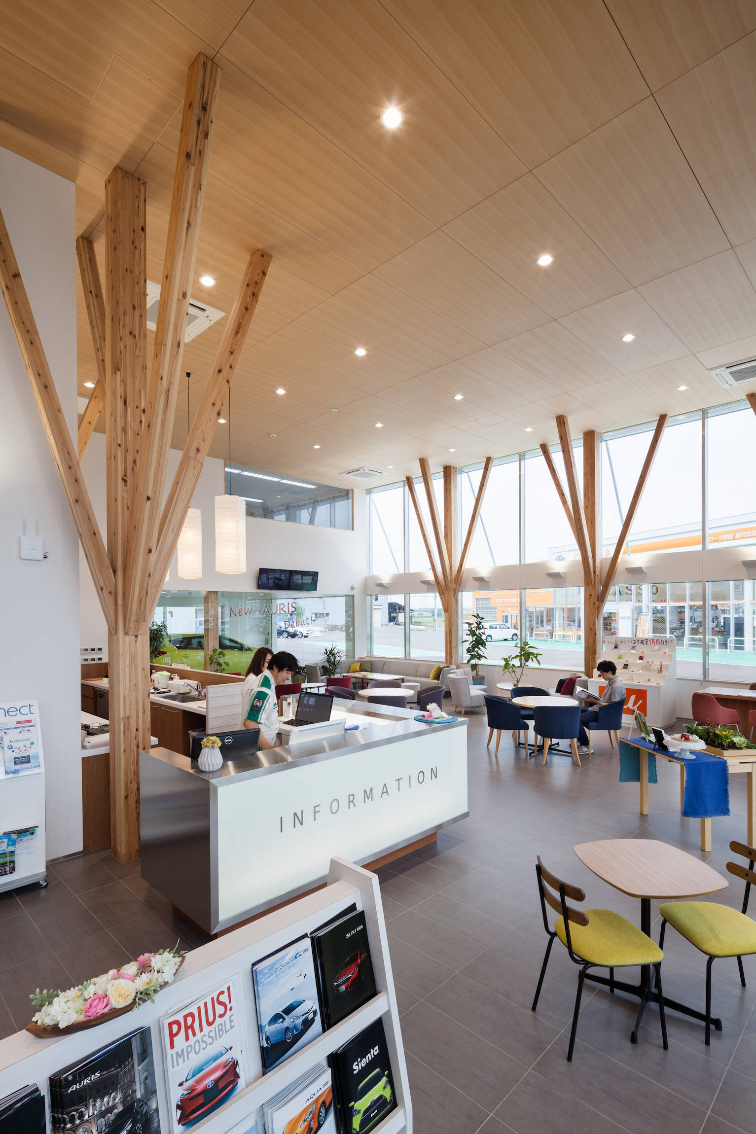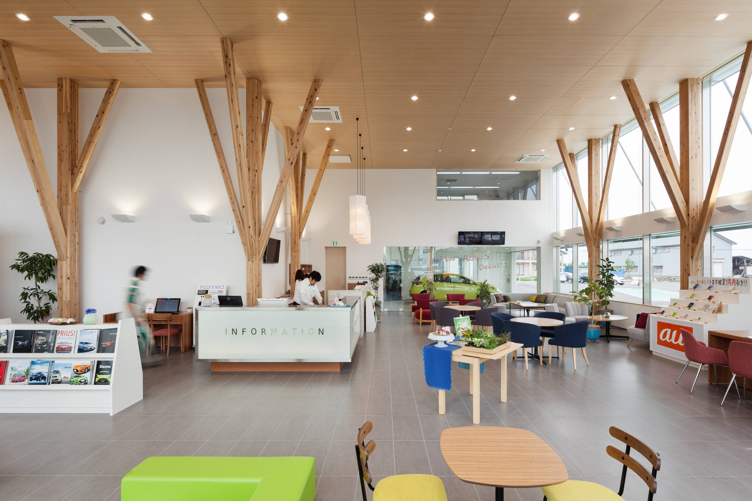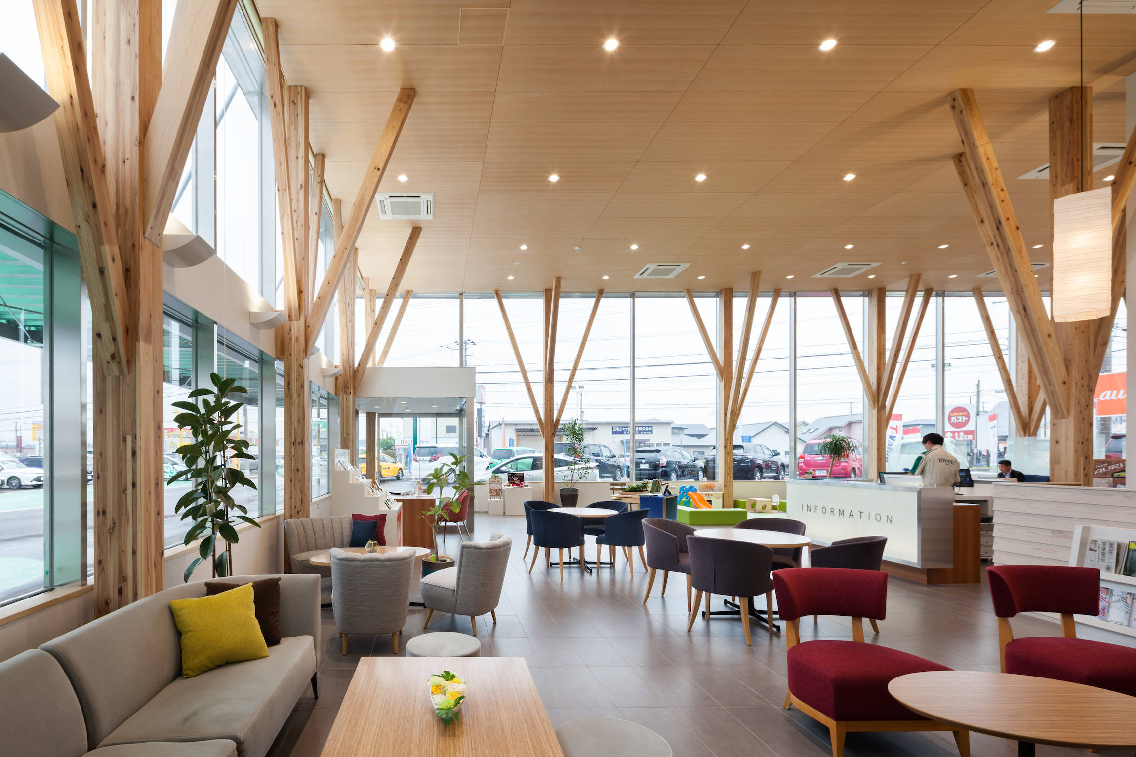 そこで、カーディーラーを整備工場とショールームに分けることで、ショールームを木造で提案しました。