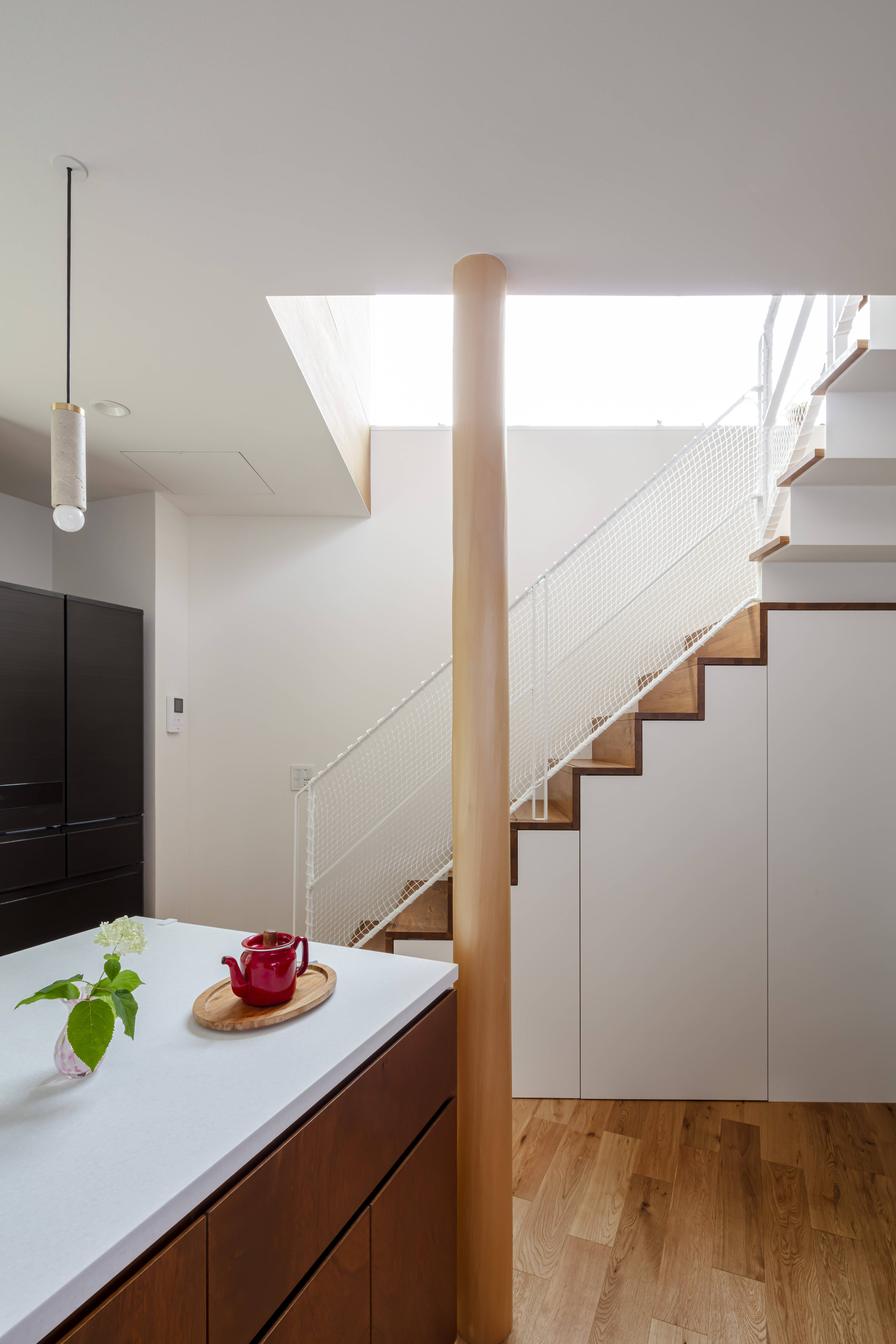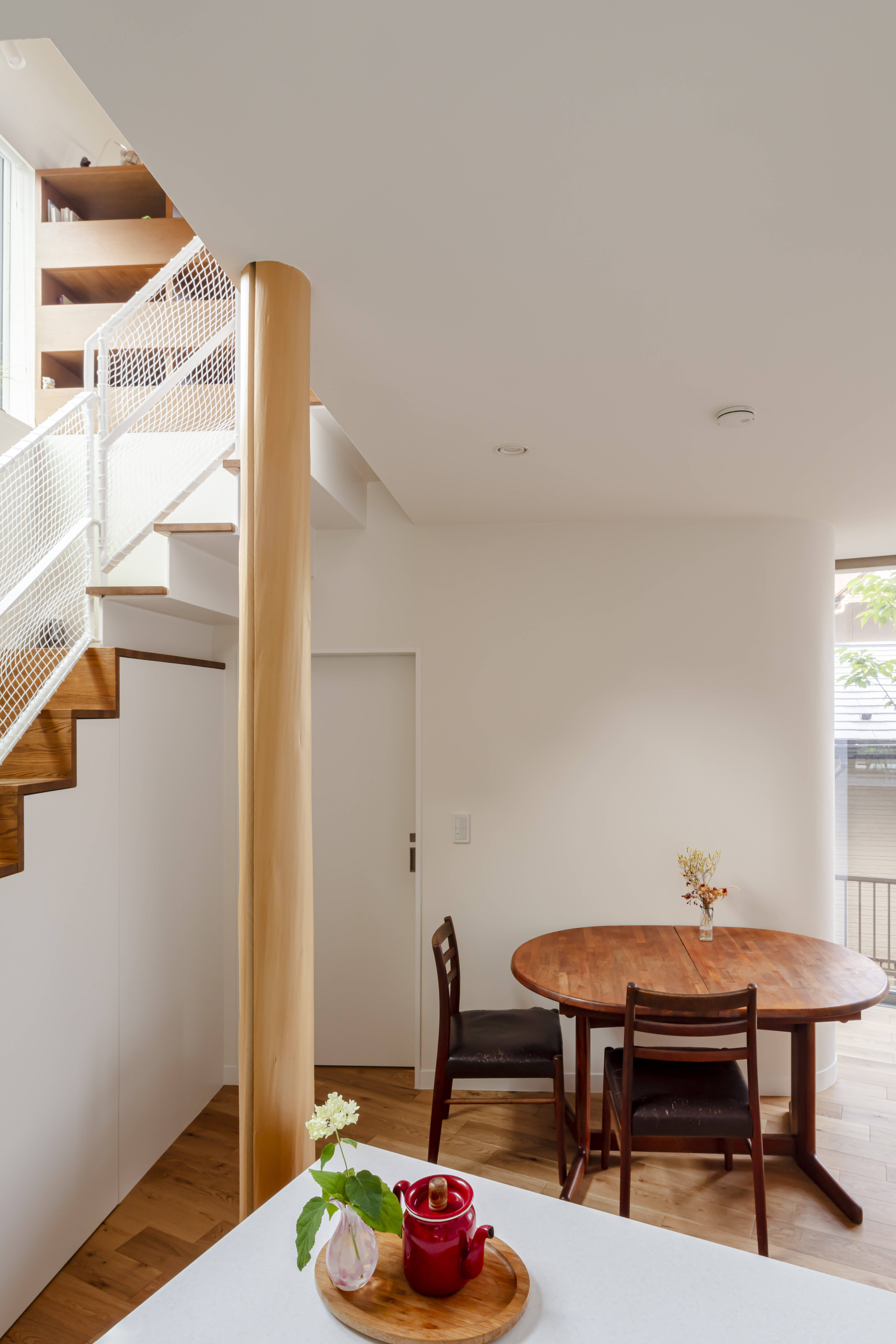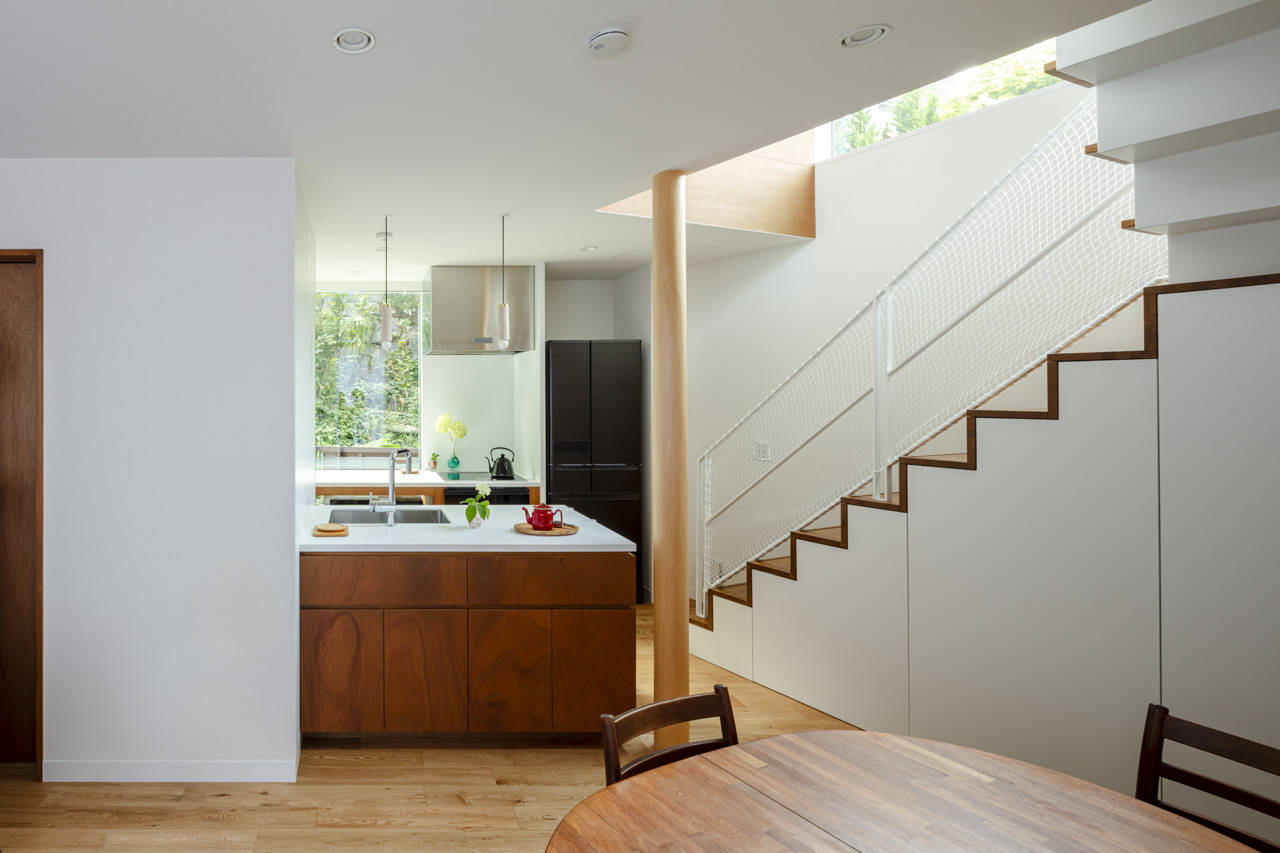 1階は水回りとダイニングキッチンを円環状に配置し、車いすの動線を簡潔なものとしています。南側には隣家が迫るものの、北側斜面の緑を取り込むキッチンの開口、東の路地に向けた吹抜のハイサイドライトにより、淡くやわらかな光で満たされる静謐な空間となりました。
