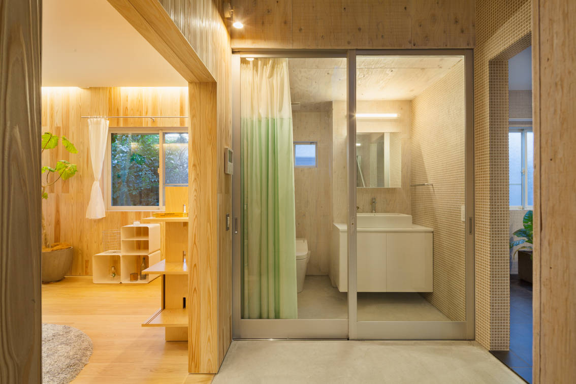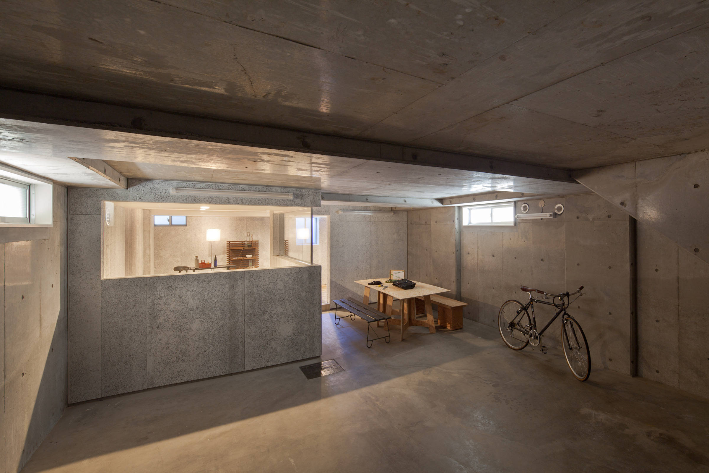 リビングは杉の箱、ダイニングキッチンはモザイクタイル、個室は白のEP塗装、ガレージルームは木毛セメント板・・・、そんな個性的な部屋たちをニュートラルで無機質なモルタルとベニヤの住戸の中に散りばめました。