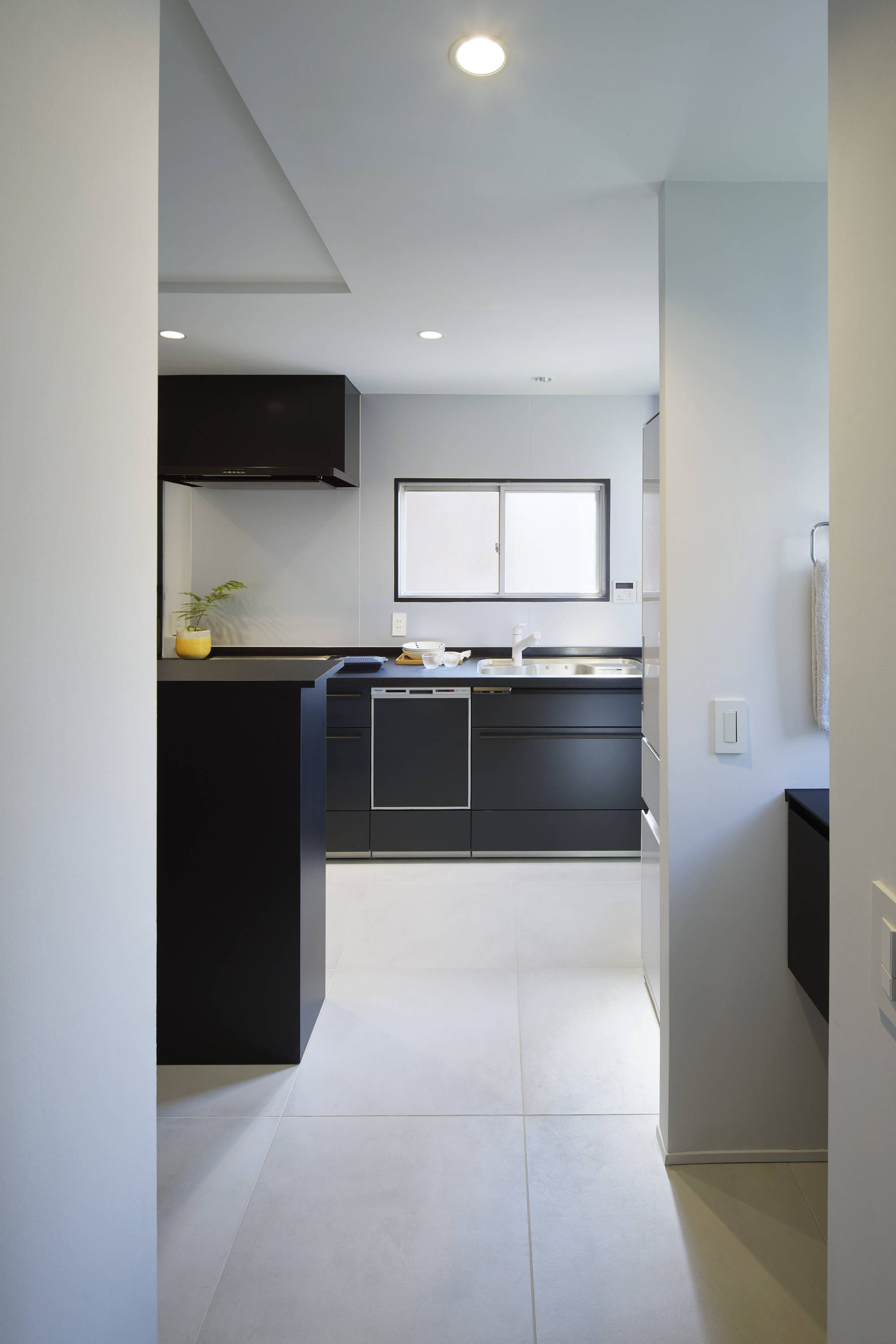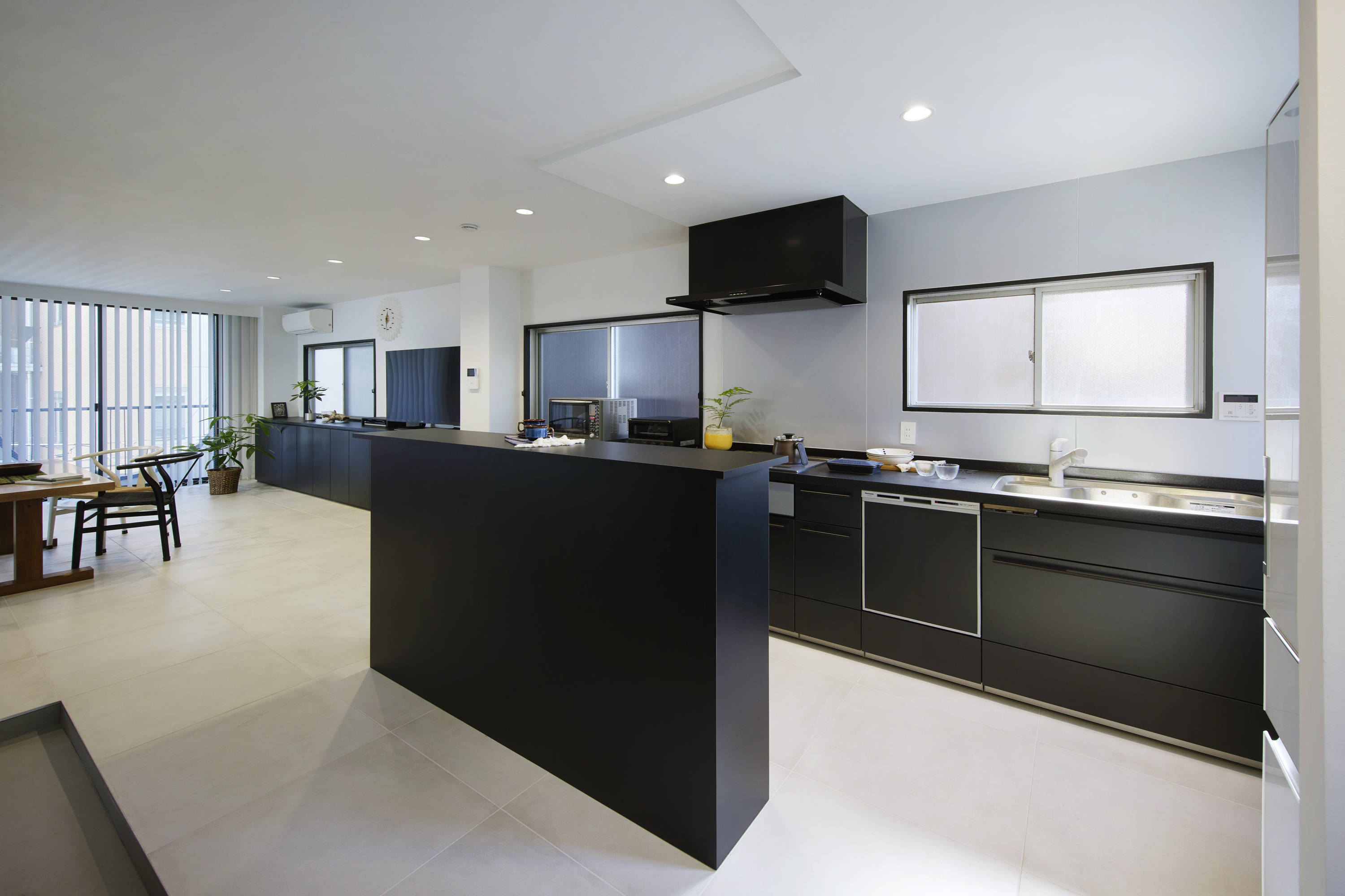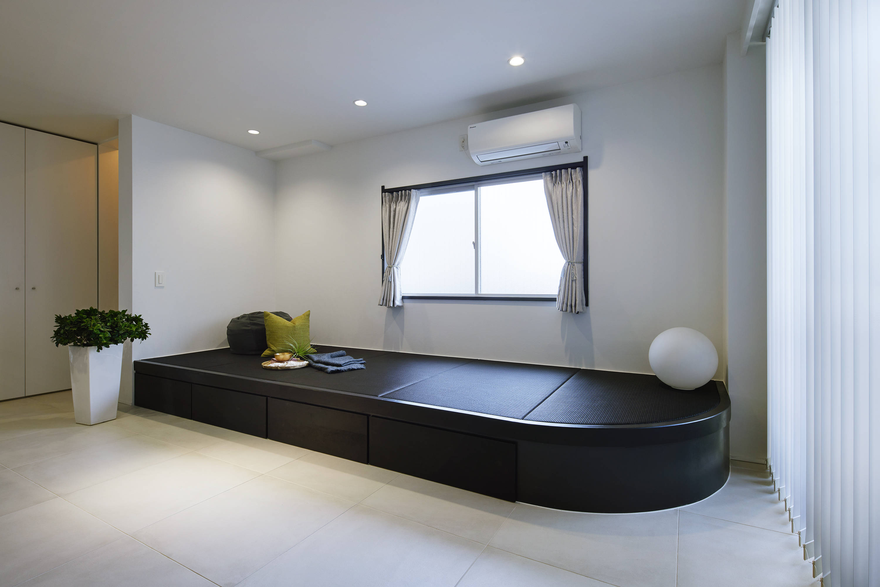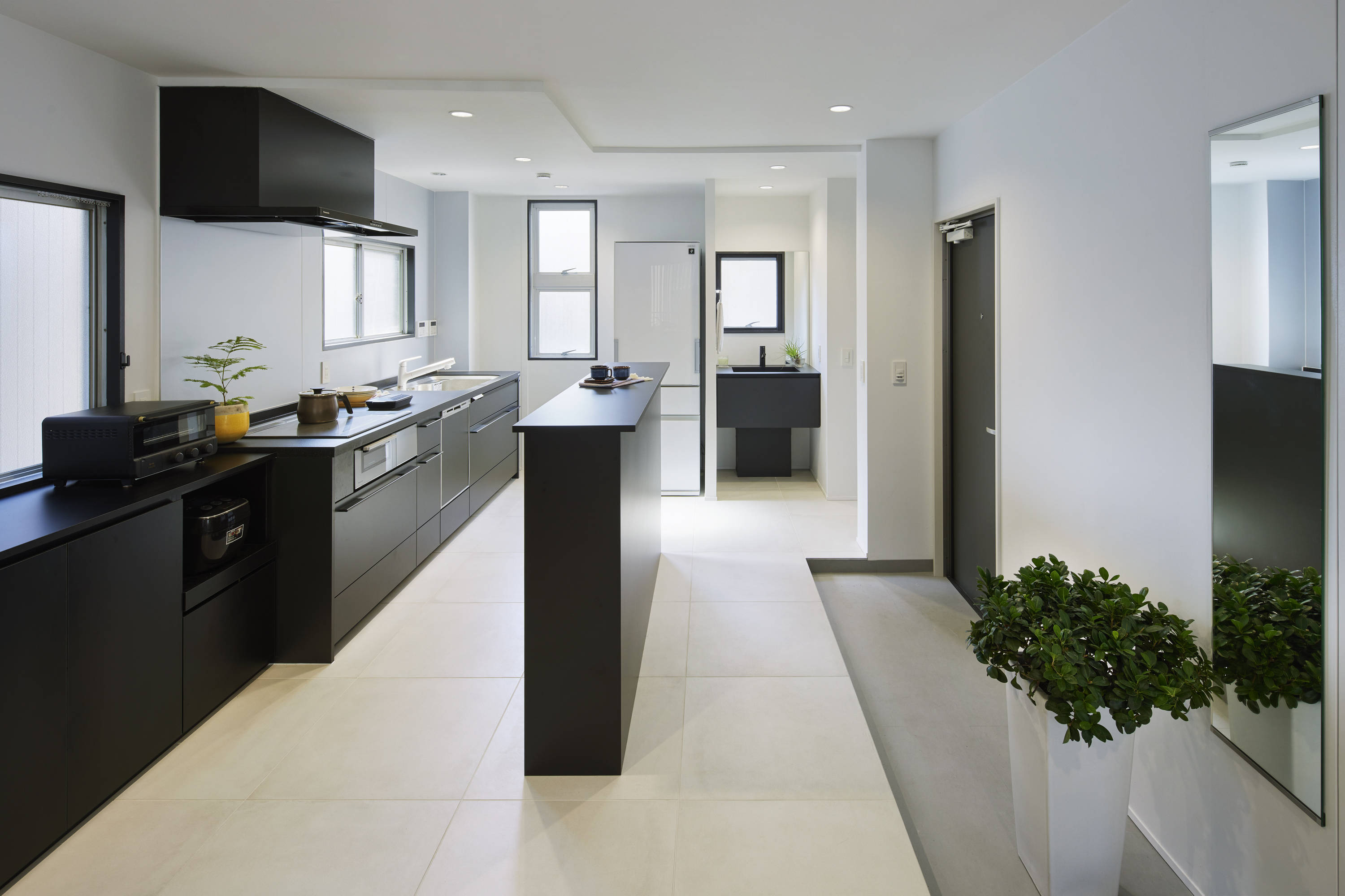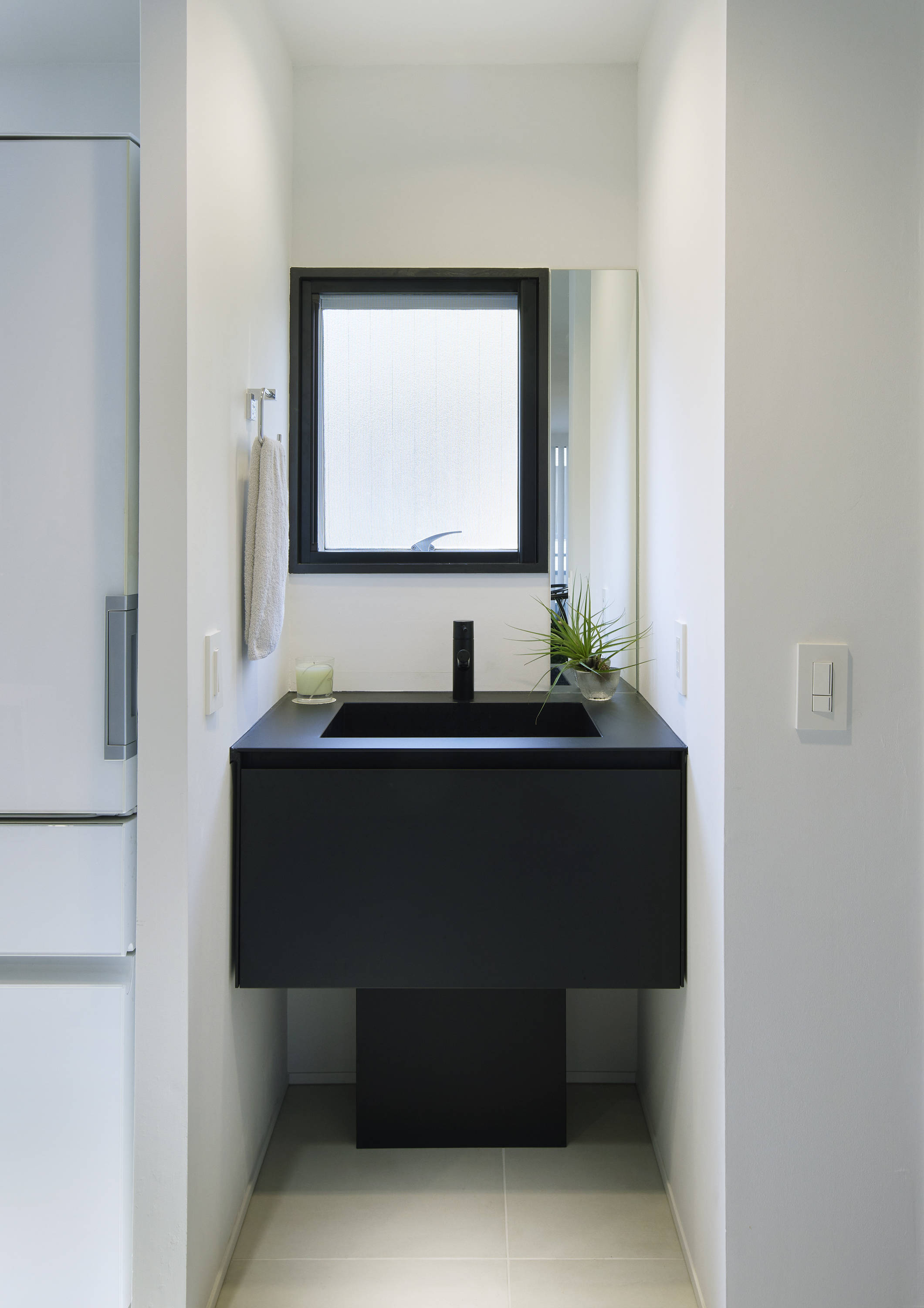 3F の大部屋は収納を充実させてモノを片付けられるとともに、家族の個性が見えるようにモノを飾ることもできる、ギャラリーのような空間が良いのではないかと考えた。白地をつくり、オブジェを置くように黒い什器を配置していった。黒い什器は収納であるが、展示台でもあり、季節に応じて好きなものを飾ることができる。モノクロ空間は、食器やグリーン、ファブリックなど、置かれるモノを美しく引き立てるための背景となる。