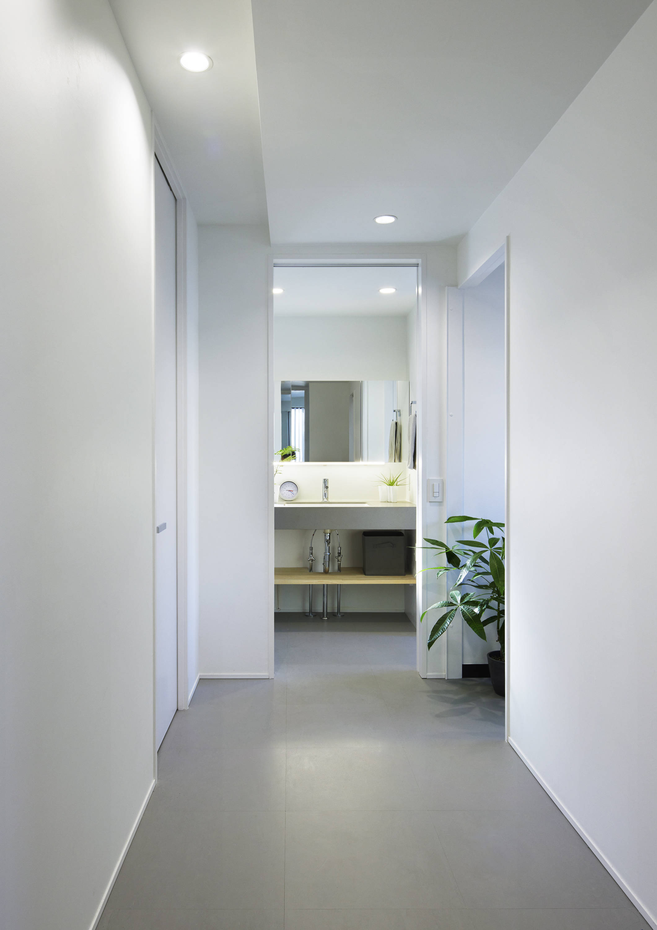 都市の中にある築41 年の鉄骨造メゾネット住宅のリノベーション。1~2F は貸事務所、3~4F が対象住戸であり、改修前は3F を民泊施設として活用していたが、新たに夫婦と子供2 人の家族向けのプランへと改修した。3F の壁を取り払い、鉄骨造の特徴を生かした開放的なリビングアクセス形式の住戸プランとした。家族や来客は必ず3Fの大部屋を通ることになり、お互いの顔が良く見える、風通しの良い平面計画となった。