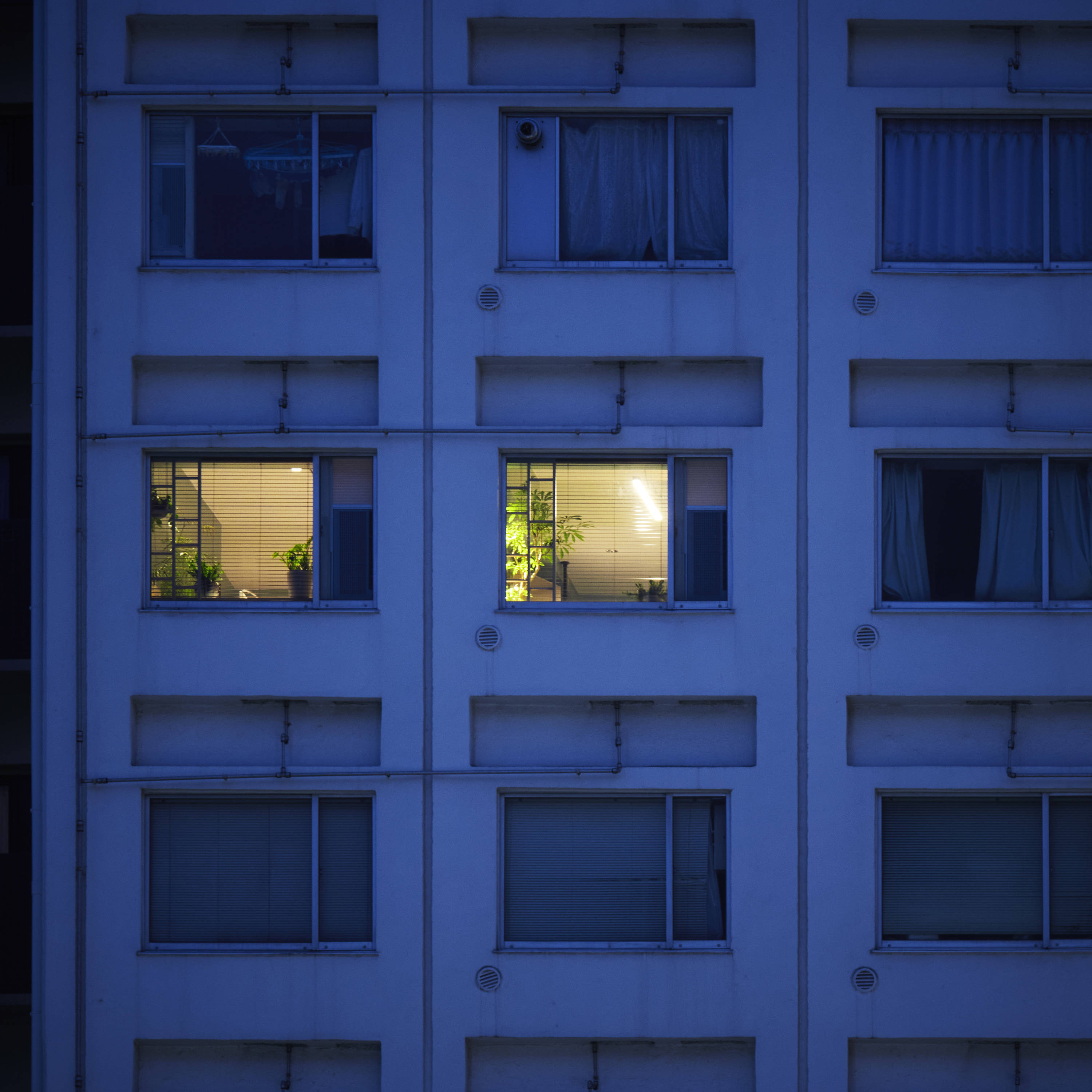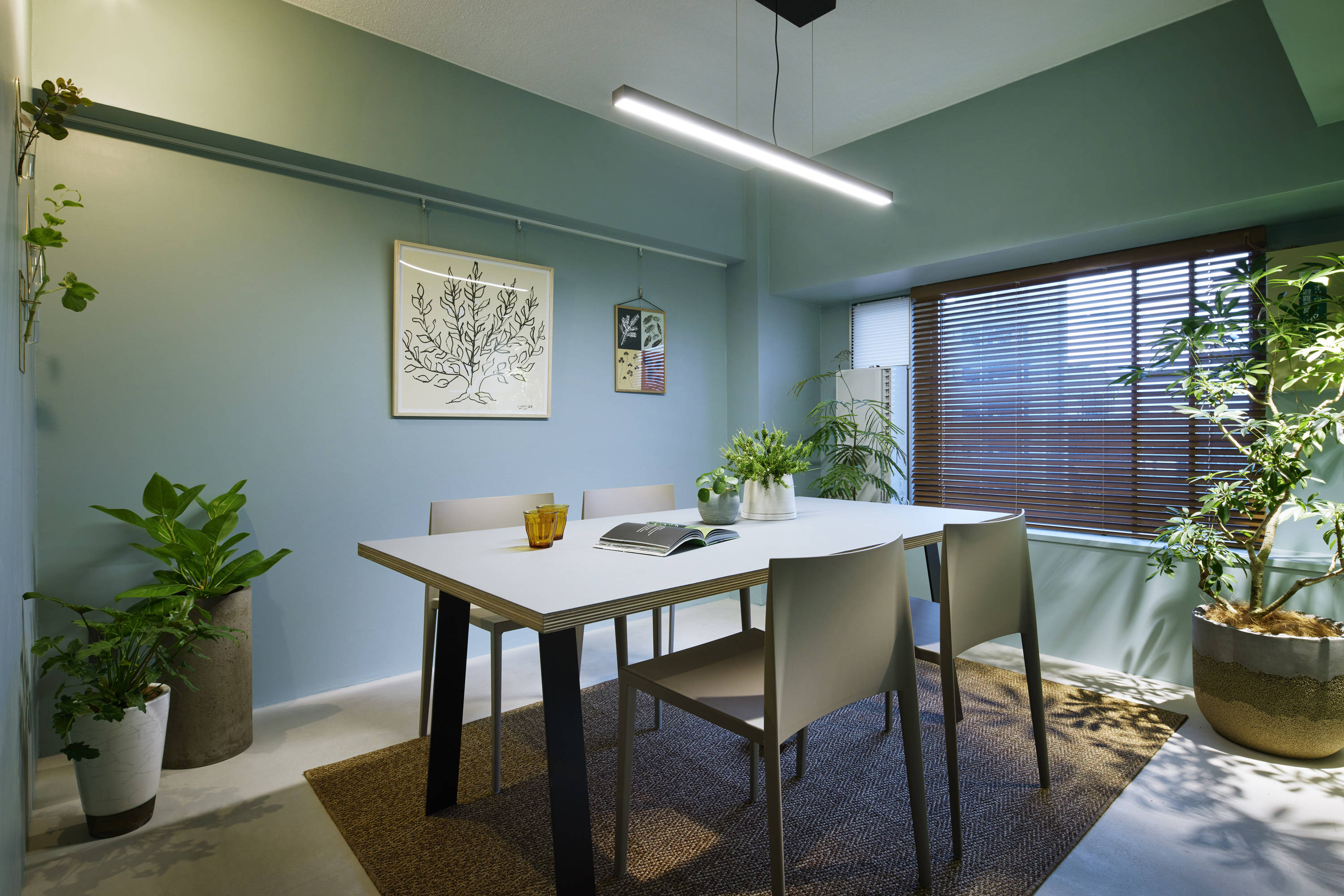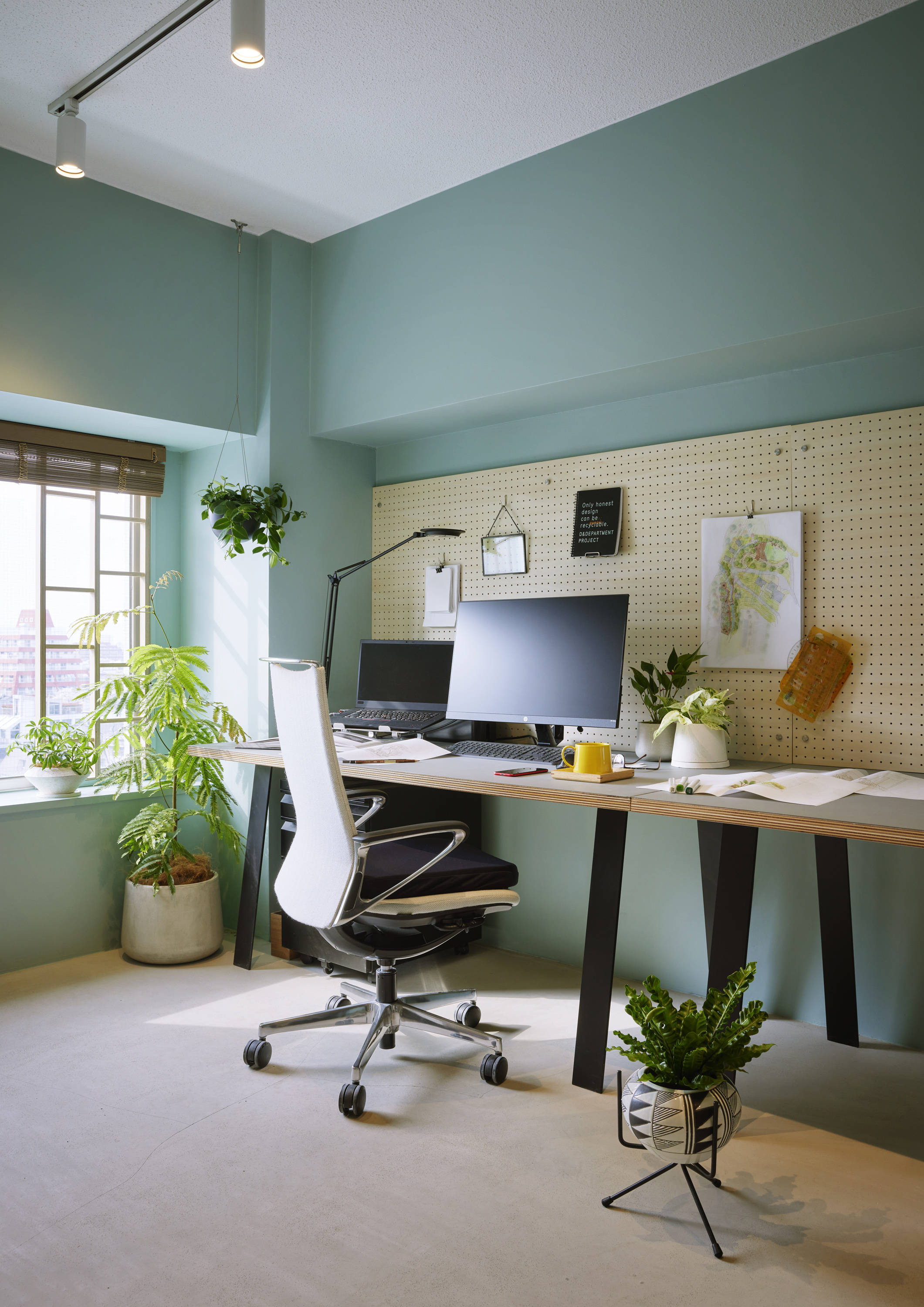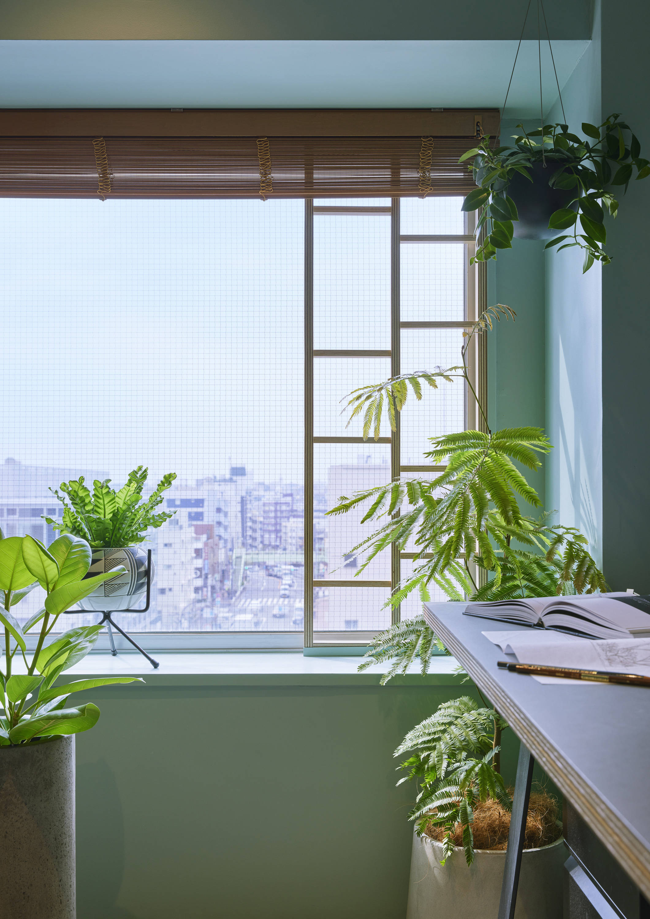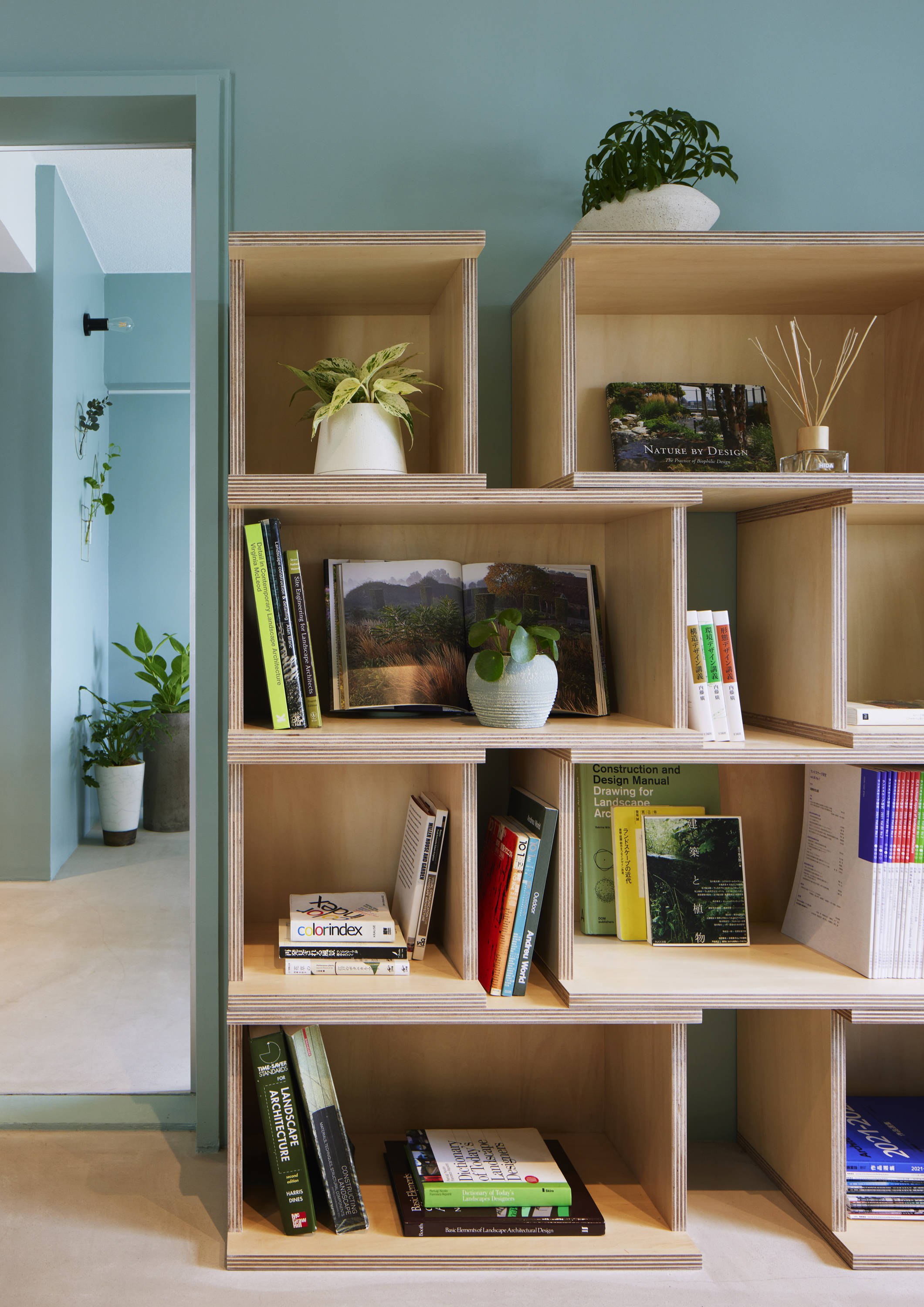 室内には植物が置かれることから、壁は植物との相性を考慮して、淡いグリーンの水性塗料で仕上げた。床は植物を置いたり、自由な使い方が出来るようにセルフレベリング材仕上げとし、明るく透明感のあるインテリアとした。シナ合板のボックスを積み上げた積層棚など、家具は地層をイメージして積層合板で製作した。積層棚はA4 ファイルボックスがぴったり納まる寸法とし、2 種類の寸法の棚を、隙間を開けながら積み上げて構成している。デスクの天板は積層合板の上に天然素材のリノリウムを貼った。元々窓辺には手摺がなく、落下防止のため、窓が開く部分には梯子状の面格子をデザインした。これも積層合板で製作し、横にスライドさせて取り外し可能なディテールとした。