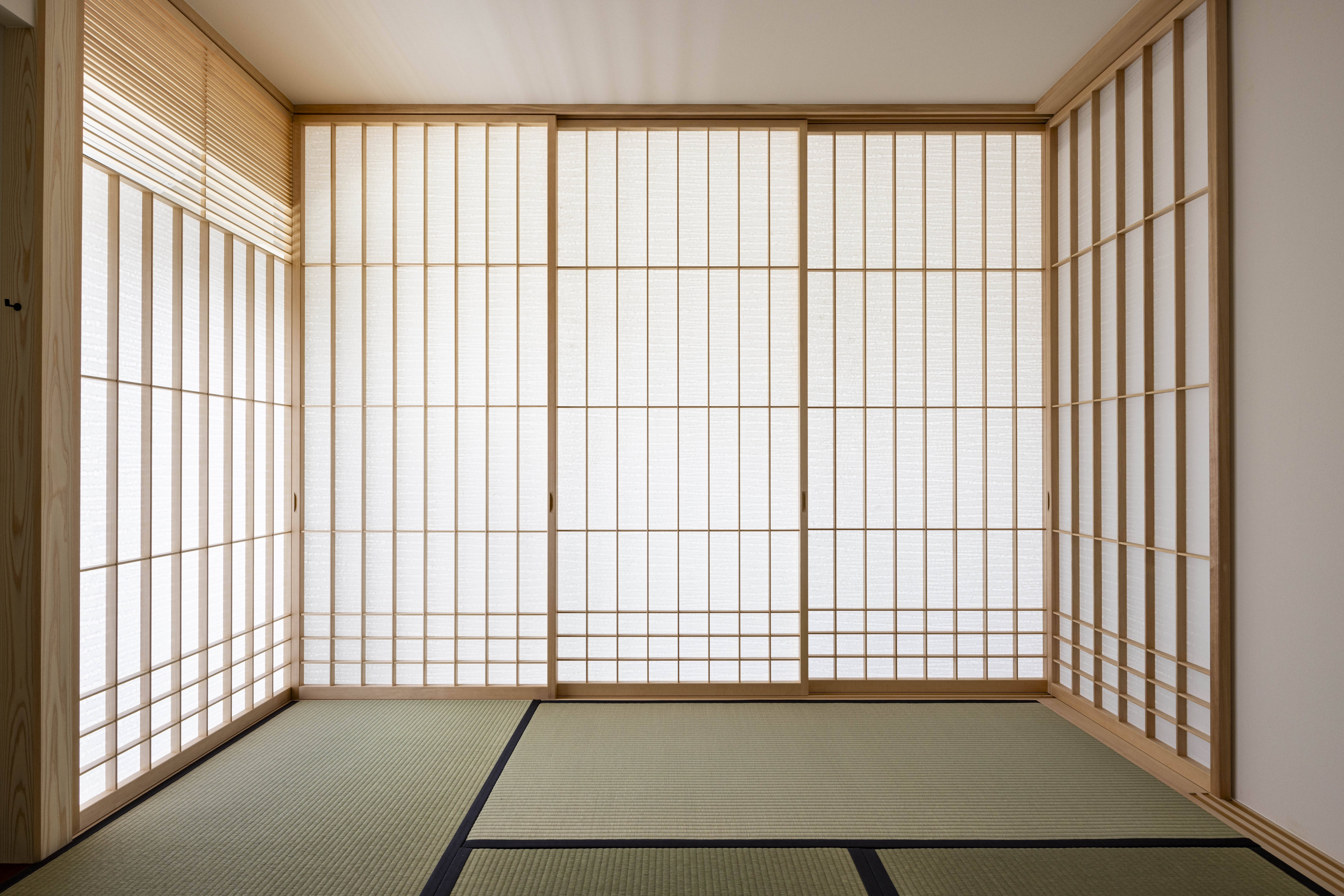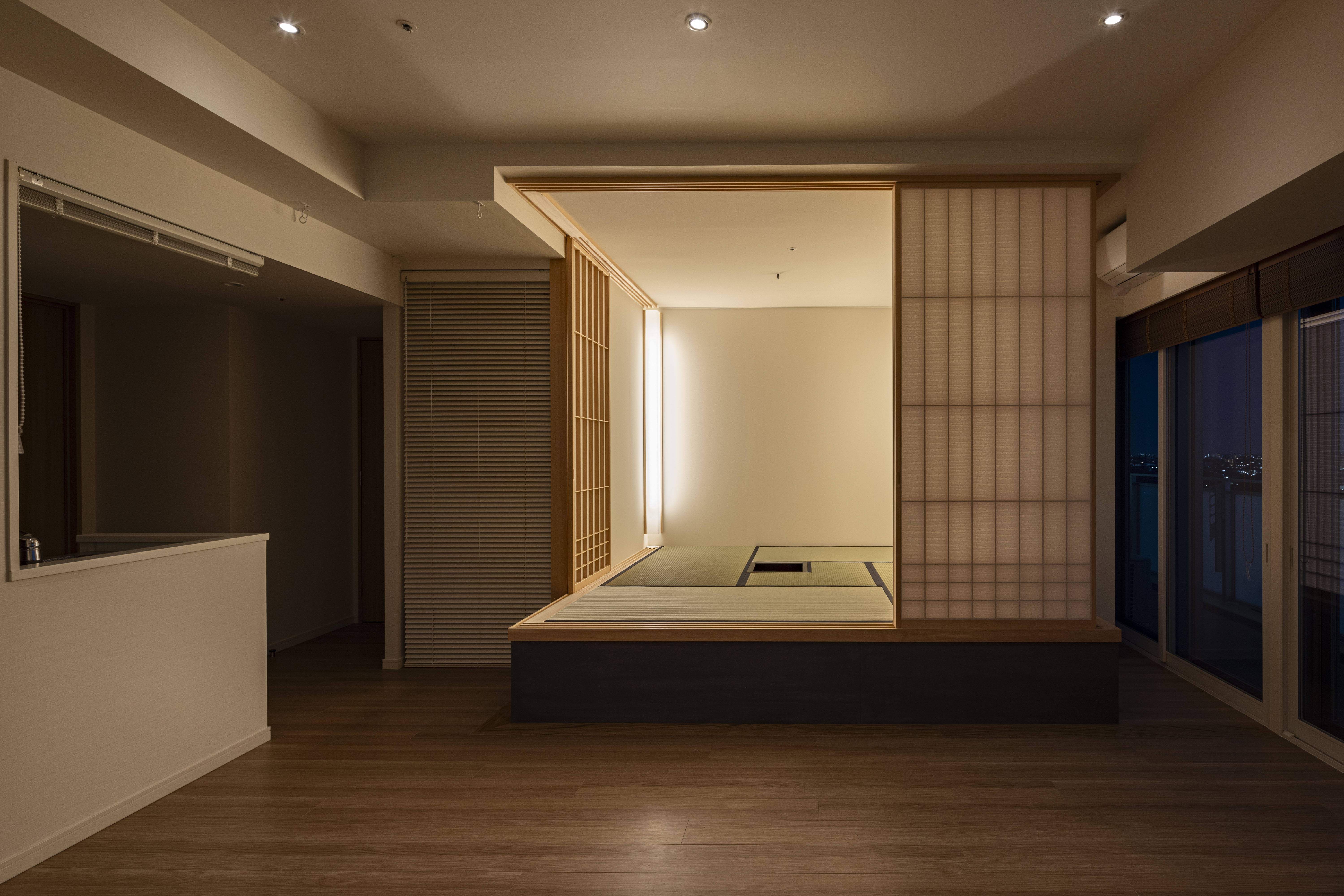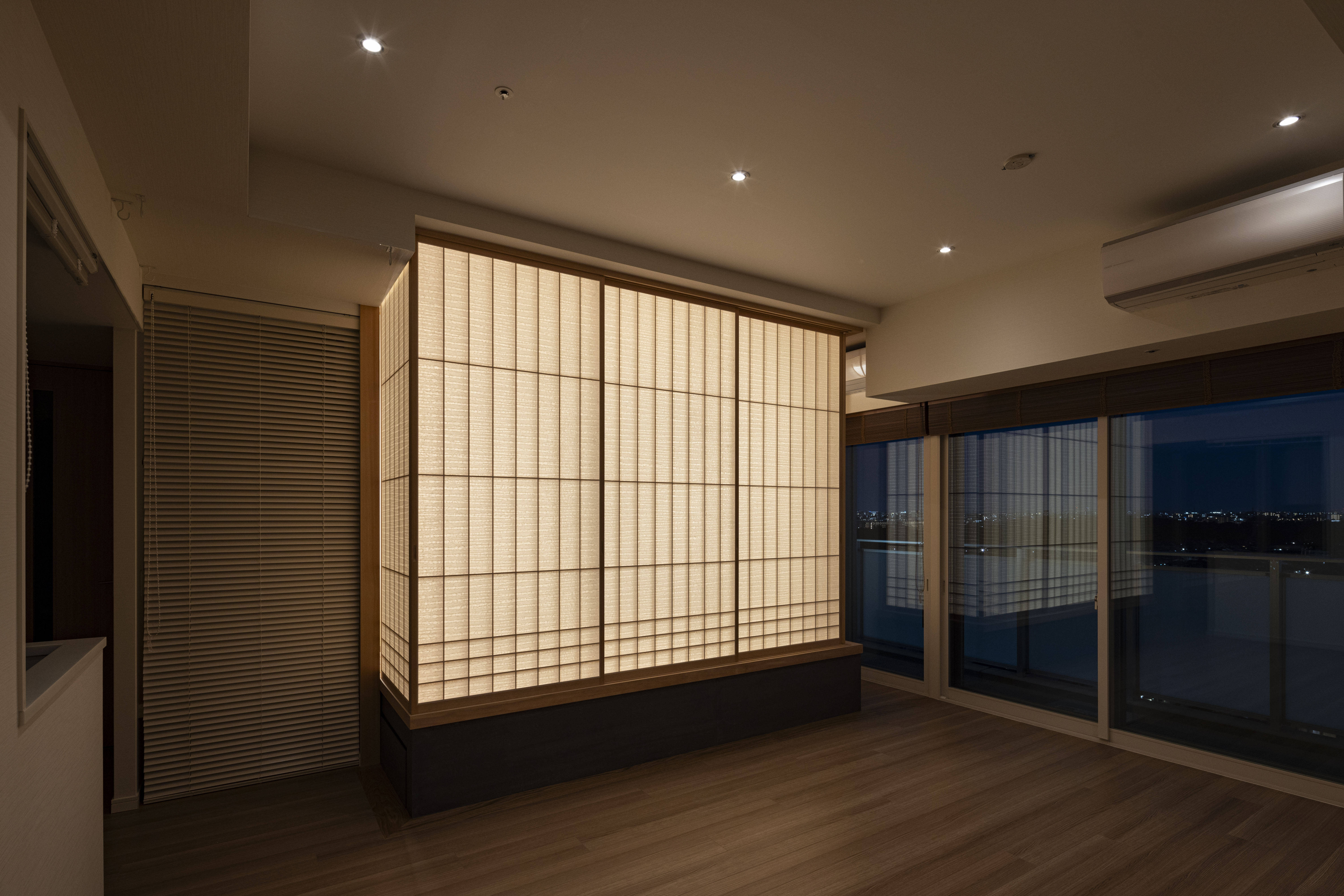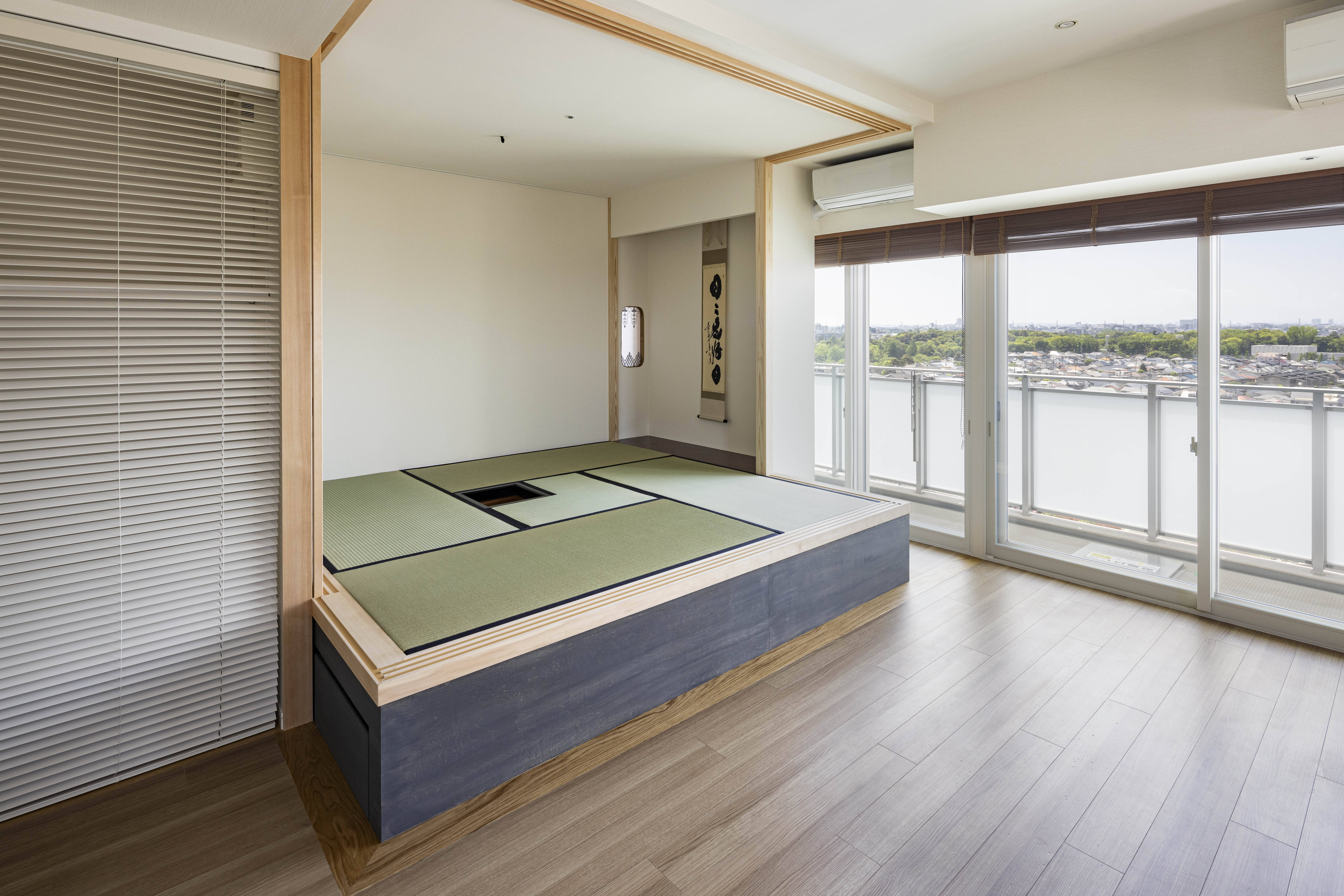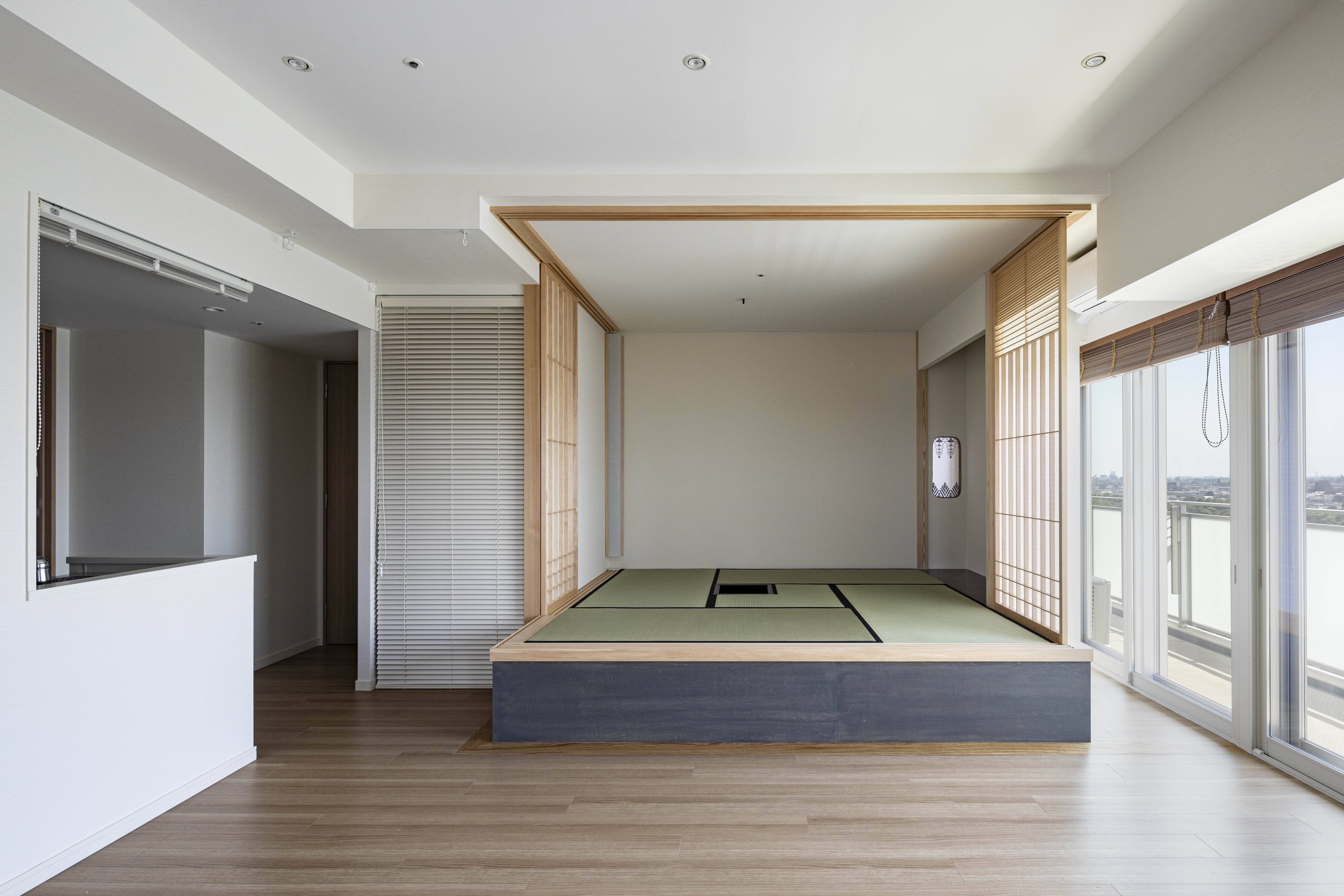 元々リビングに面した寝室だった部屋の壁と引戸を解体し、サッシやエアコンはそのまま活かしつつ、リビングに対して障子で開いたり閉じたりできる構成の茶室を考えた。障子を閉めれば客間としても使える茶室であり、障子を取り外せばリビングと連続する小上がりの和室となる。