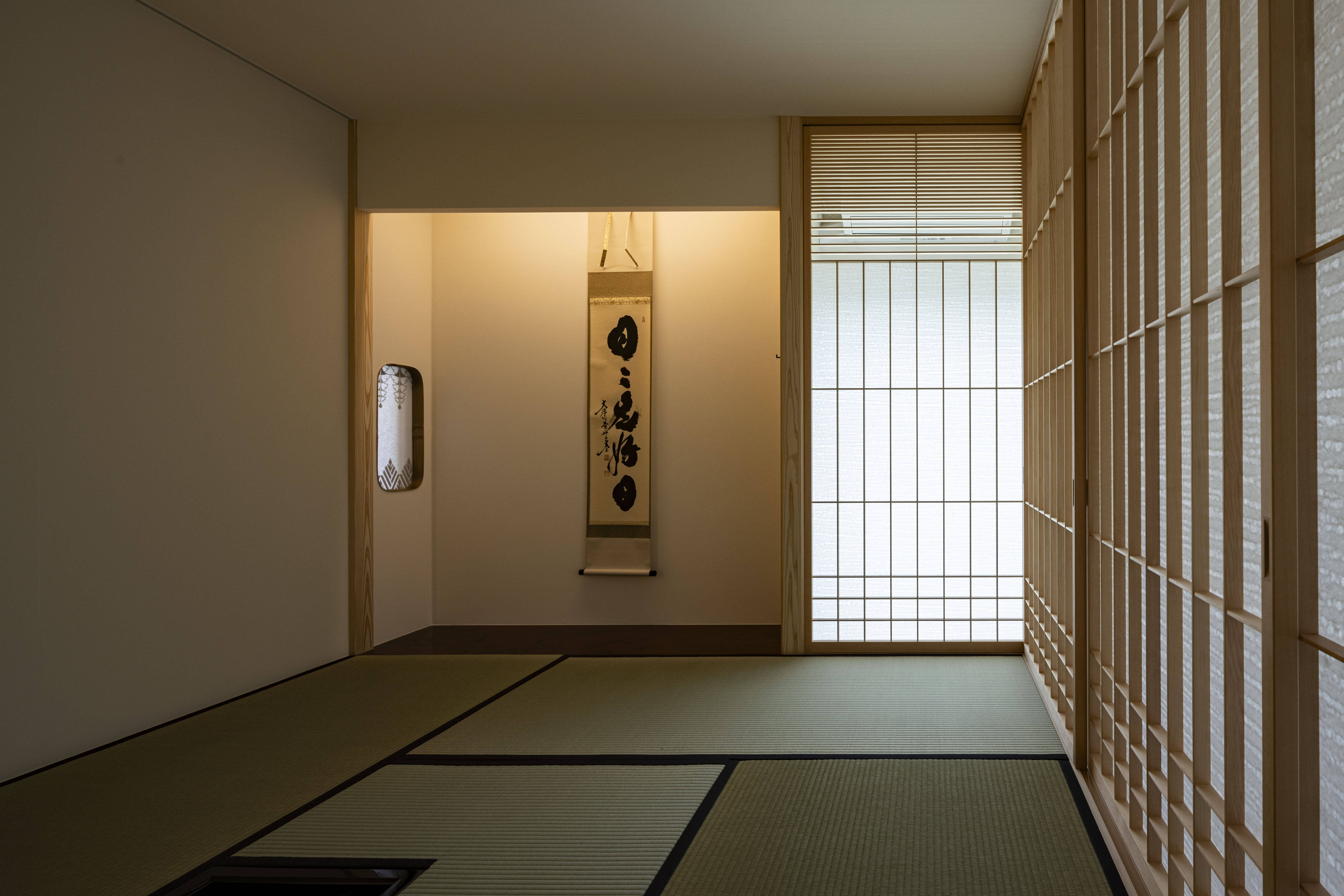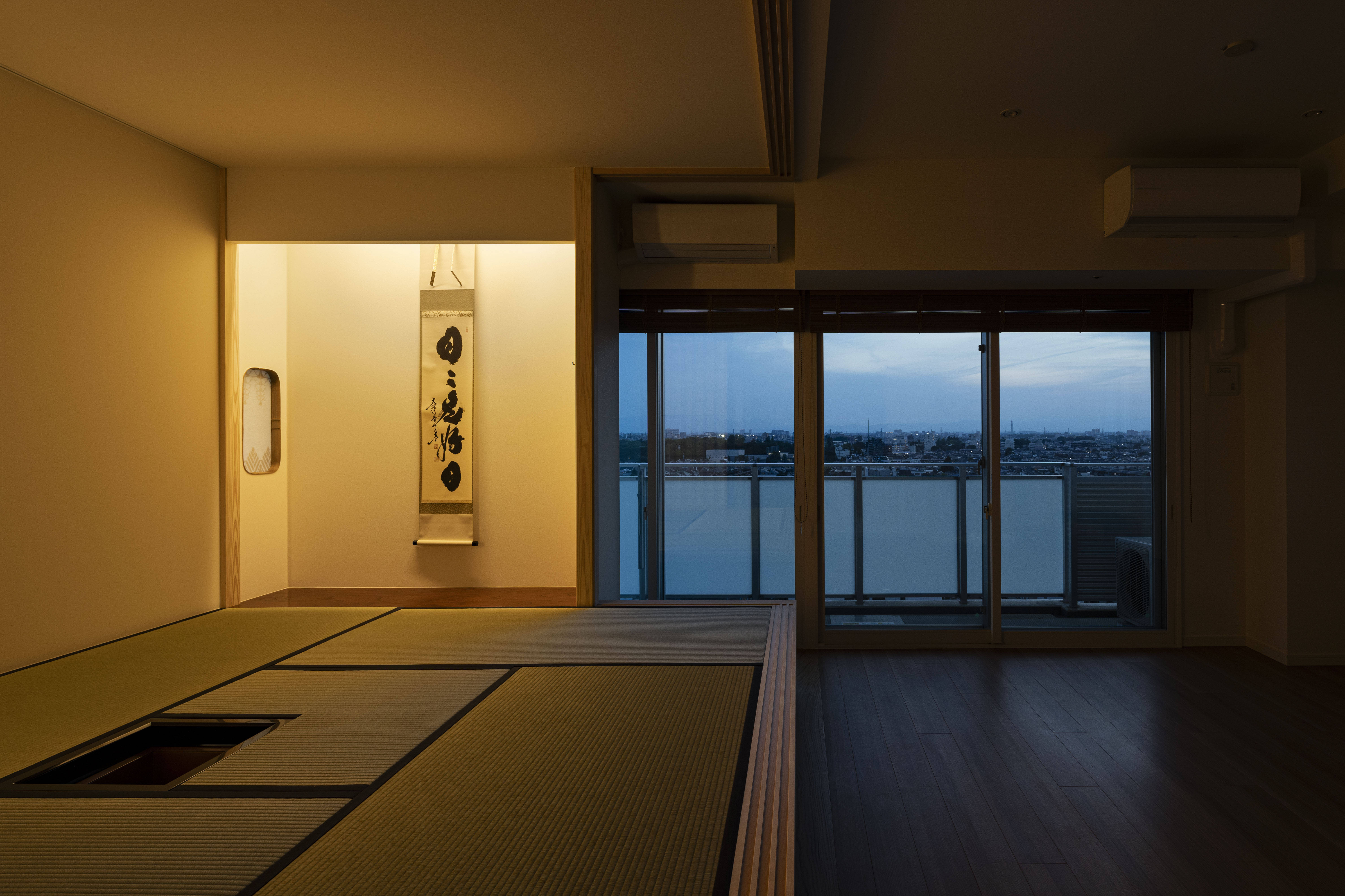 マンション住戸の中に江戸間で四畳半の茶室を設計した。施主は表千家で茶道に親しみ、自宅住み替えのタイミングで住戸内に茶室を設えることにした。求められたのは、お茶会を開ける茶室で、「真・行・草」の設えで言う「行」の設えでありつつ、比較的新しいマンションのインテリアとの調和である。