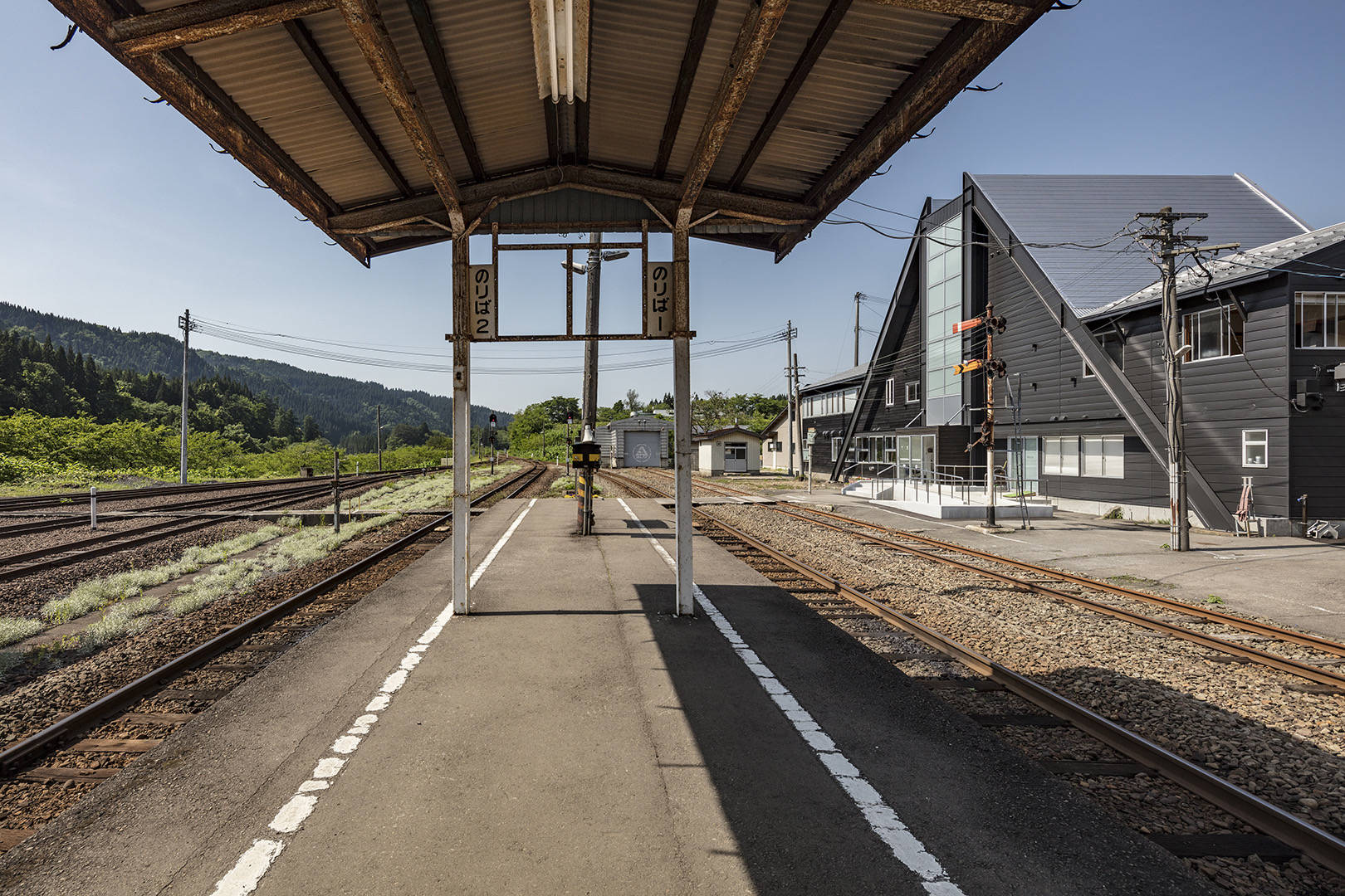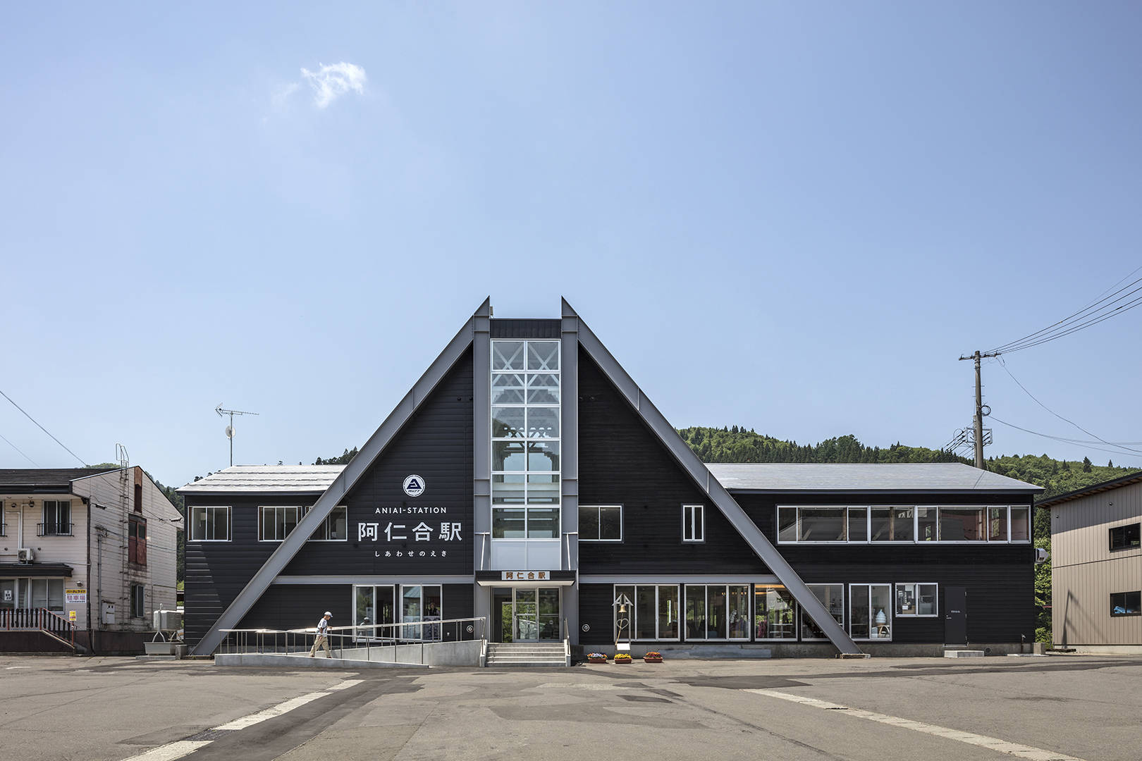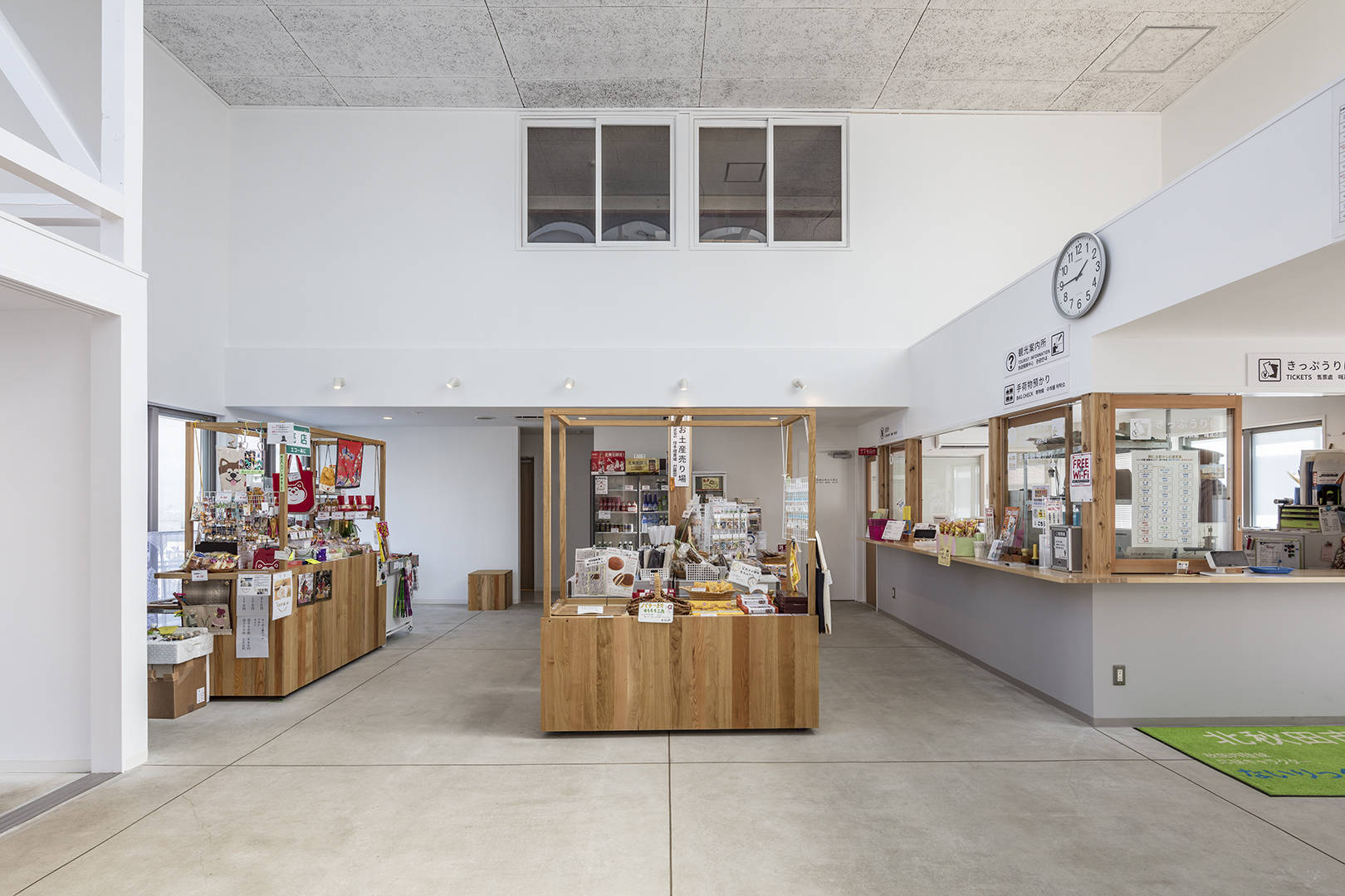 建築の基本的な性能(耐震・断熱)を現代に戻すことはもちろん、町の顔となっていた特徴的な三角の外観は残し、内部の2階の床を抜いて吹抜けを造り、駅舎内部でもそのシンボリックな三角屋根の気積を感じられる様にした。