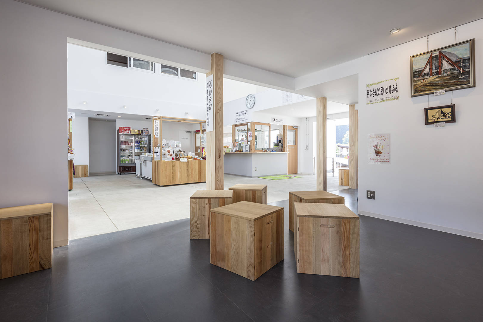 その傍で、住人がギャラリーを訪れたり食事を楽しんでいる。駅舎が単なる待機場所としてあるのではなく、外からの利用者と地域住民が触れ合うそんな文化のコミュニティが生まれる場として機能させたかった。