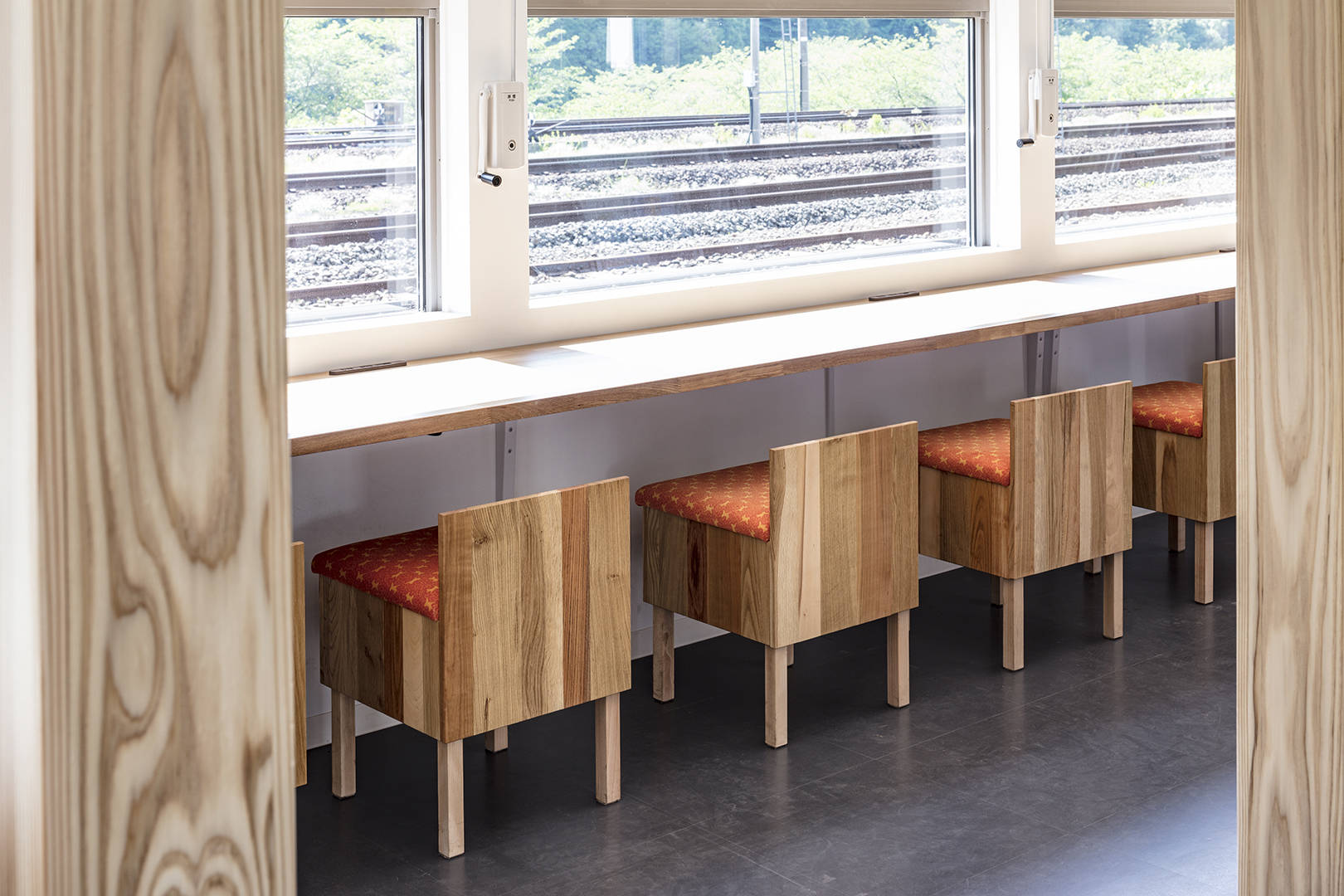 1階は1/3を地元のお土産を中心としたショップに、1/3は待合と交流スペース、残り1/3はギャラリーとこの地域でも人気の洋食レストランを計画した。客席から内陸線が見え、トレインビューカウンターを用意した。ここは地域の数少ない外食ができる場にもなっている。