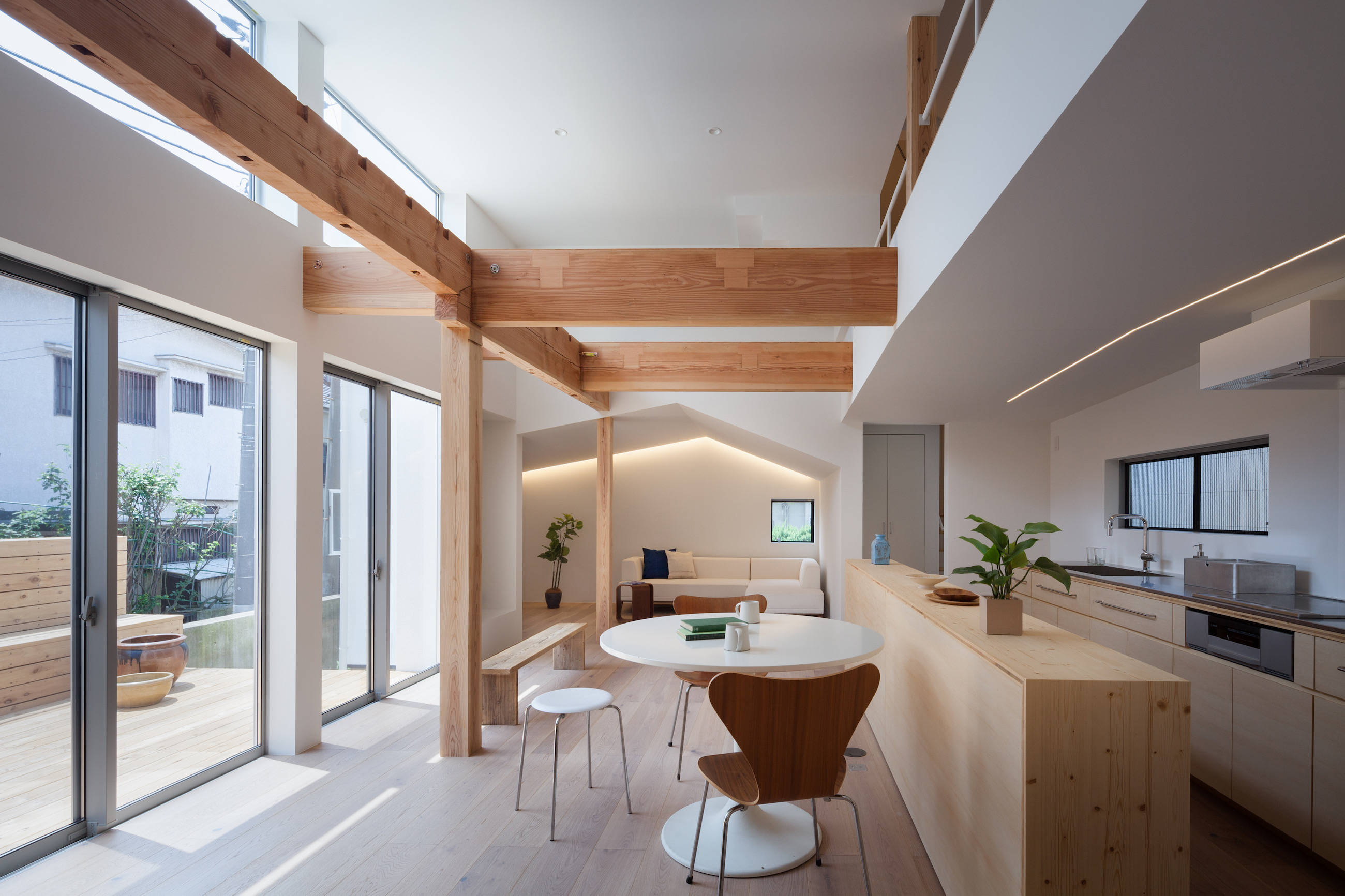 また、既存の屋根は切妻屋根の連続で構成されていて、周辺の住宅と同じように連なって街並みを形成していました。住宅の多くは、内部で屋根型を感じることはありません。