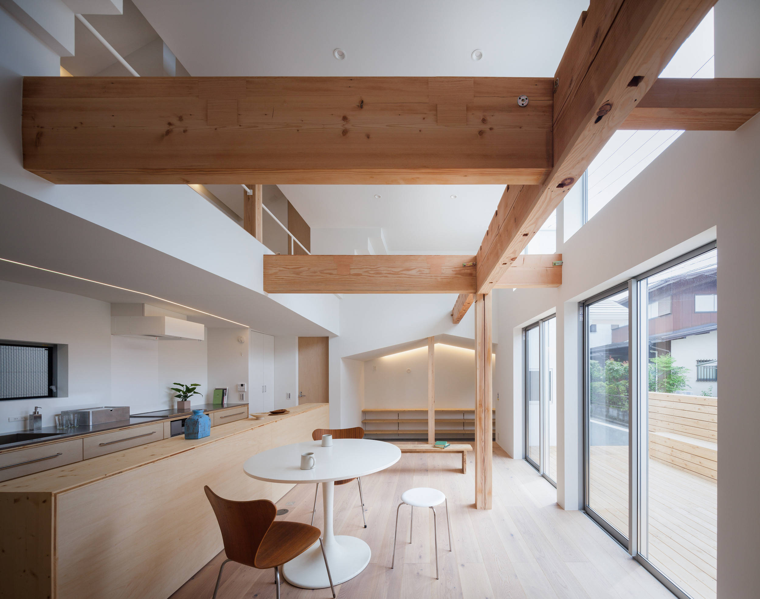 計画は、既存の住宅の2階に使われていない小屋裏のスペースがあったので、2階の床の一部を持ち上げました。結果、1階の天井の高さは、既存の小屋裏分高くなります。