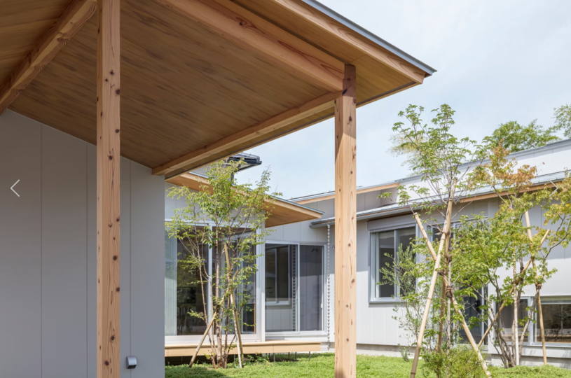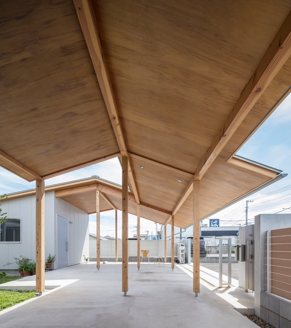 全体構成は共用エントランスとしてのピロティから、中庭を中心に各部屋を数珠つなぎに配置している。諸室が雁行しながら中庭を囲うことで、中庭には大きな庭と小さな庭のような特性が生まれ、住戸同士は直接見合わず、部屋に応答した小さな庭を望むことで、なんとなく互いの気配を感じ、「間接的に見守り合う住まい方」が生まれることを目指した。 「開かれた中庭」によって少し公共的な装いを持つ住宅が、変わりゆく社会や将来的な家族構成・用途の変化を受け入れ、街の風景とともに未来へと住み継いでもらえる家となることを期待している。