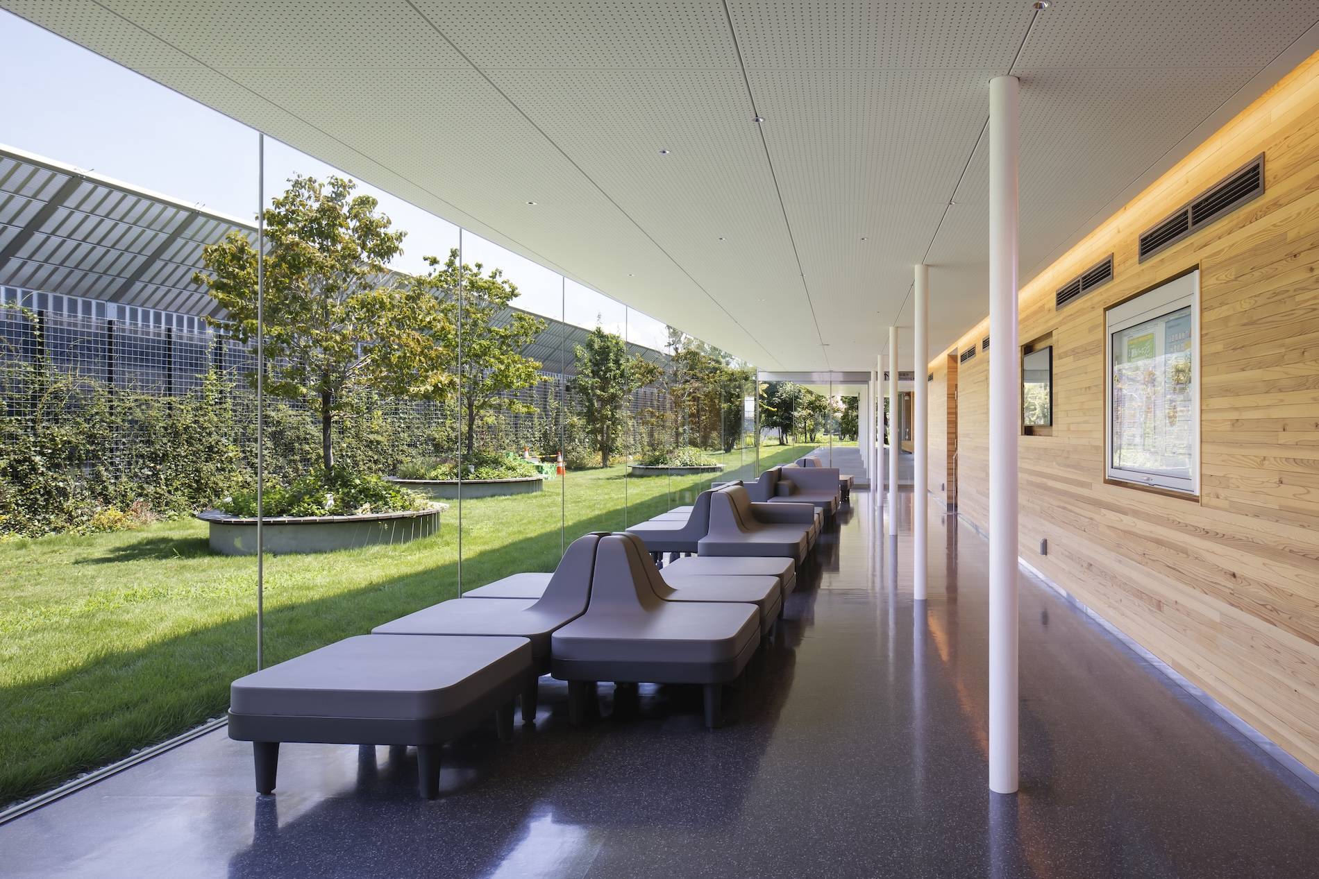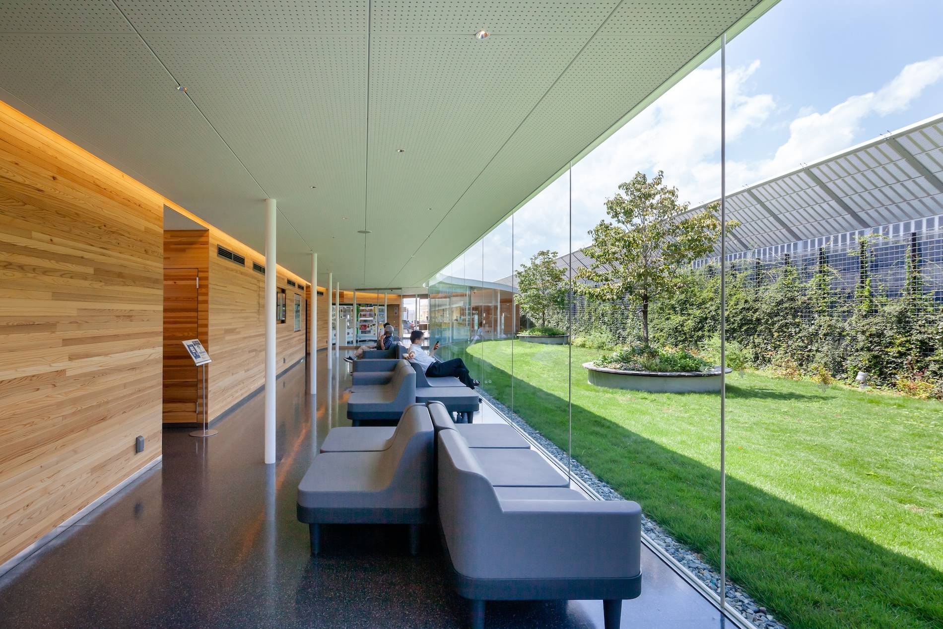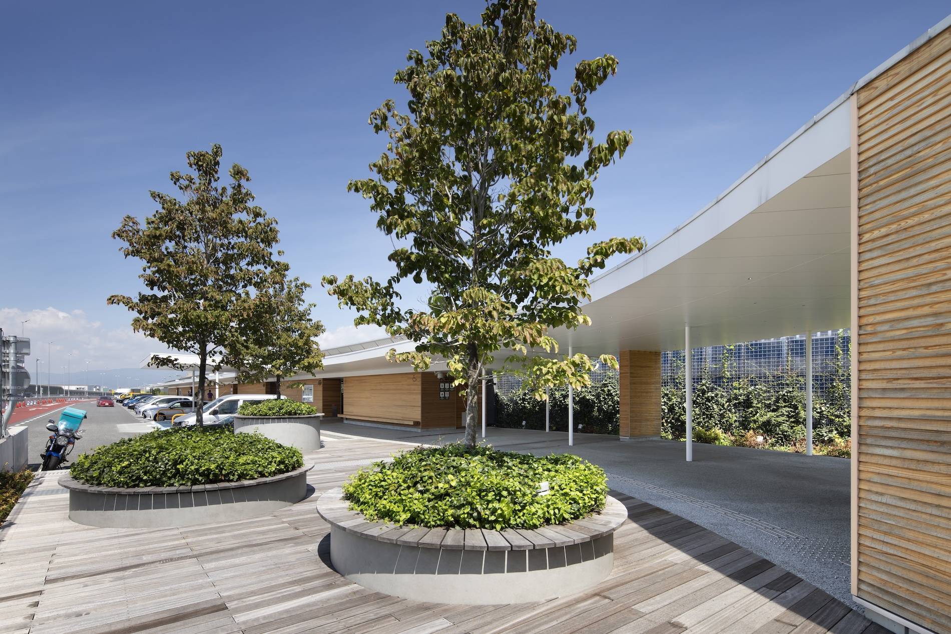 既存の遮音壁と遮音機能を備えた休憩所の間は、高速道路をずっとエンジンとタイヤのノイズを聞き続けてきたドライバーにとって静かにリラックスできる緑豊かで開放的な広場になっている。