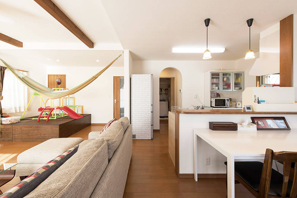 リビングは奥様のご要望で、折り上げ天井の化粧梁やハンモックを設置。お子様ものびのびと遊べ、創造性を育む空間に。