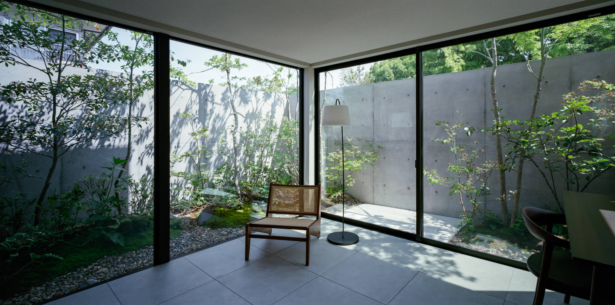 下りた空間では、植栽に囲まれ、目線の高さに植栽があり、