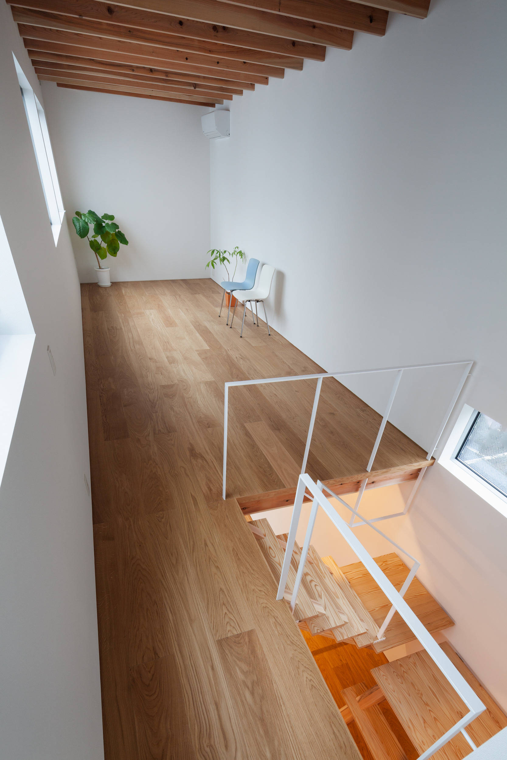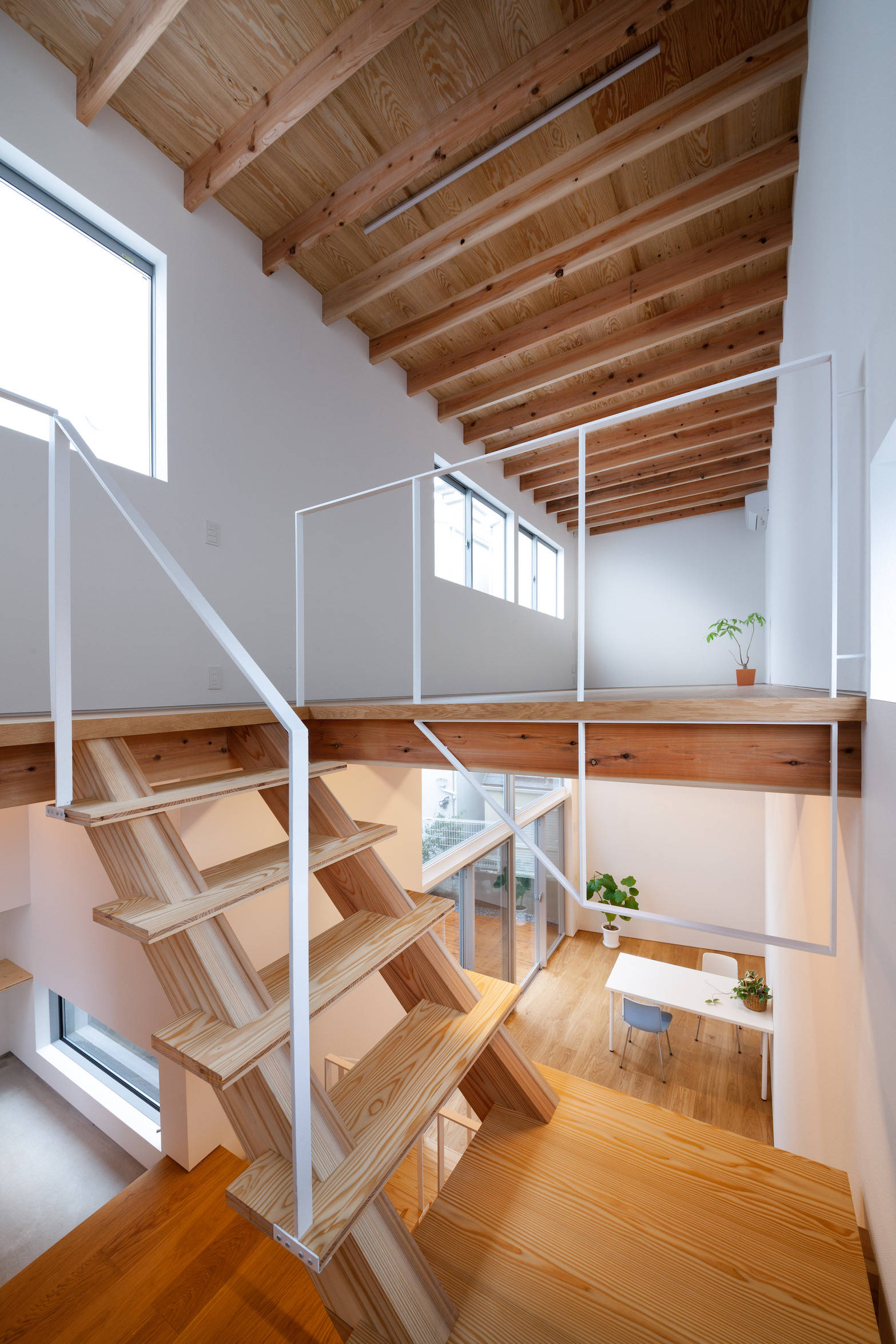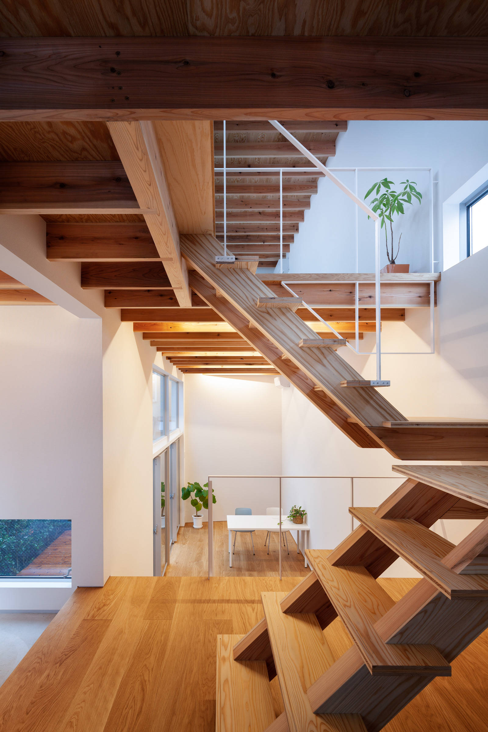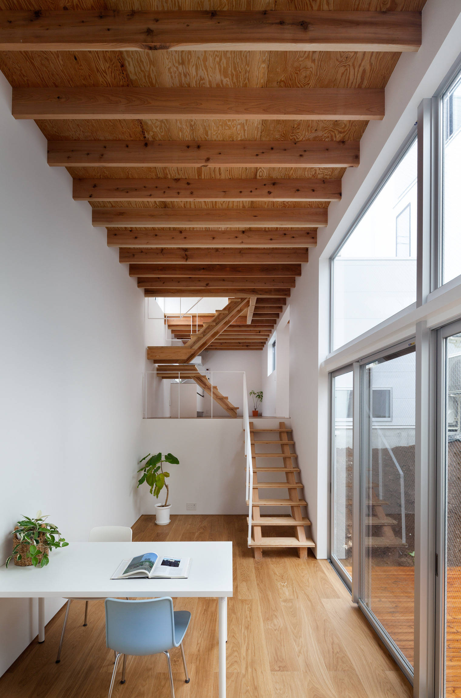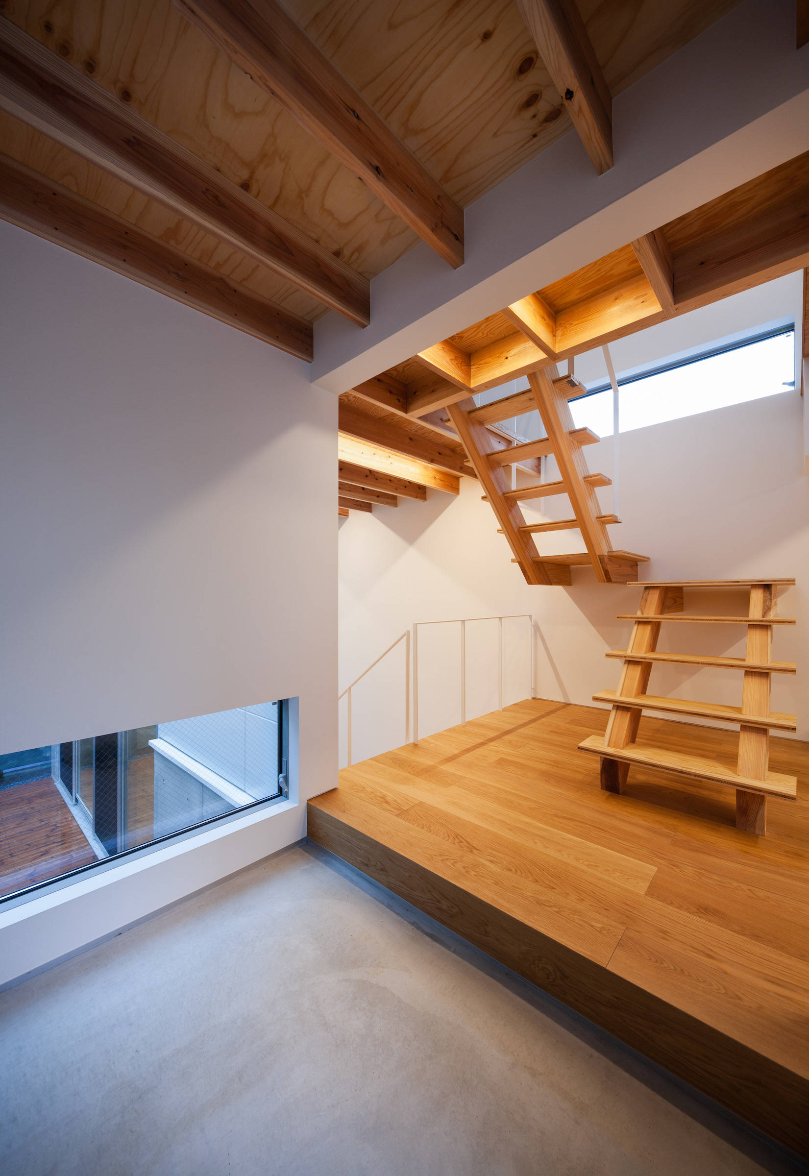 ちょうど敷地のレベルが変わるところに階段を配し、空間のボリュウムを変換する極めて単純で明快な断面計画です。敷地奥のユーティリティスペースは外部のデッキテラスとつながり、落ち着いた仕事場としても、リビングとしても活用できます。