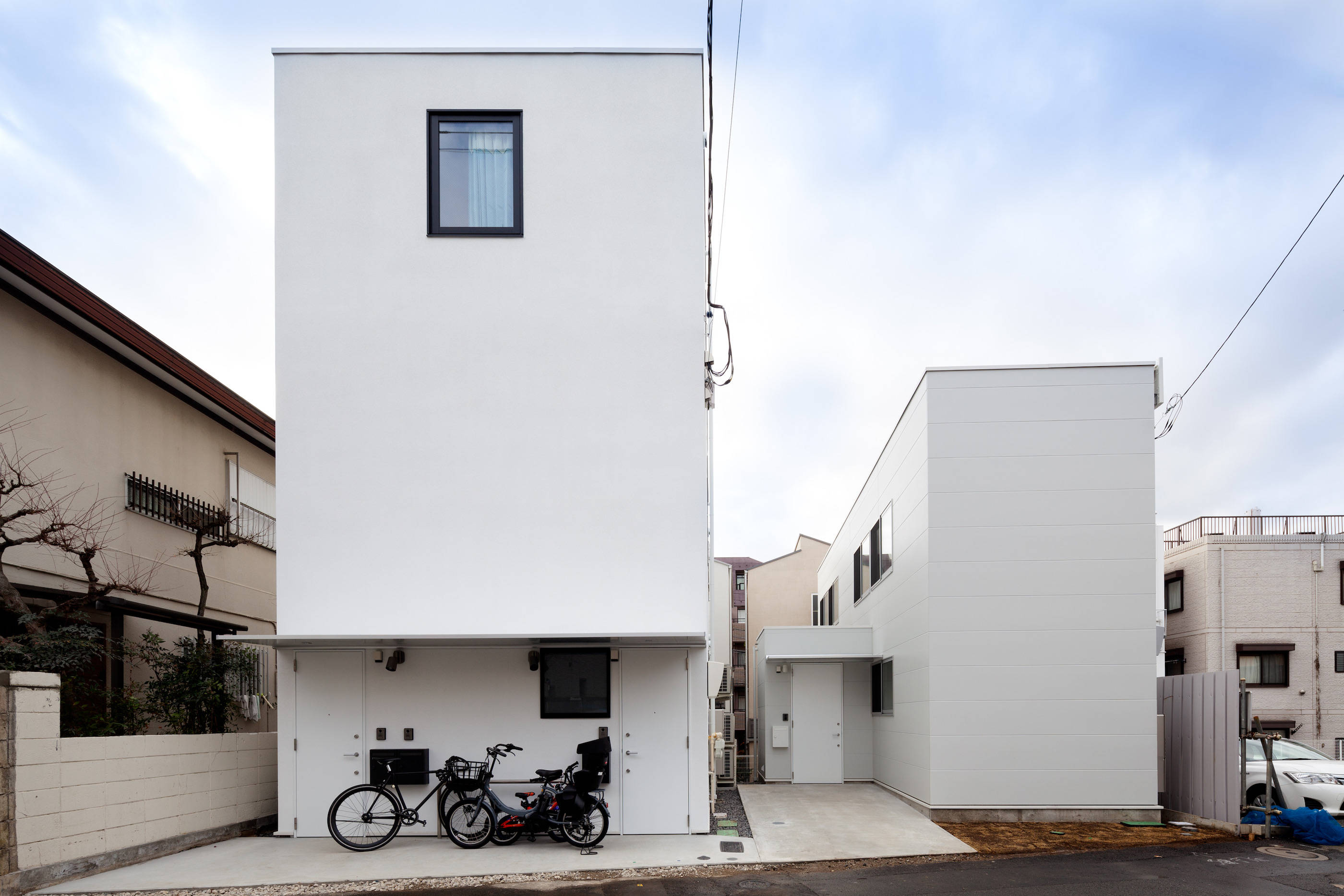 敷地奥は道路側より1.8mほどレベルが落ちています。敷地高低差を利用しながら、天井の高いユーティリティスペースを確保し、ソーホースタイルの賃貸住宅を念頭に計画を進めました。仮にソーホーとして貸し出さなくても、最低限の水廻りを用意して住宅として機能できれば、将来を少し長く対応できると思います。