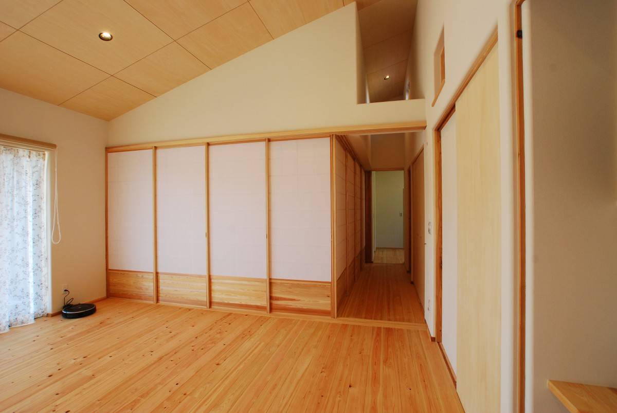 南側の広々とした庭を囲む、L型の平屋の住宅。 リビングと子...