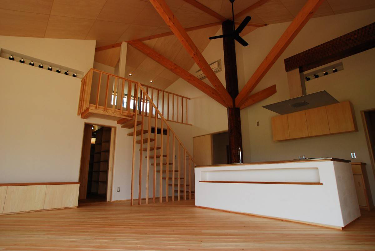 木組み・土壁の家 五角形の屋根は傘のような木組みが印象的...