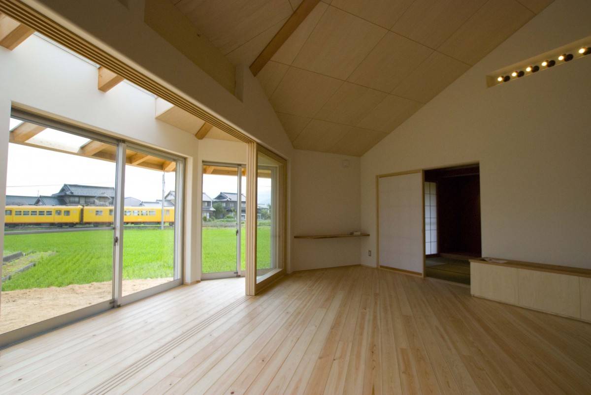 南側の広々とした庭を囲む、L型の平屋の住宅。 リビングと子...
