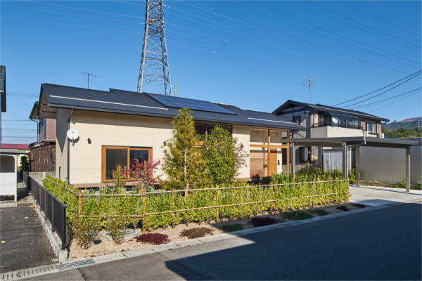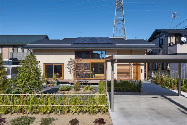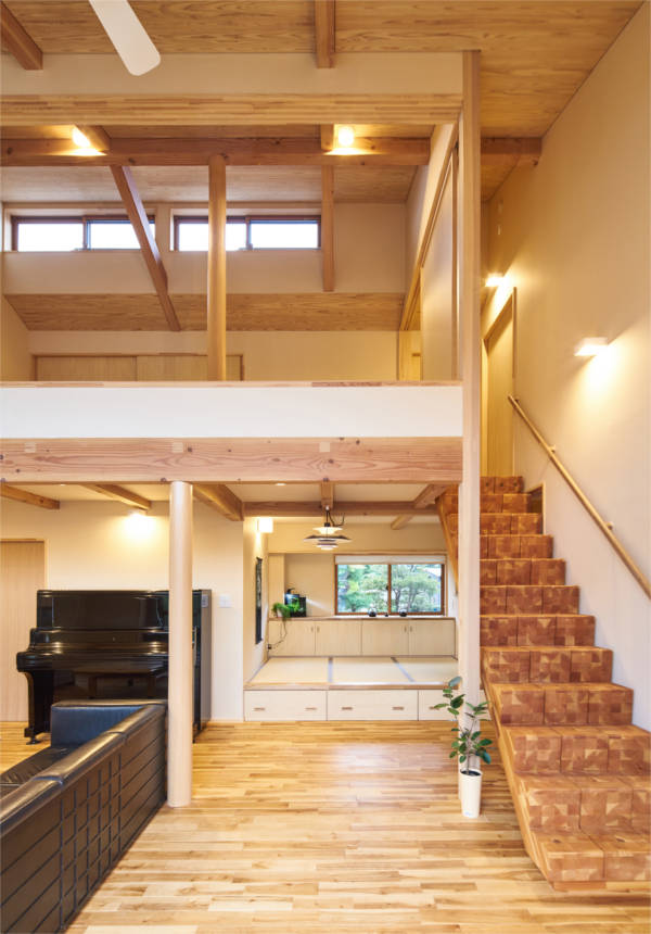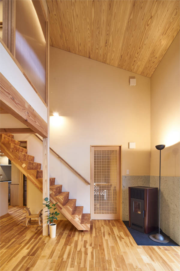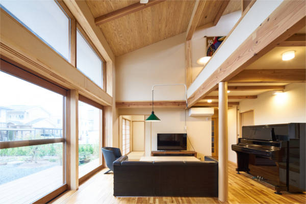 部屋の出入口は全て引戸で壁の中に収納できます。普段は引戸を全て開けておくことでワンルームになり家族の気配を感じながら安心して暮らせる空間構成です。吹抜けに面した大きな窓から光がたくさん入るので明るく、気持ちのよい風も通り抜けます。時代の移り変わりとともに家族構成が変わっても柔軟に対応できる住宅です。