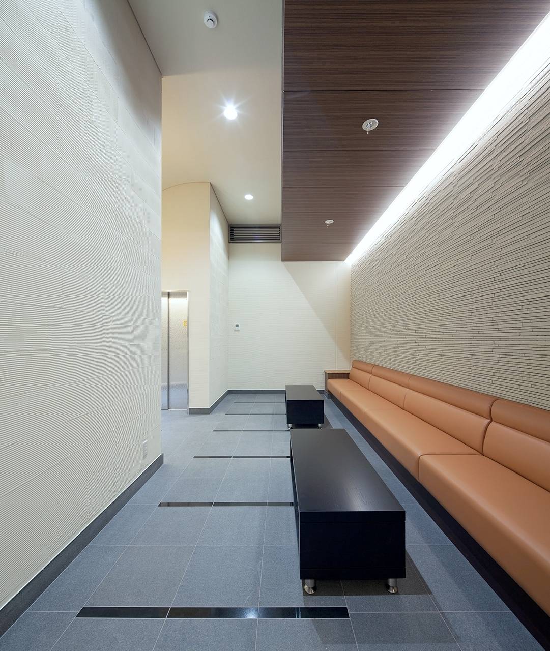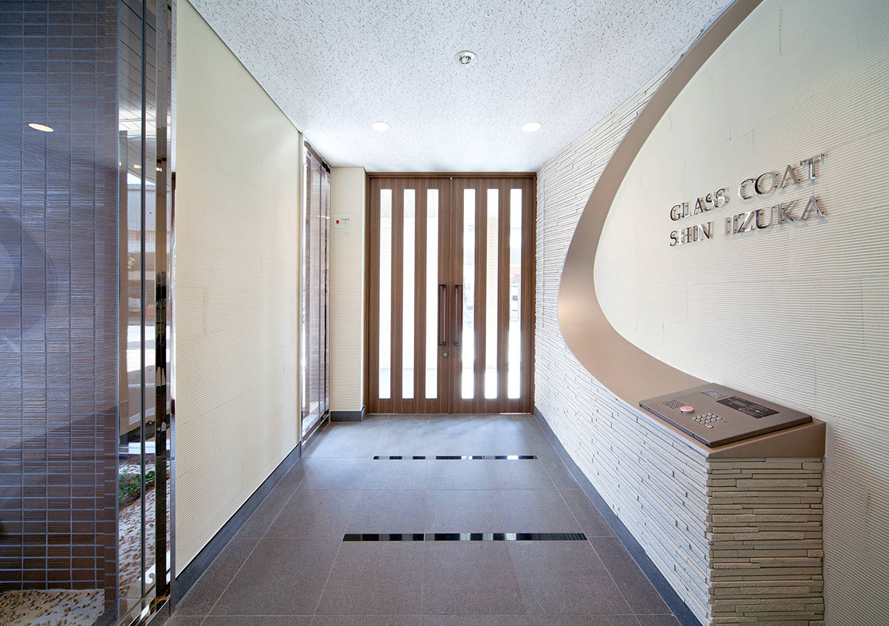 エントランスは道路境界ギリギリまで突出し、背の高い建物でありながら、しっかりと地面に根を張ったような安定感を与え、バルコニー手すりにはガラスを採用し、軽快感を感じさせるようにしています。建物の色はあまり奇抜なものとはせず、アースカラーを用い、地域の建物の色遣いになじむようにしています。内部には広いエントランスホールを設け、ホテルのロビーにいるような演出をしています。居室は梁型をデザインに利用した折上天井とし空間の豊かさを与えてます