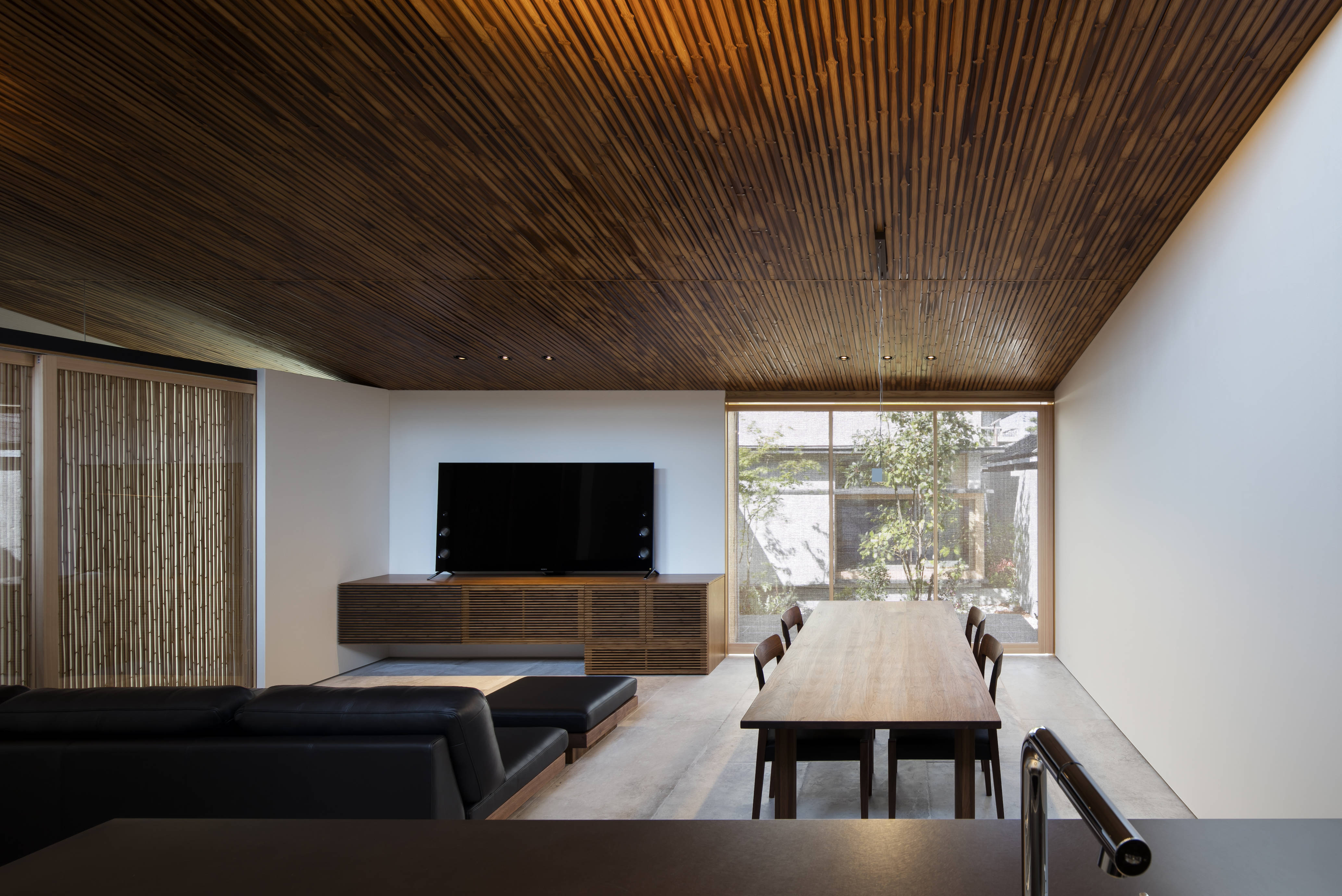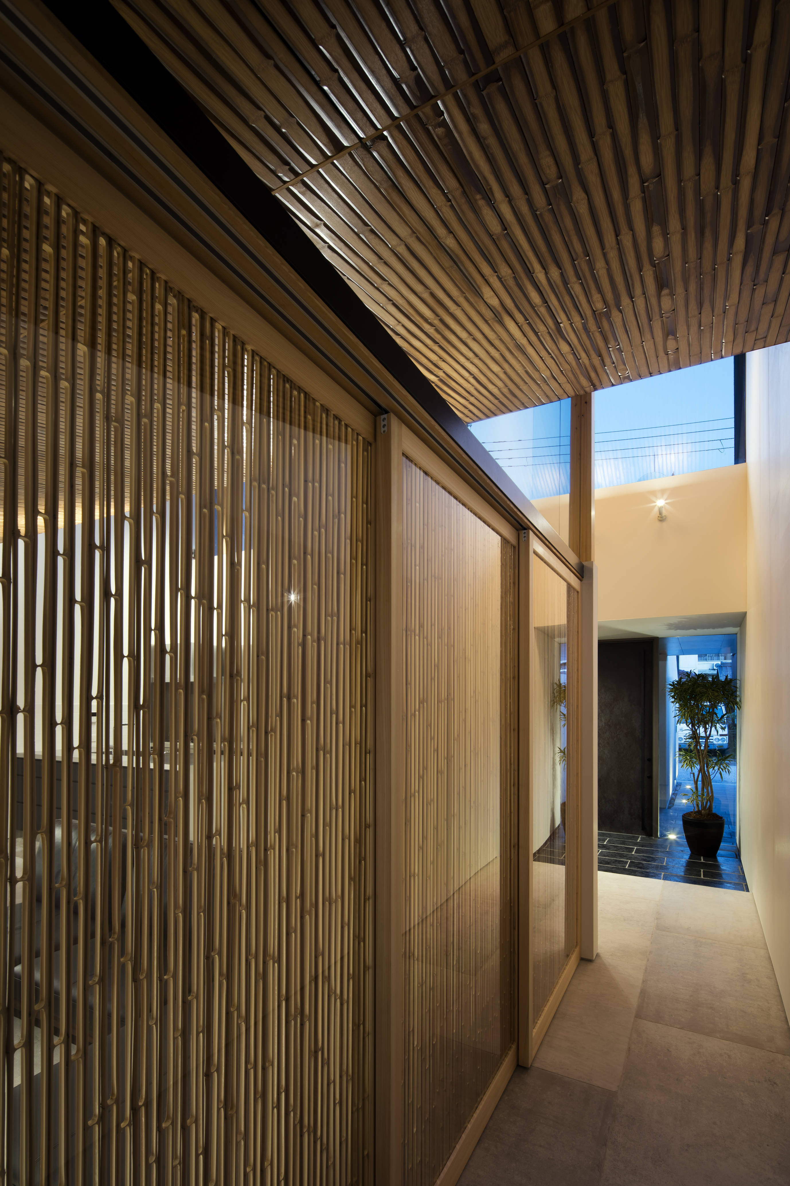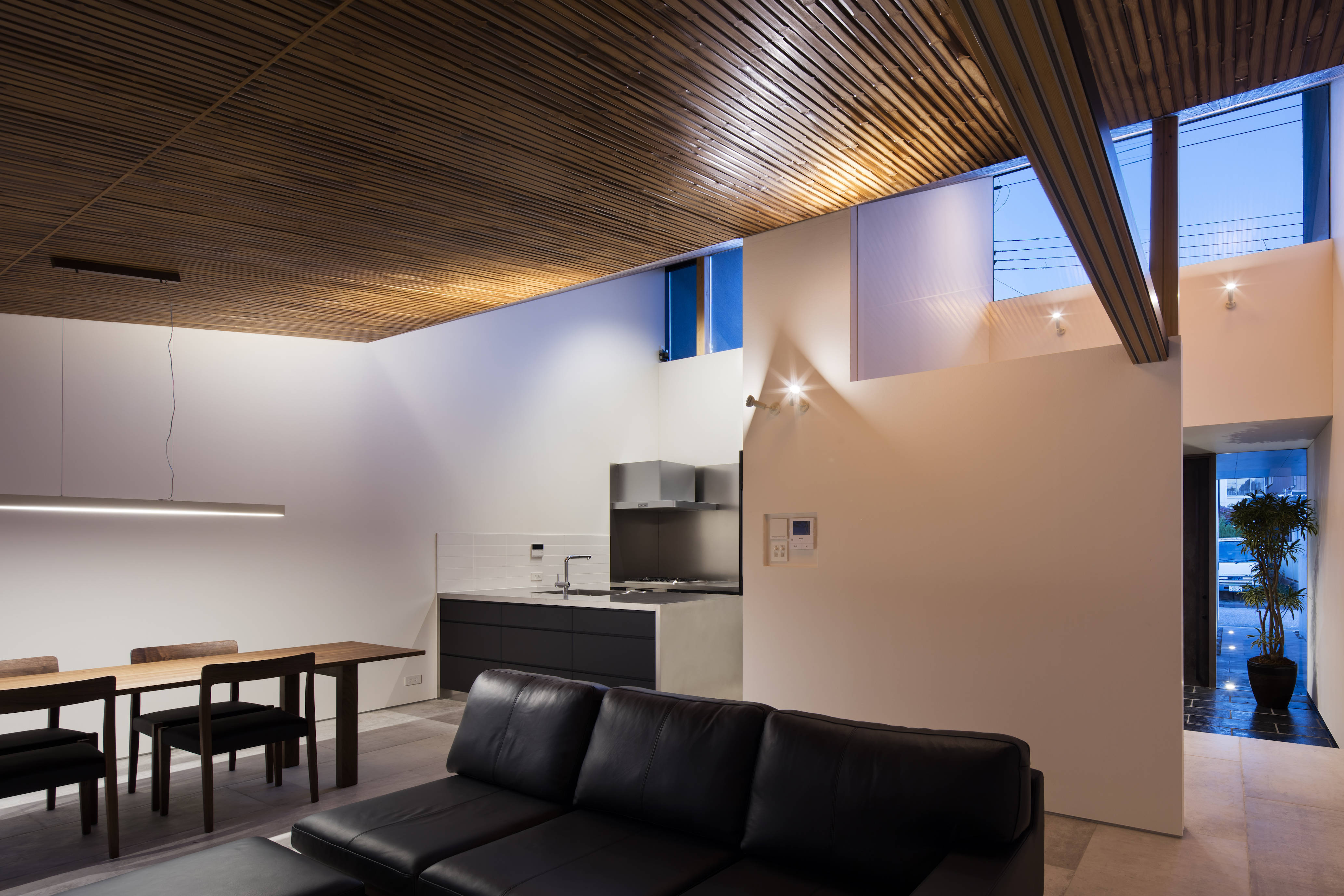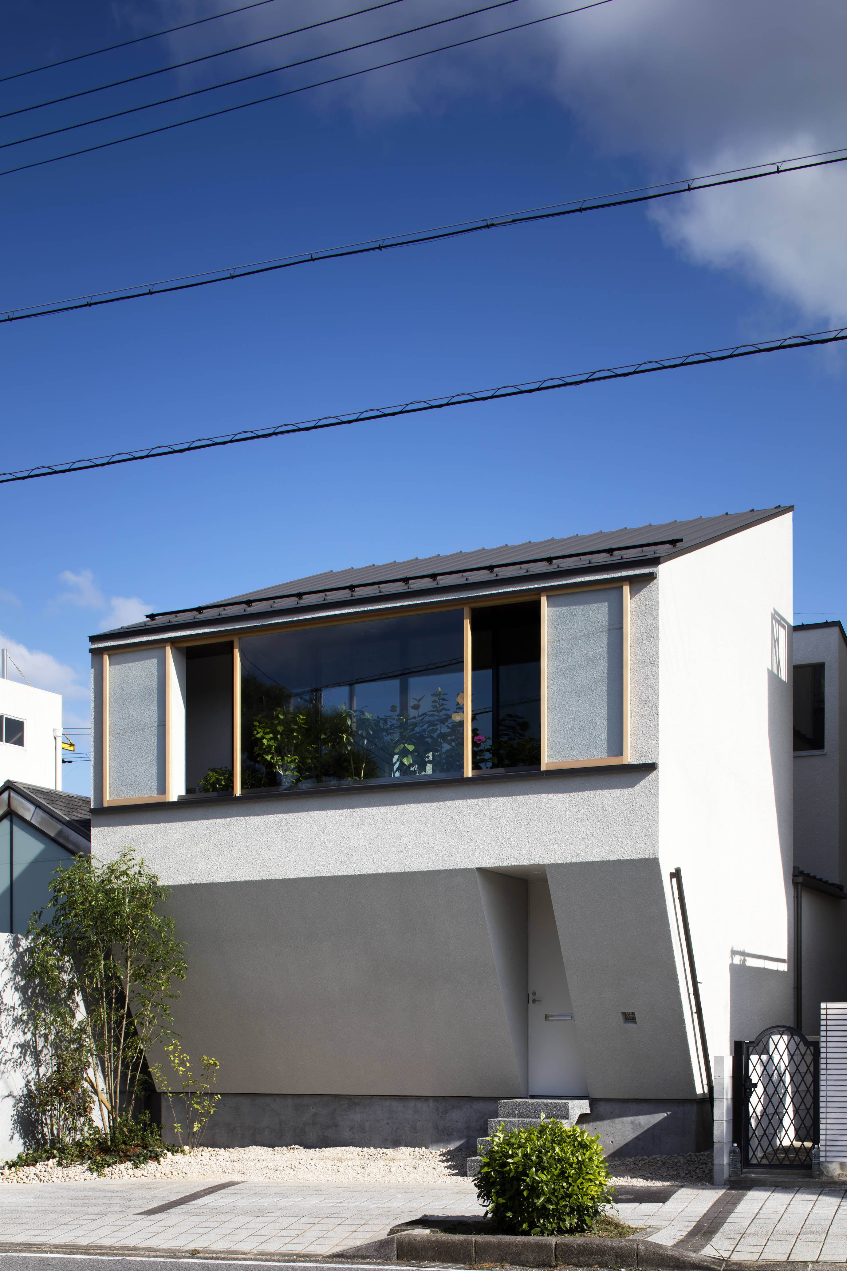 彦根城南東の護国神社を臨み、県道と市道に短辺で接する縦長の敷地に、”静かな生活”が求められました。両隣の建物が立て込んだ環境の中、隣地境界側に沿って外壁を配置し、その内部に大小の建物ボリュームと中庭が交互に連続する空間構成としました。 2つの空間が交互に連続する事で、縦長の敷地の奥行き感が強調されると同時に、喧騒も徐々に減衰され、静かな空間が得られました。またそれぞれの空間を繋ぐ、奥行き方向に貫通する”路地”は、時にリビングと一体となり空間を拡張し、時に路地自身が幅を広げ中庭との関係性を深めるなど、単なる通過動線を超えた空間体験をもたらしています。