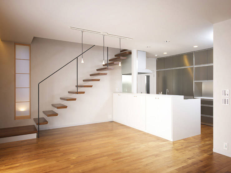 「木の良さを生かしたい」「友人たちと演奏を楽しみたい」「将来は2世帯住も可としたい」が施主の希望でした。住まい方や機能について多くのケーススタディをした上で、ミニコンサートホールを魅力的空間とするために木造折板構造を採用しました。平面は折り曲げると強くなります。折り紙を折る様に屋根を折り曲げて地上まで下ろす事で、木でやさしく包み込まれたミニコンサートの空間を作りました。ミニコンサートホールは開口部を小さくした別世界ですが、LDKは大きな開口部で庭とのつながりを大切にしています。開口部にはいくつかの建具が隠されています。キッチンからも庭が見え、階段はオブジェの様に空間のアクセントとなっています。