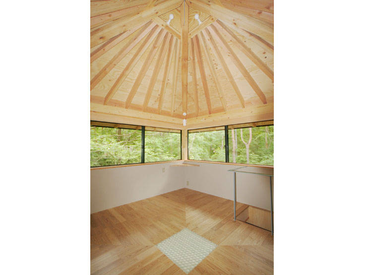 北軽井沢の林の中にある山の家。林の中では地上と2階で見える景色が全く違う。冬季の使用を考え吹抜きを造らず1階と2階に居場所をつくることがテーマであった。平屋のLDKと水廻りをワンルームで造り、2階建ての塔を貫入させるという構成を考えた。LDKは幅7.2mのガラススクリーンで木の幹が連なる林の広がりを見る。塔の2階は4方向に窓があり木々の梢の中に浮く空間である。塔によって柔らかく分節された東側に水廻りがあり、浴室は建具を全開して露天風呂風に楽しめる。塔の1階は主要な耐震壁なのでポツ窓とし天井照明も同様なデザインで穴倉風にしている。湿度が高いので既製の機器を組み合わせて全館乾燥システムを工夫した。