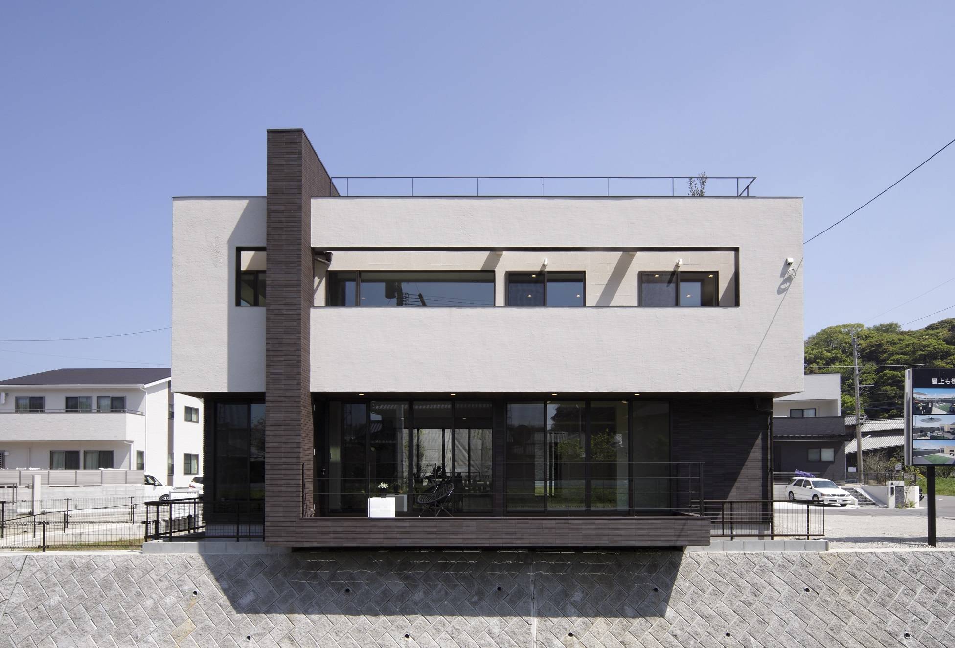 ブラウンの箱の上にベージュの箱を載せ、スッキリと整った印象を与えています。 建物の色をアースカラーにする事と、こげ茶のタイルの帯をぐるっと南北ににまわす事で、 デザインが軽くならず、趣のある邸宅感を得られるようにしています。 モデルハウスとして、どの方向から見られても良いように、「裏面」の無いデザインとしています。