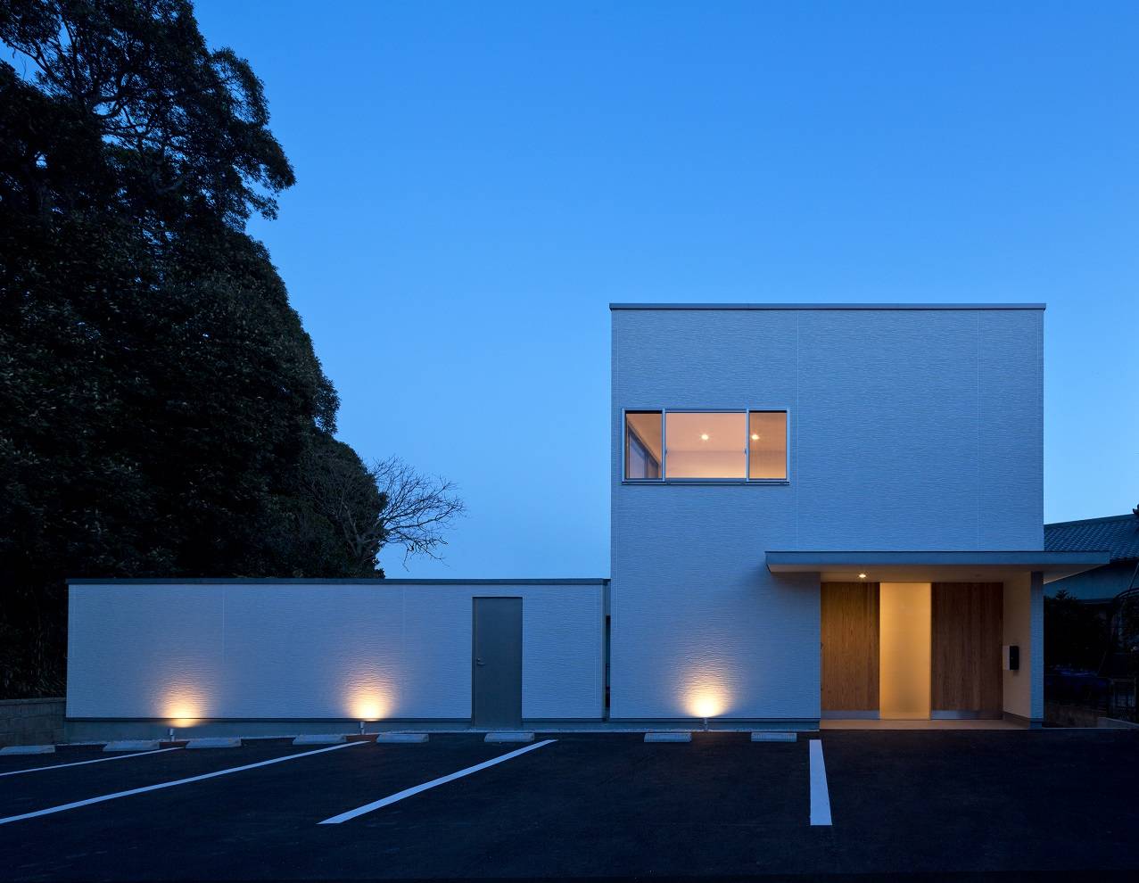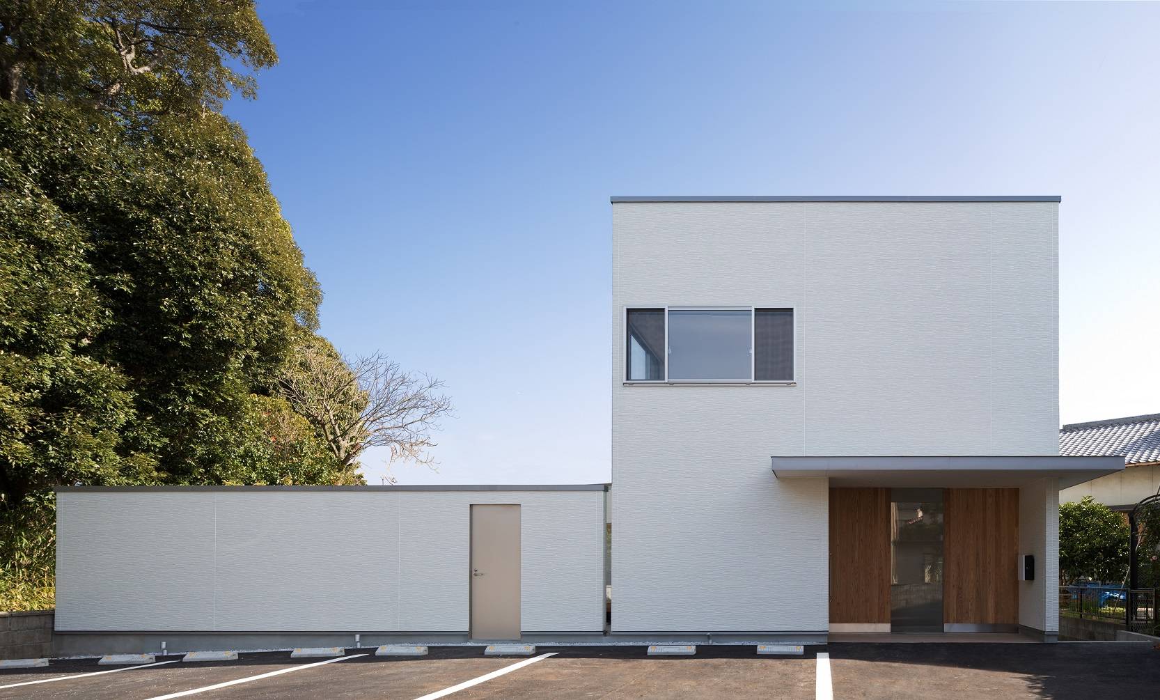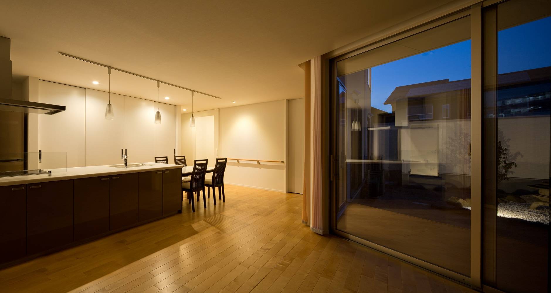 隣地の神社の森の緑を枯山水のある庭に導き、建物で受け止めるような配置にしました。駐車場から家の中に至る迄、一切の段差は無く、出来る限り車椅子などで自由に動き回ることが出来るようにしています。