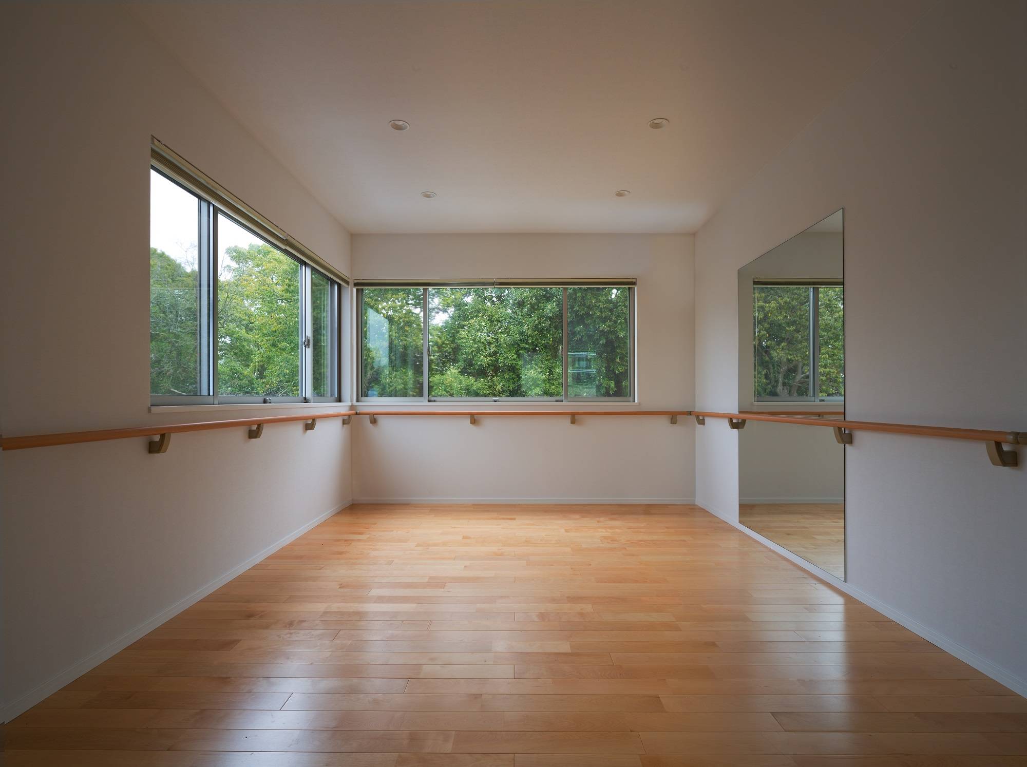 ご主人の寝室はLDKと繋げることで、声を掛ければすぐに家族が気付けるようにしています。さらに廊下からも出入り出来るようにし、最短の導線で玄関・トイレ・洗面所に行けるように工夫しています。エレベーターで行き来する2階には、神社の森を眺められる気持ちの良い場所にリハビリ室を設けました。