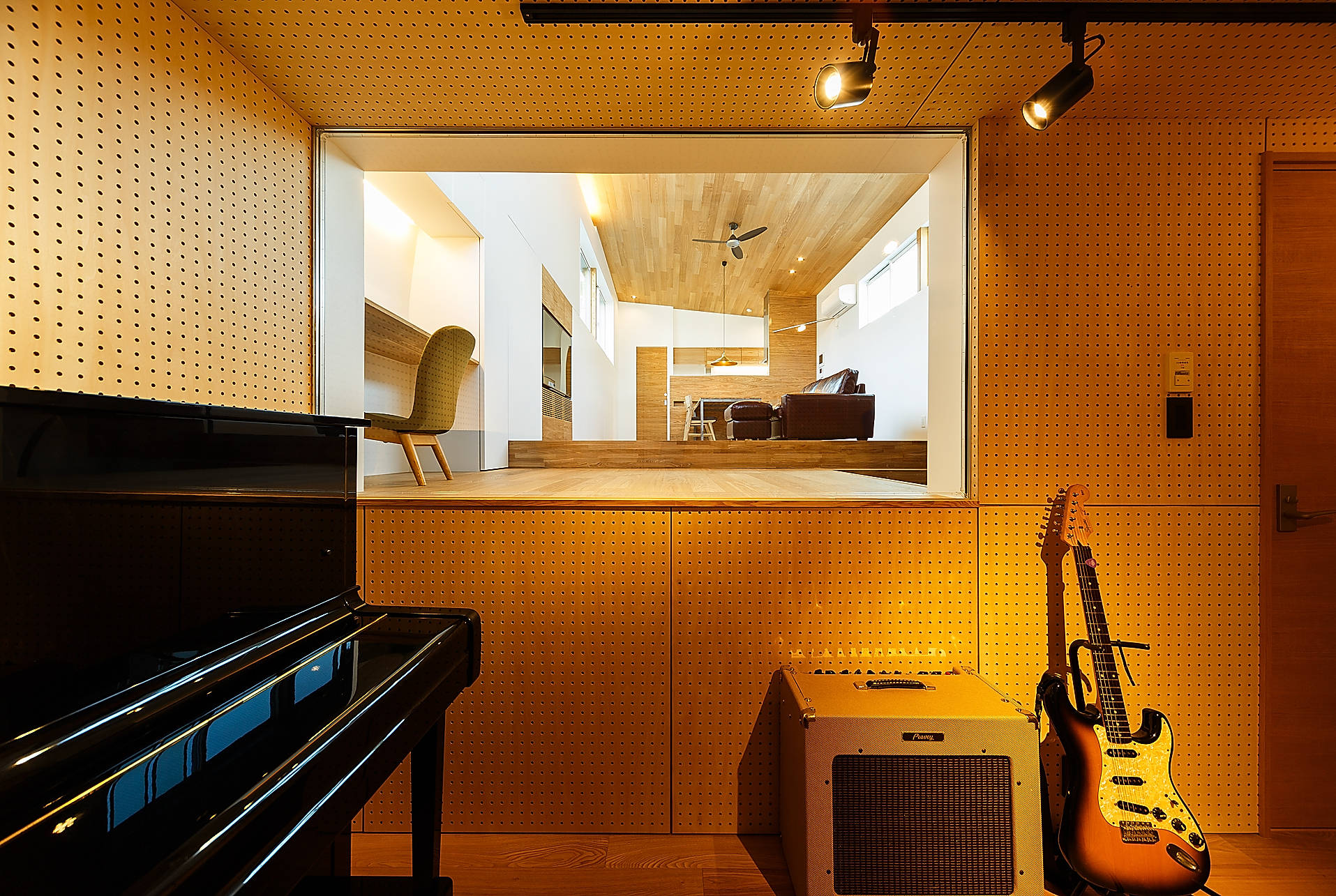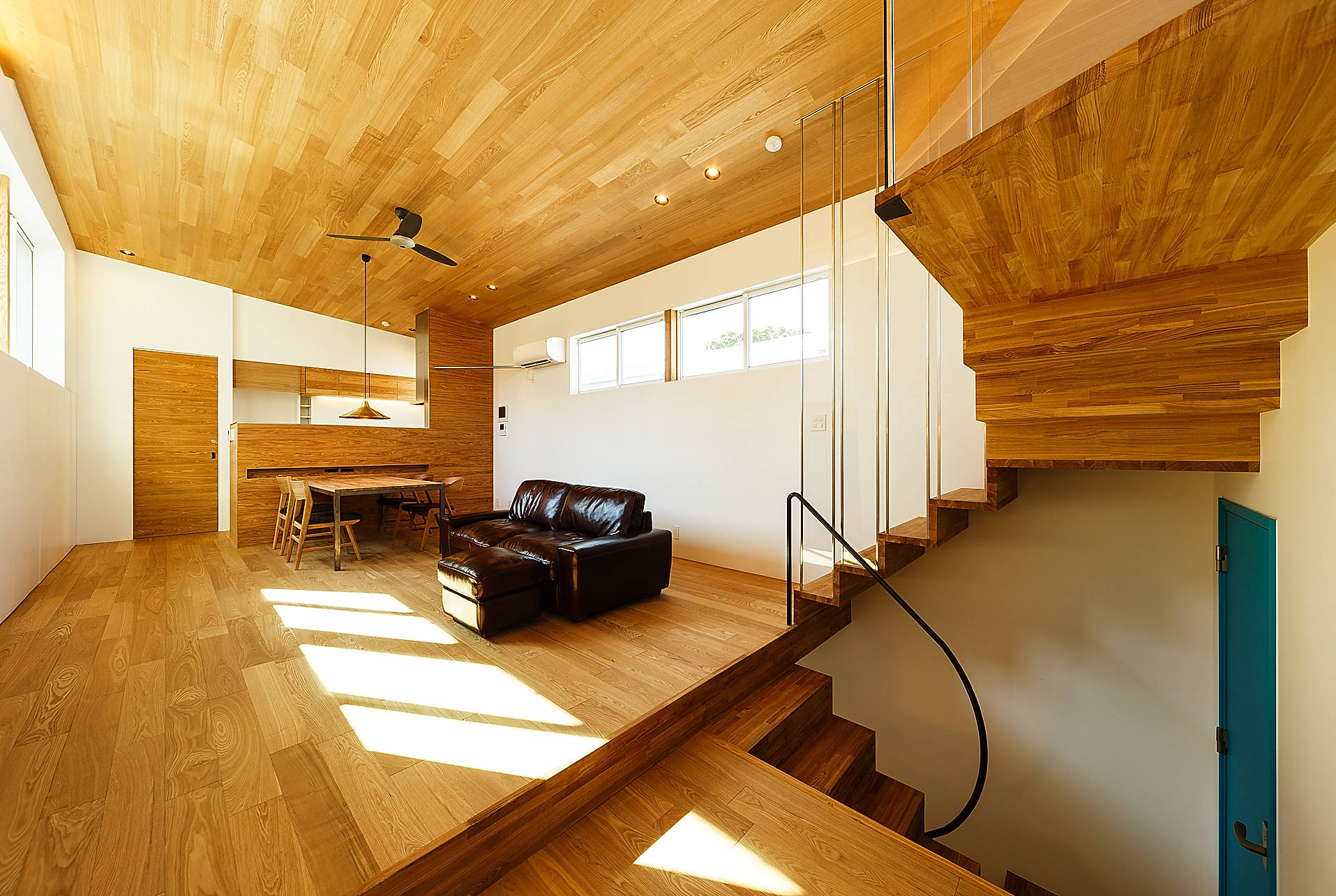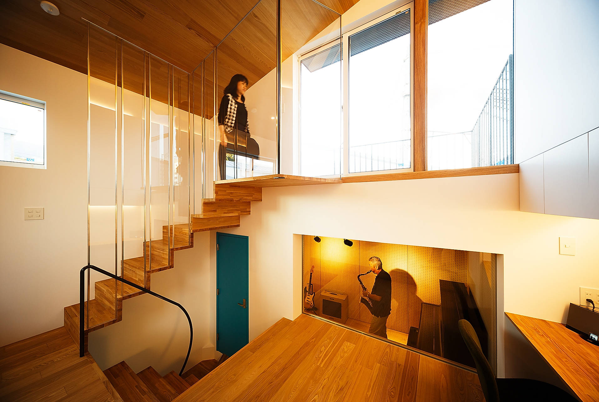 住宅密集地ながら明るく快適な居住空間とするため、高さ規制の厳しい環境での立体方向の縛りを道路・隣地へ及ぼす影響を天空率を計算をすることにより解き放ち、極限で納め、如何にもではないデザインとしました。 これにより趣味の音楽を防音室で演奏する様子をリビングでくつろぎながら伺えたり、持ち帰った仕事をしながら青空を感じられたり、まるで隣接する建物の存在を感じさせない立体レイアウトを実現しています。 さらに内部では随所へ持て余すほどの収納を確保し、柔らかな木目を包まれるように配置。家族とすっきり心地よく暮らせるこれらの配慮も、いつまでもそこに居たくなるような空間へと導いています。
